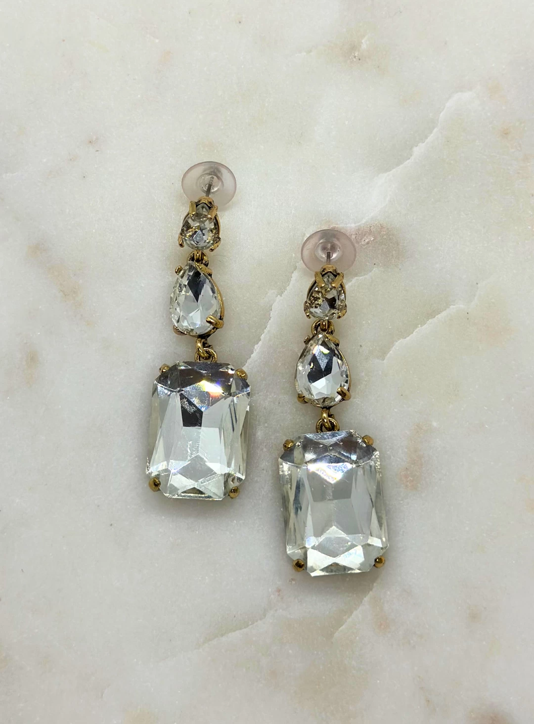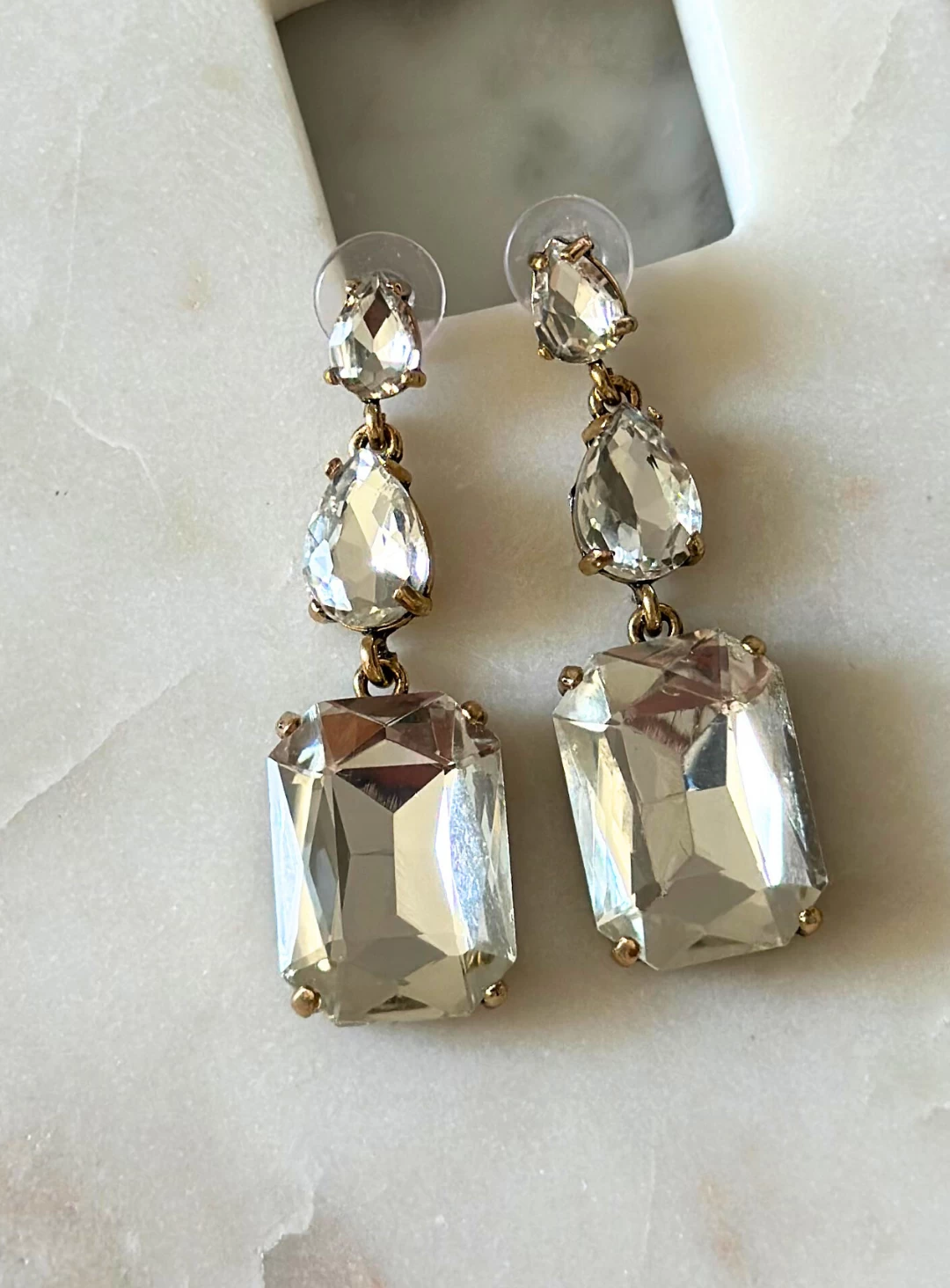 A gorgeous pair of geometric crystal drop earrings with a 3 tier pendant. A show stopper pair that would be perfect with any statement dress!