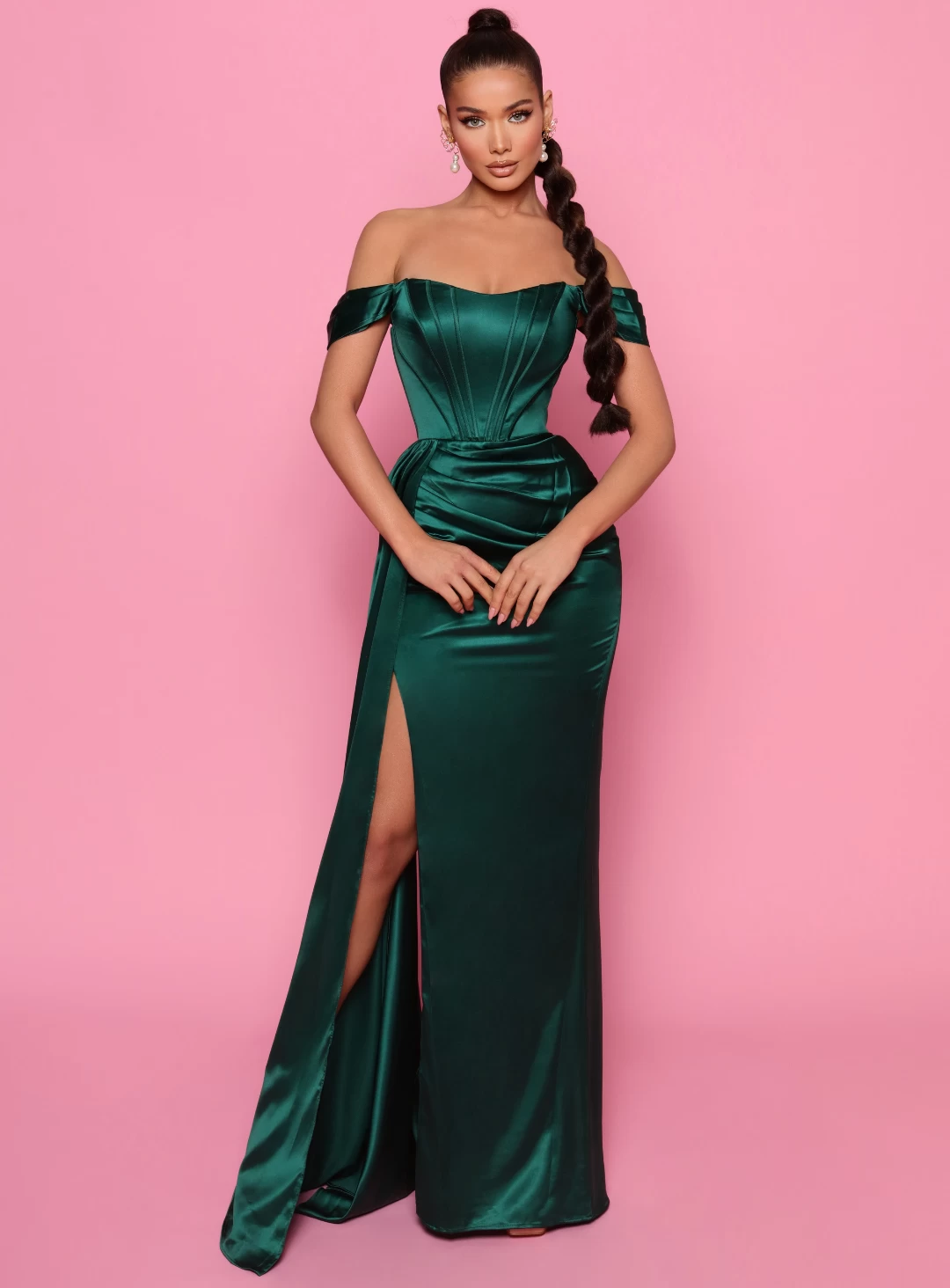 A gorgeous full length dress by Nicoletta NP185. An off shoulder style featuring a structured bodice, thigh high split and draped panel.