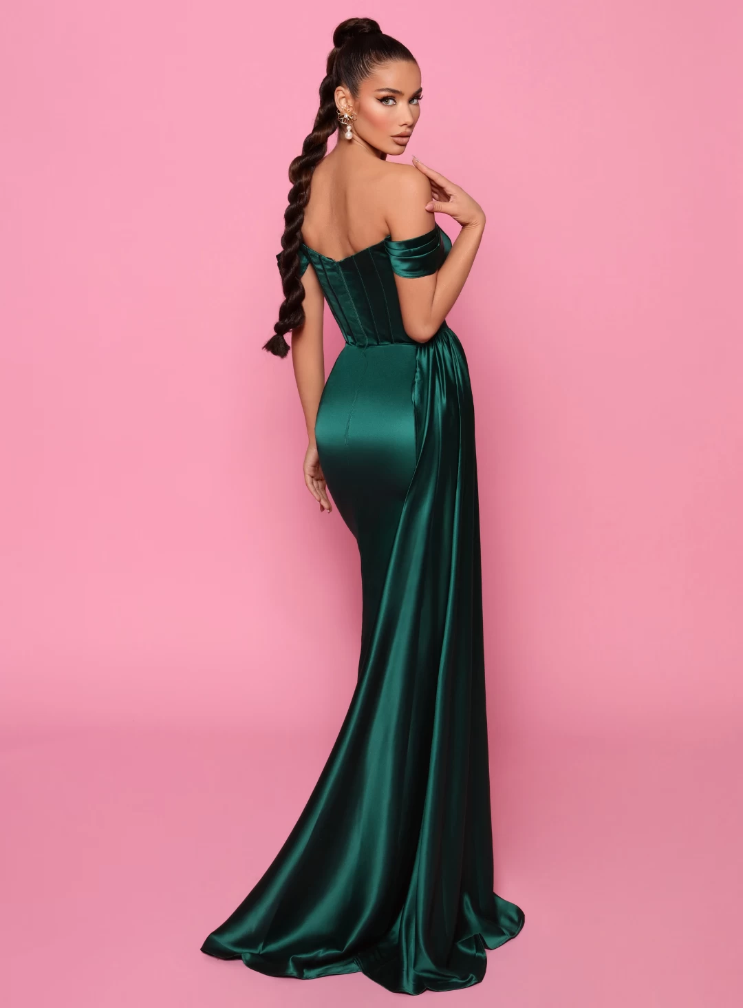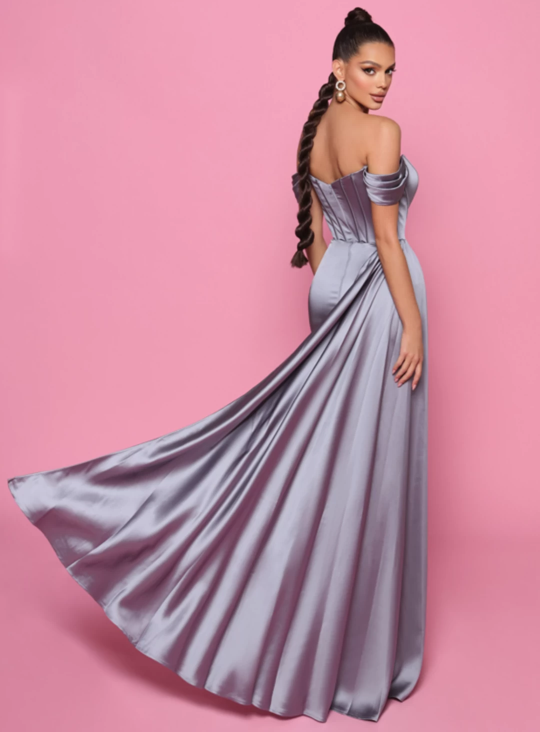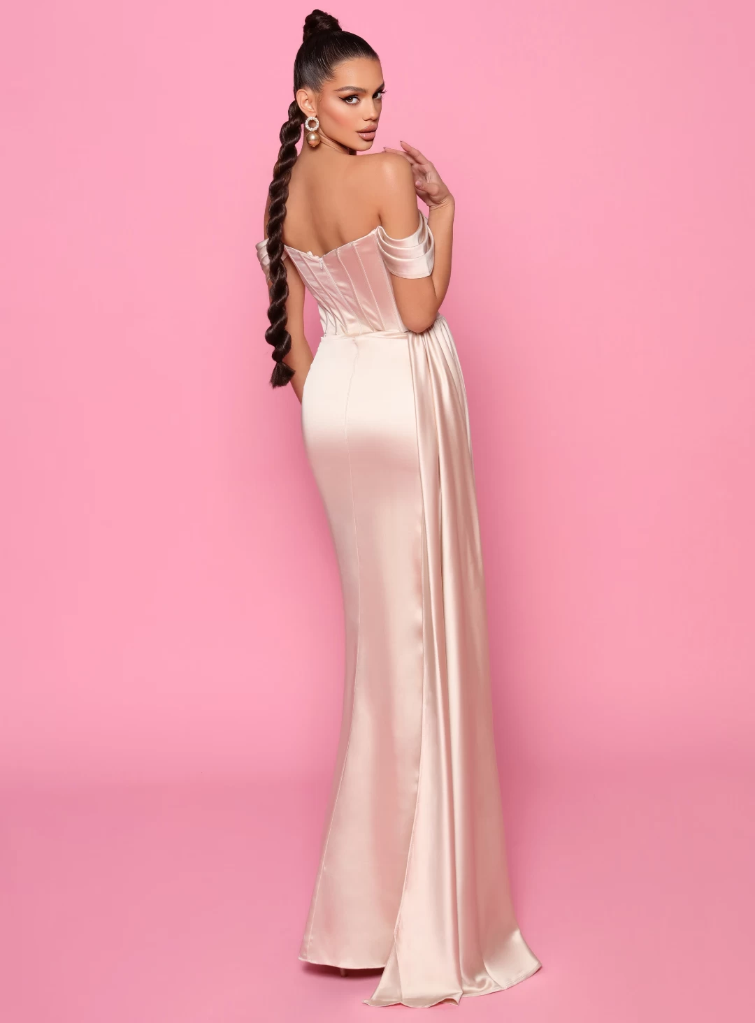 A gorgeous full length dress by Nicoletta NP185. An off shoulder style featuring a structured bodice, thigh high split and draped panel.