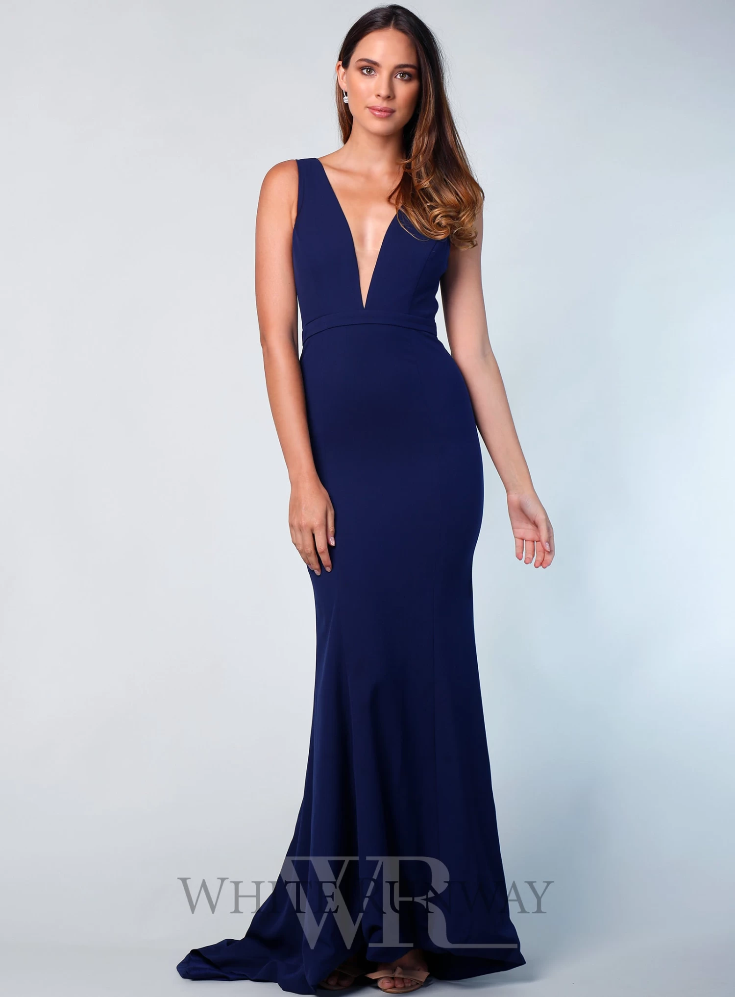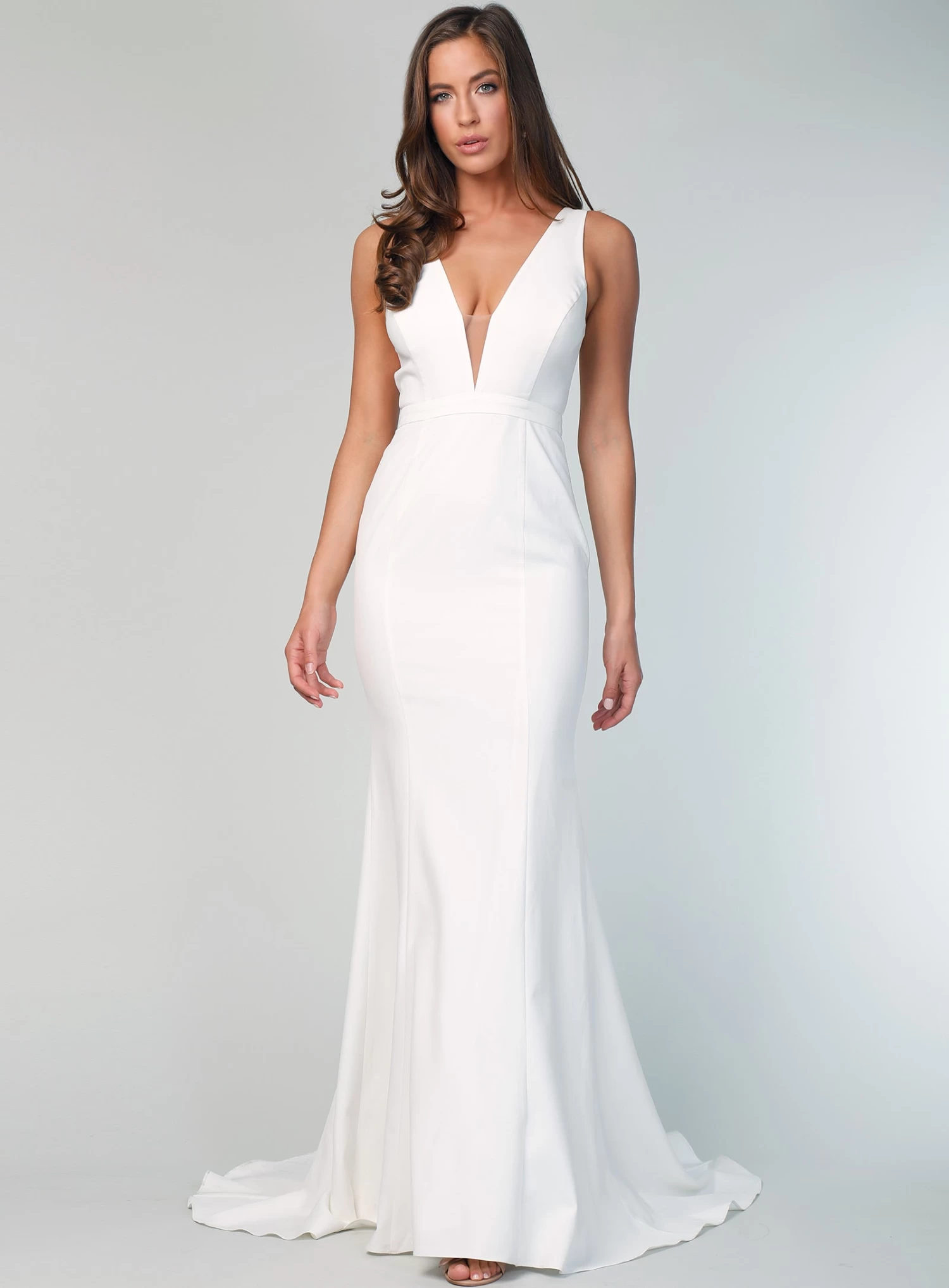 A stunning full length gown by Sofia Cali. A fitted style featuring a plunging v-neckline with mesh insert.