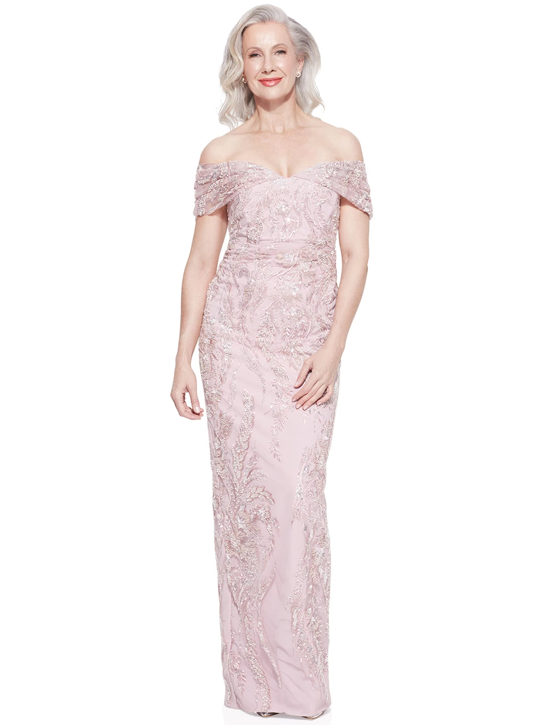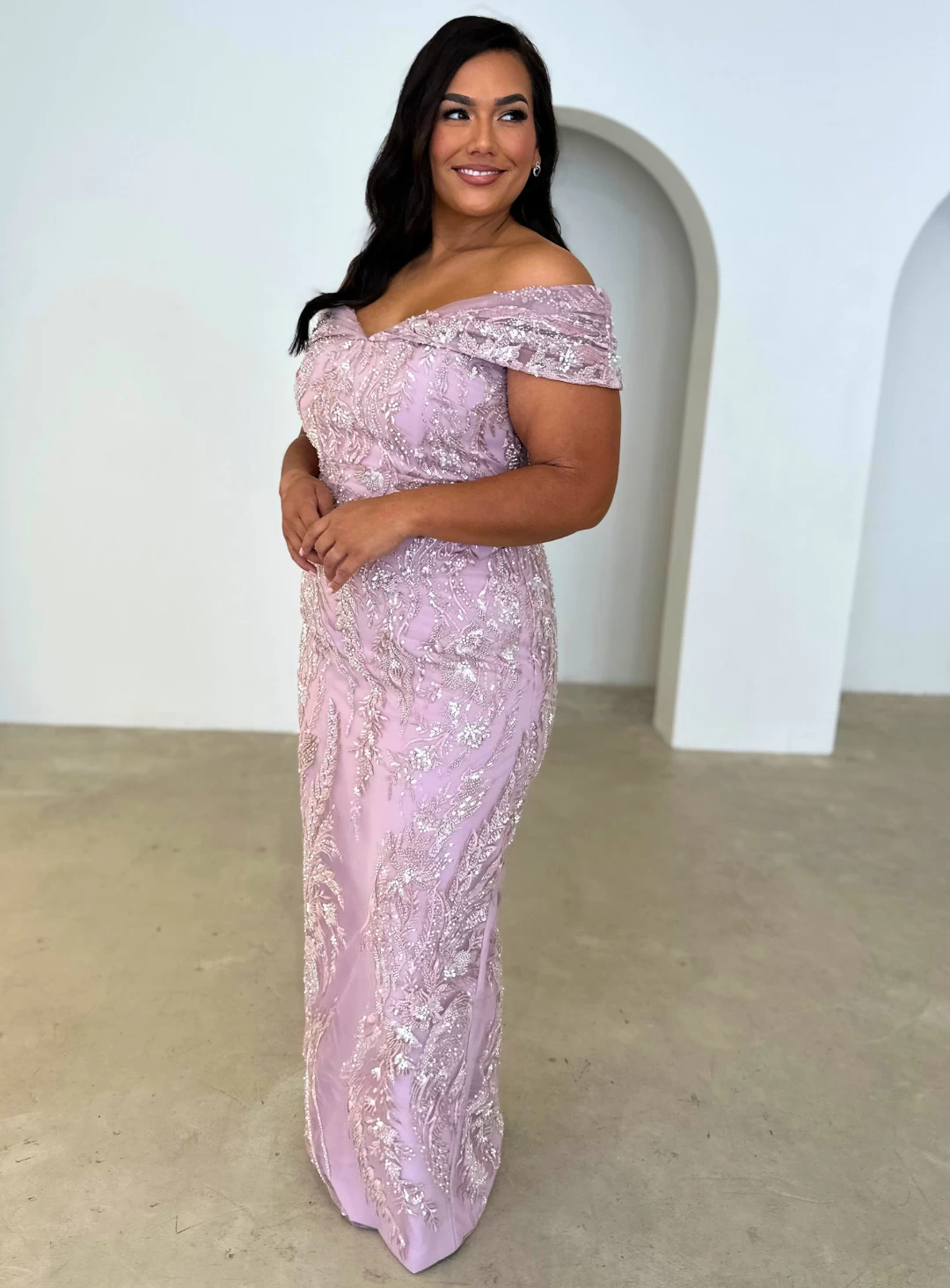 A gorgeous full length dress by Trellis Lane. Crafted from an elegant beaded fabric, this design features off shoulder cap sleeves, a pencil skirt and sweetheart neckline.