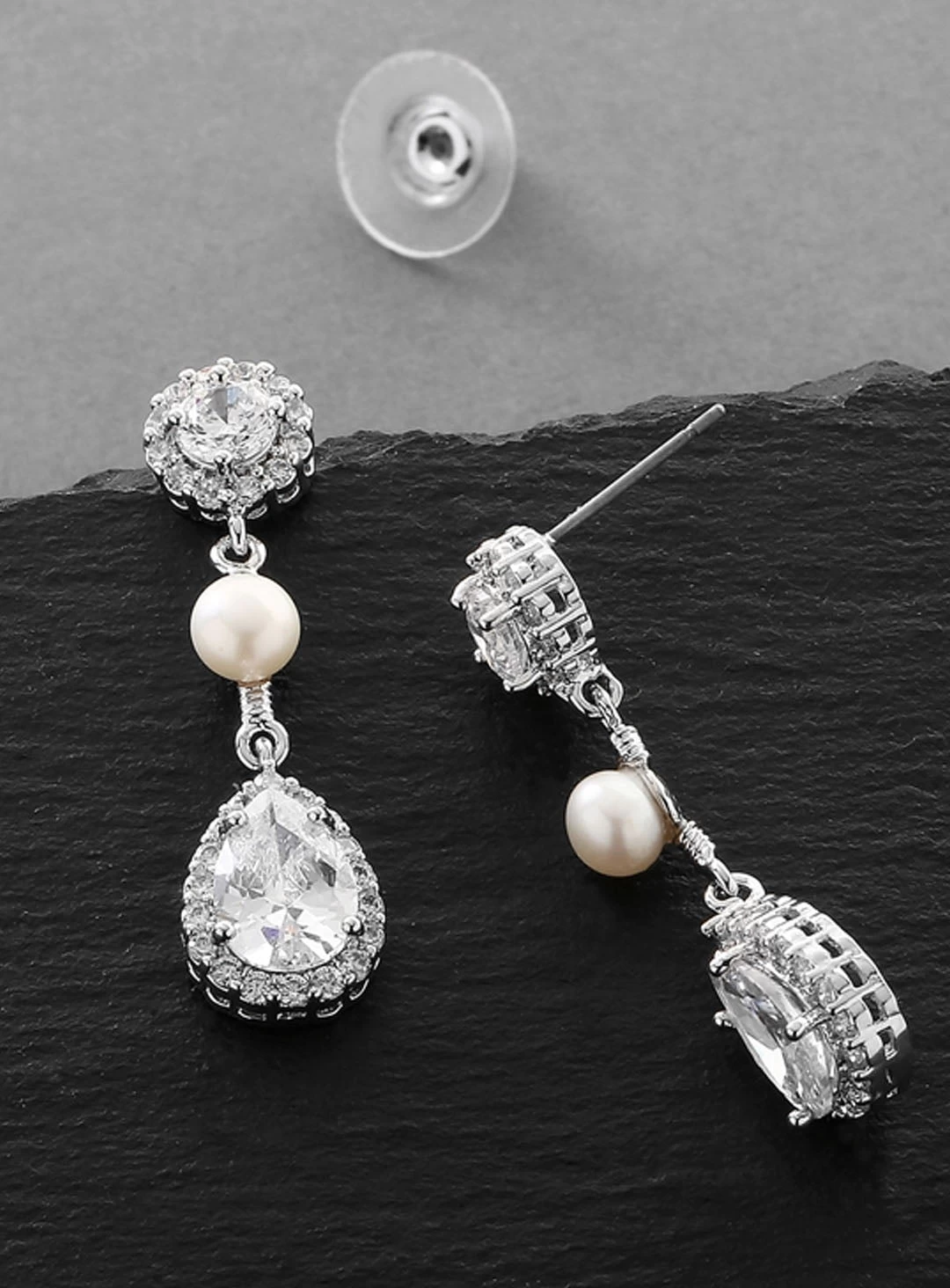 Gorgeous drop earrings by Mariell. Features freshwater perl accent with cubic 0.5 carat circonium stud and 1.5 carat circonium teardrop.