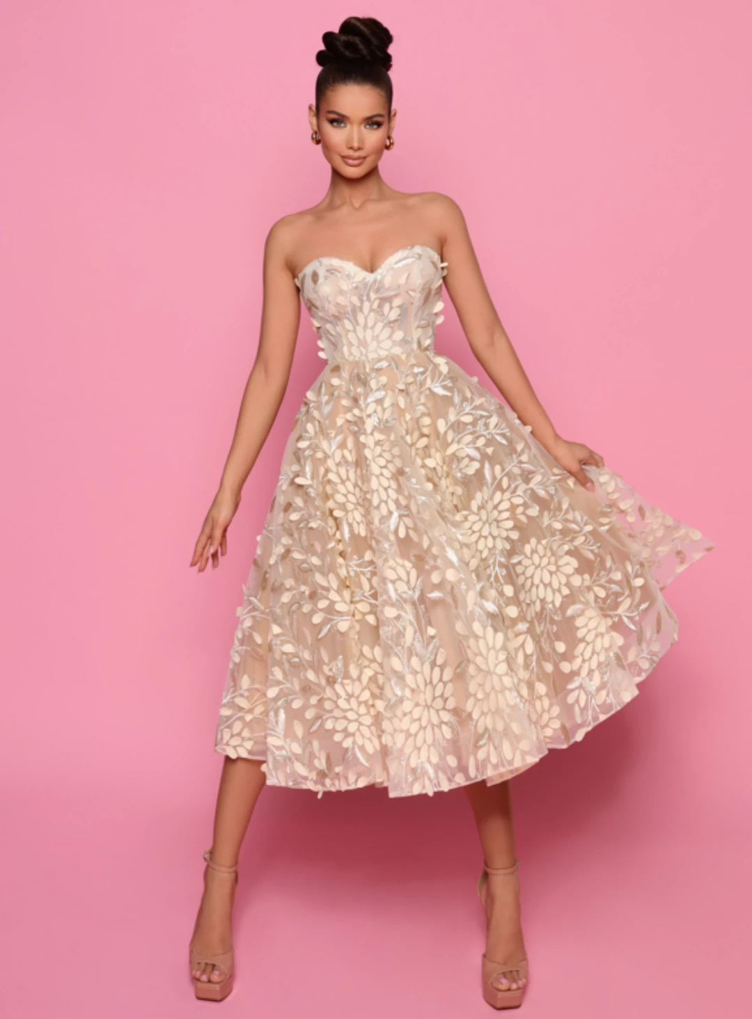 A stunning midi length dress by Nicoletta NP145. A strapless design featuring a sweetheart neckline with floral lace overlay.