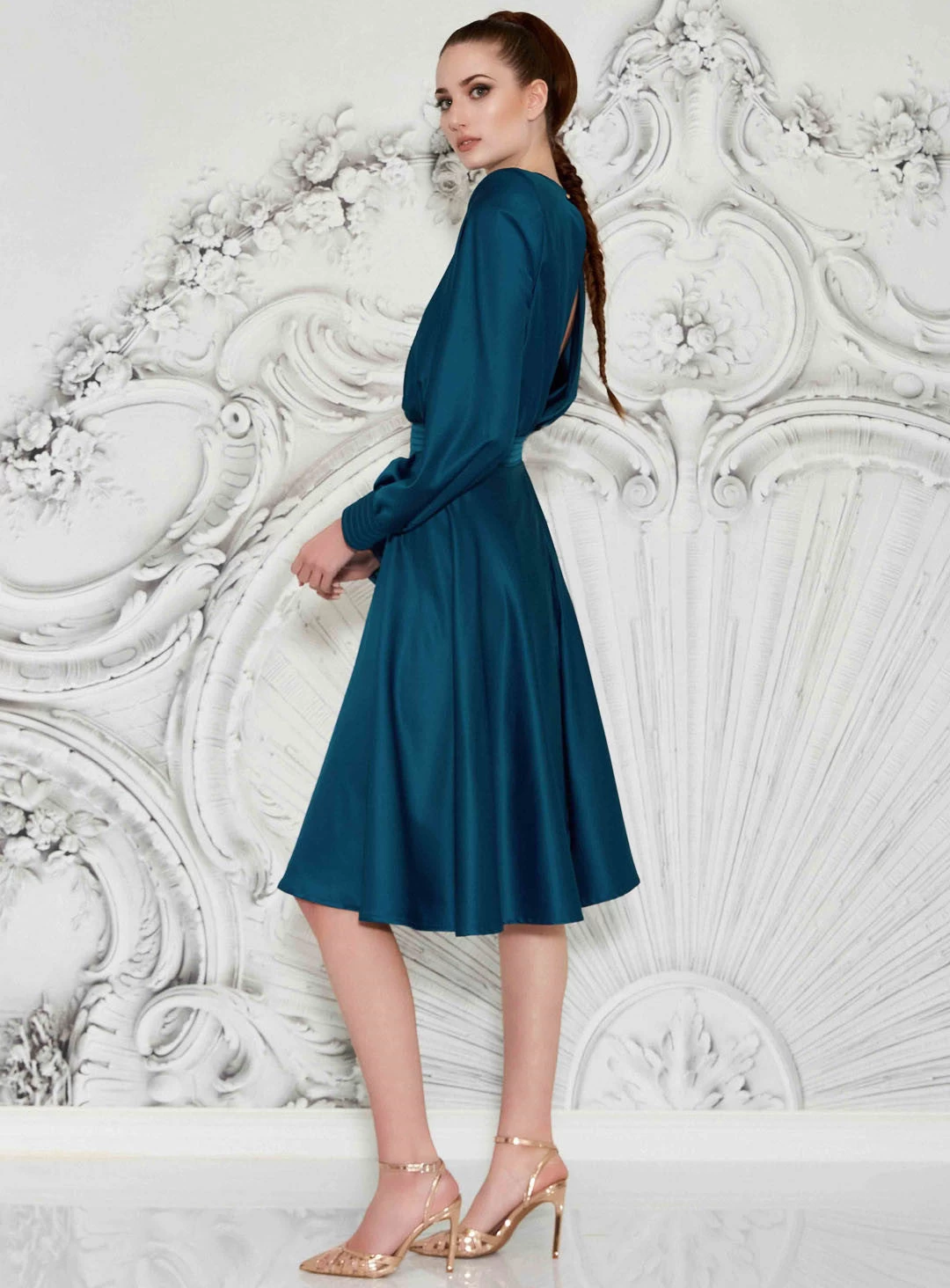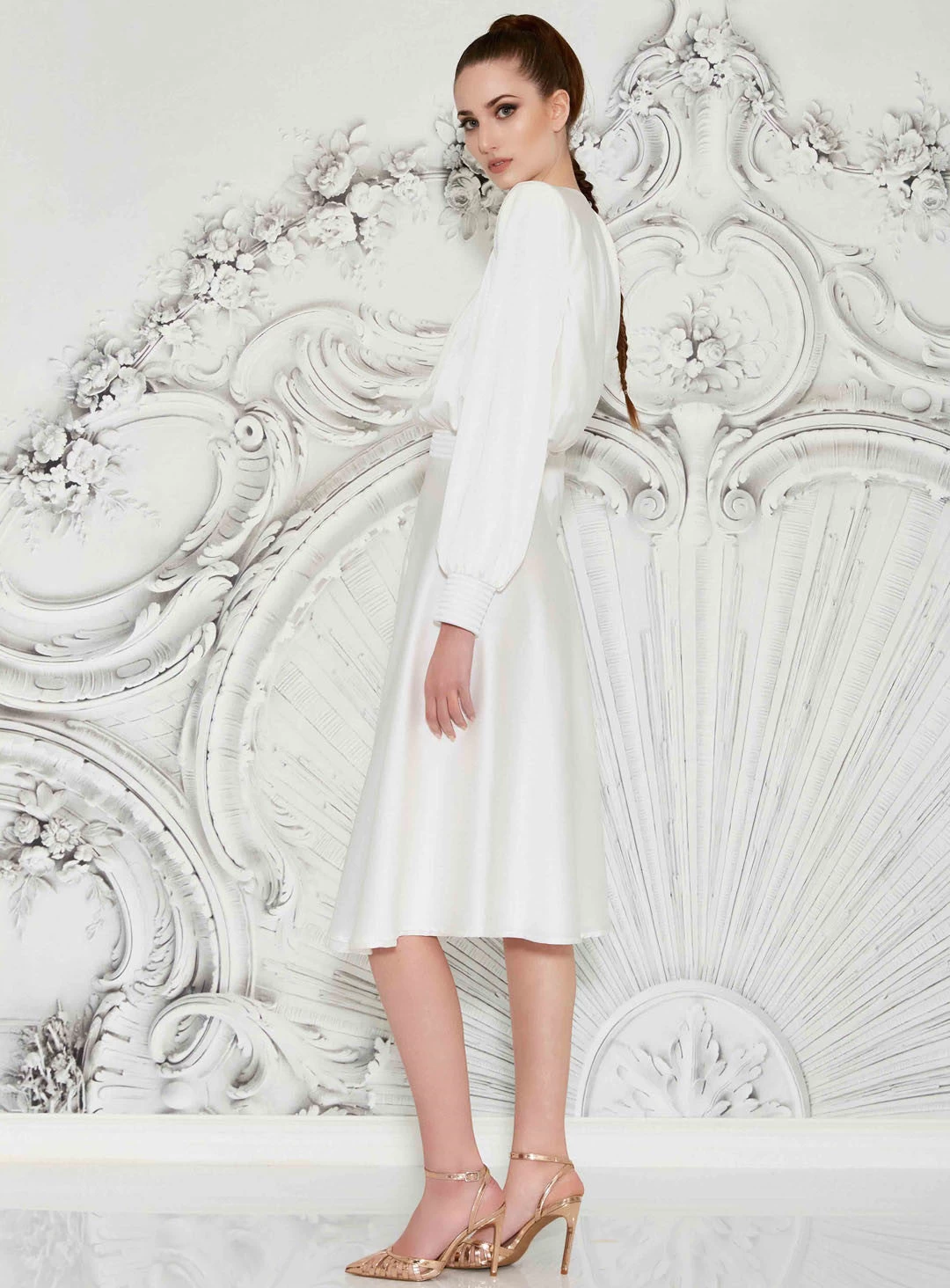 A gorgeous midi dress by Zhivago. A stretch satin bias cut midi with draped bodice, stitched waistband, billowed sleeves and shoulder accents.