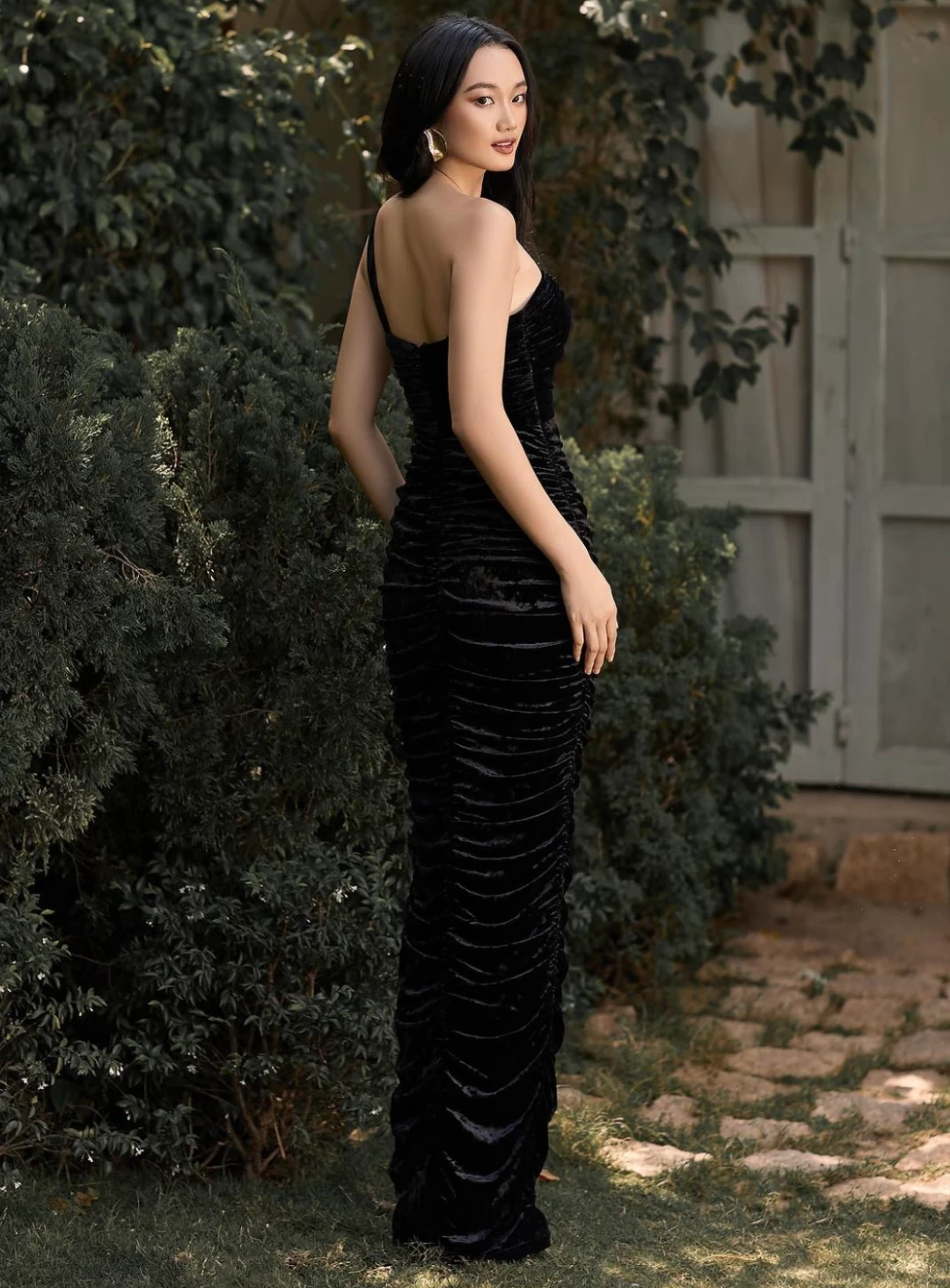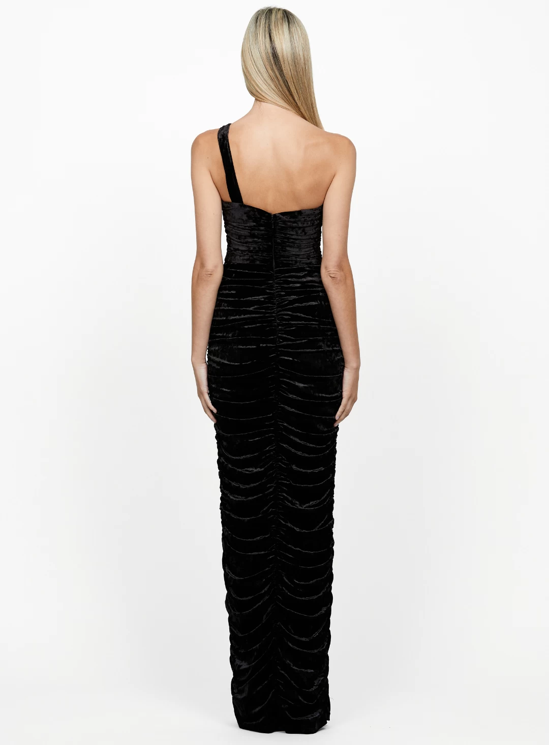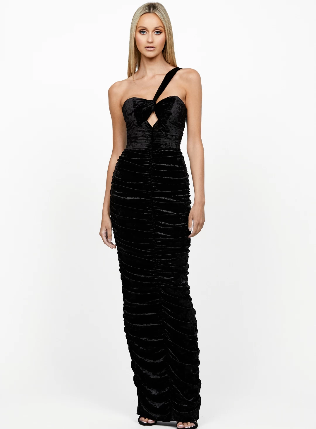 The Andie Asymmetric Ruched Maxi is a stunning full length dress by Bariano. A velvet design featuring a one shoulder strap, cut-out beneath the bust and heavily ruched slirt.