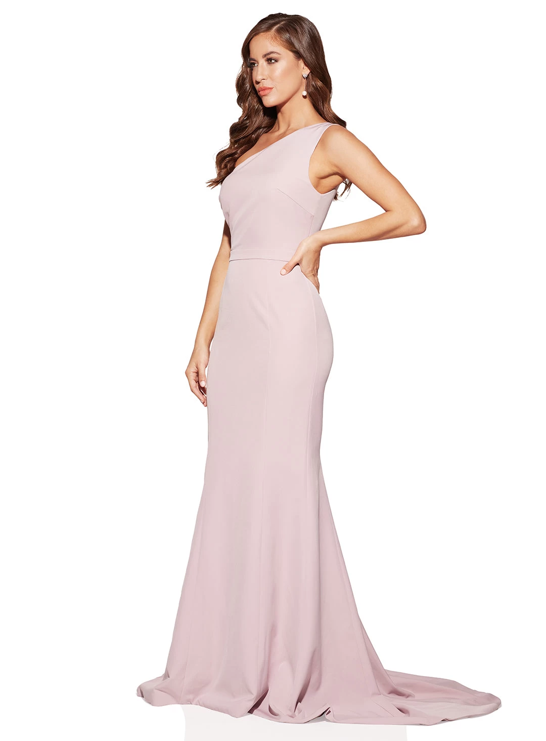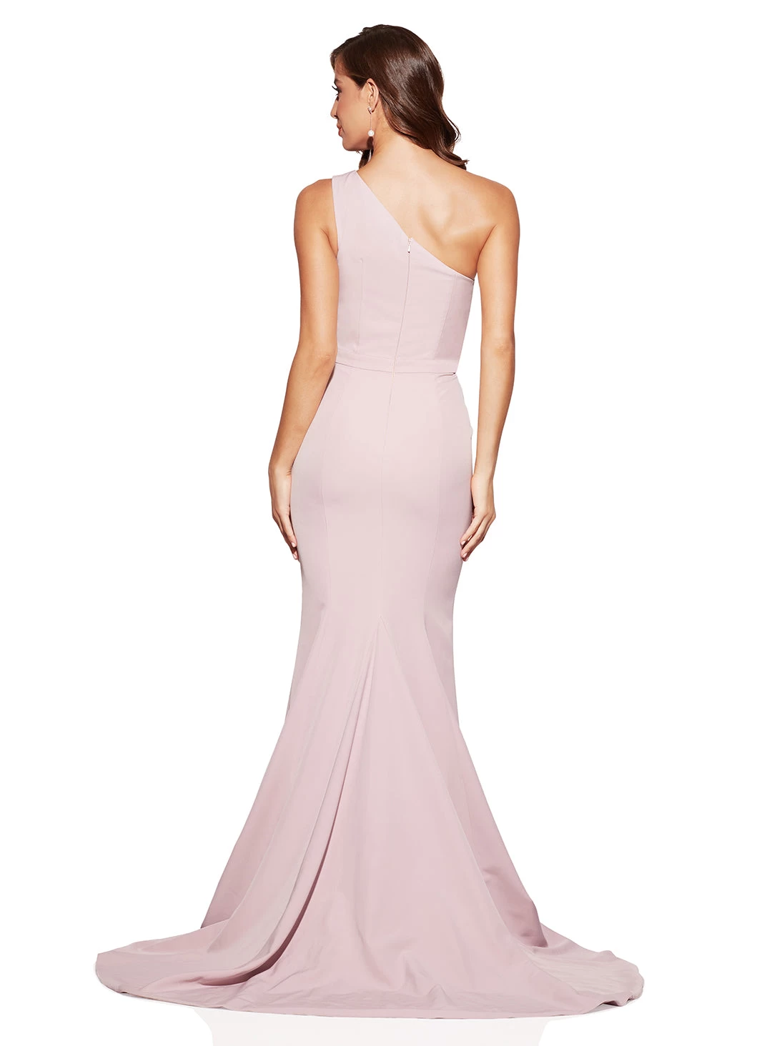 A beautiful gown by Samantha Rose. A one shoulder style featuring a slimming waistband and a full train.