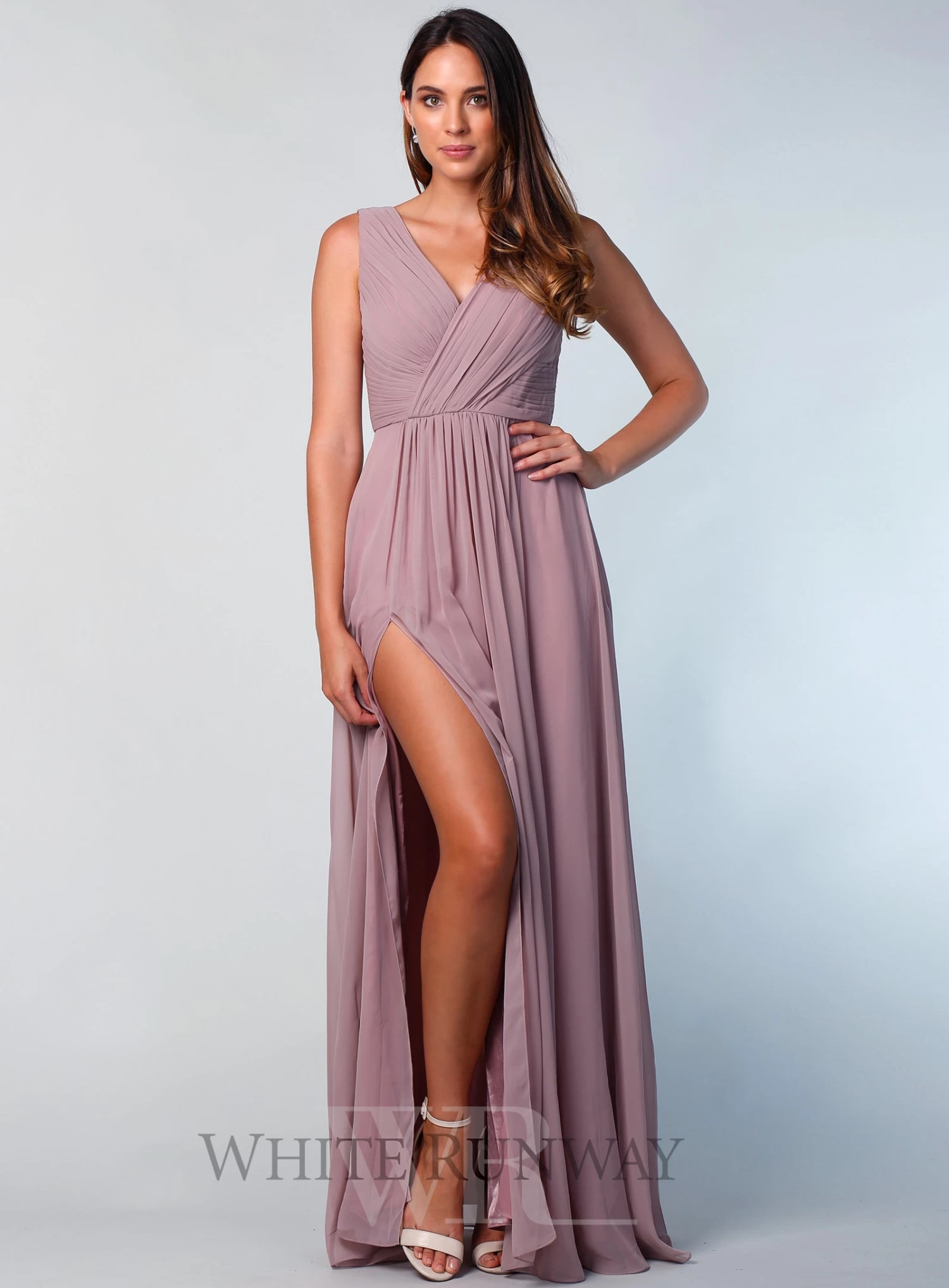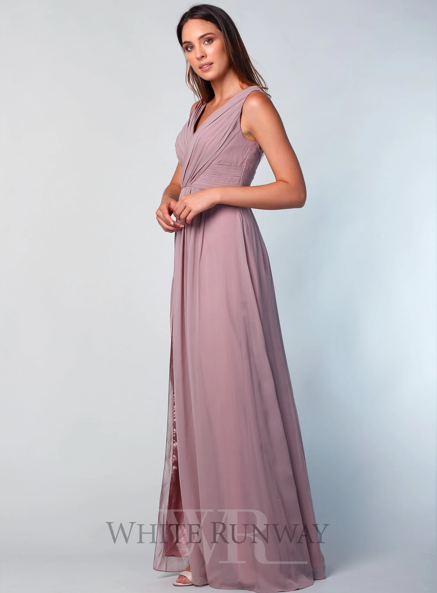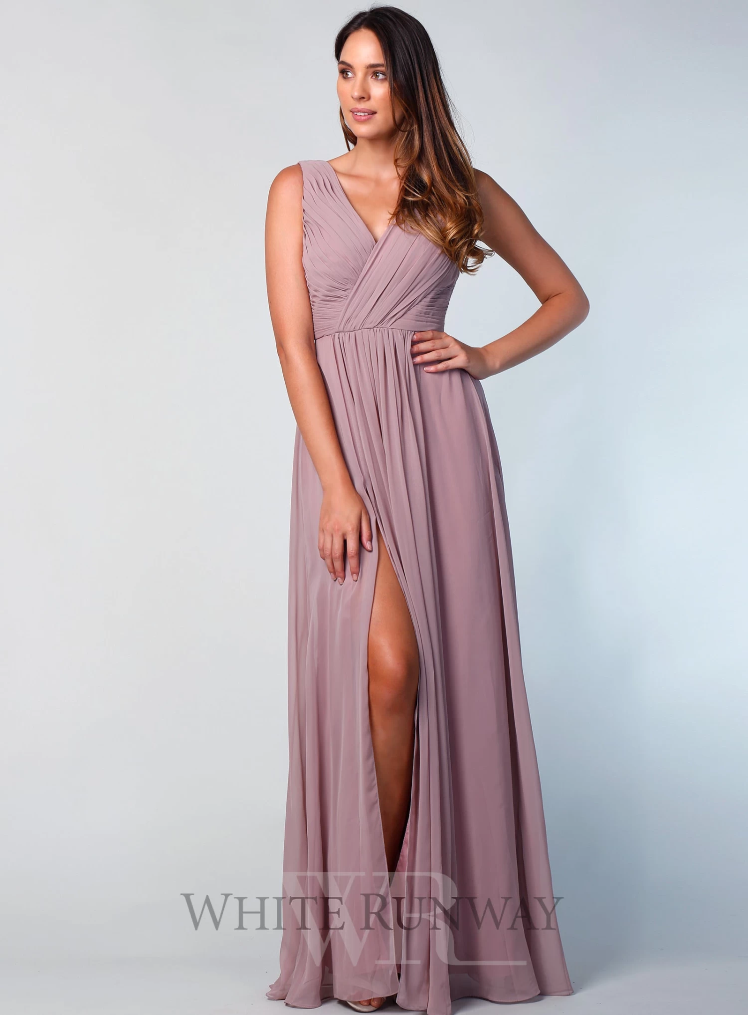 A beautiful full length dress by Le Demoiselle. A v-neck style featuring a side split.