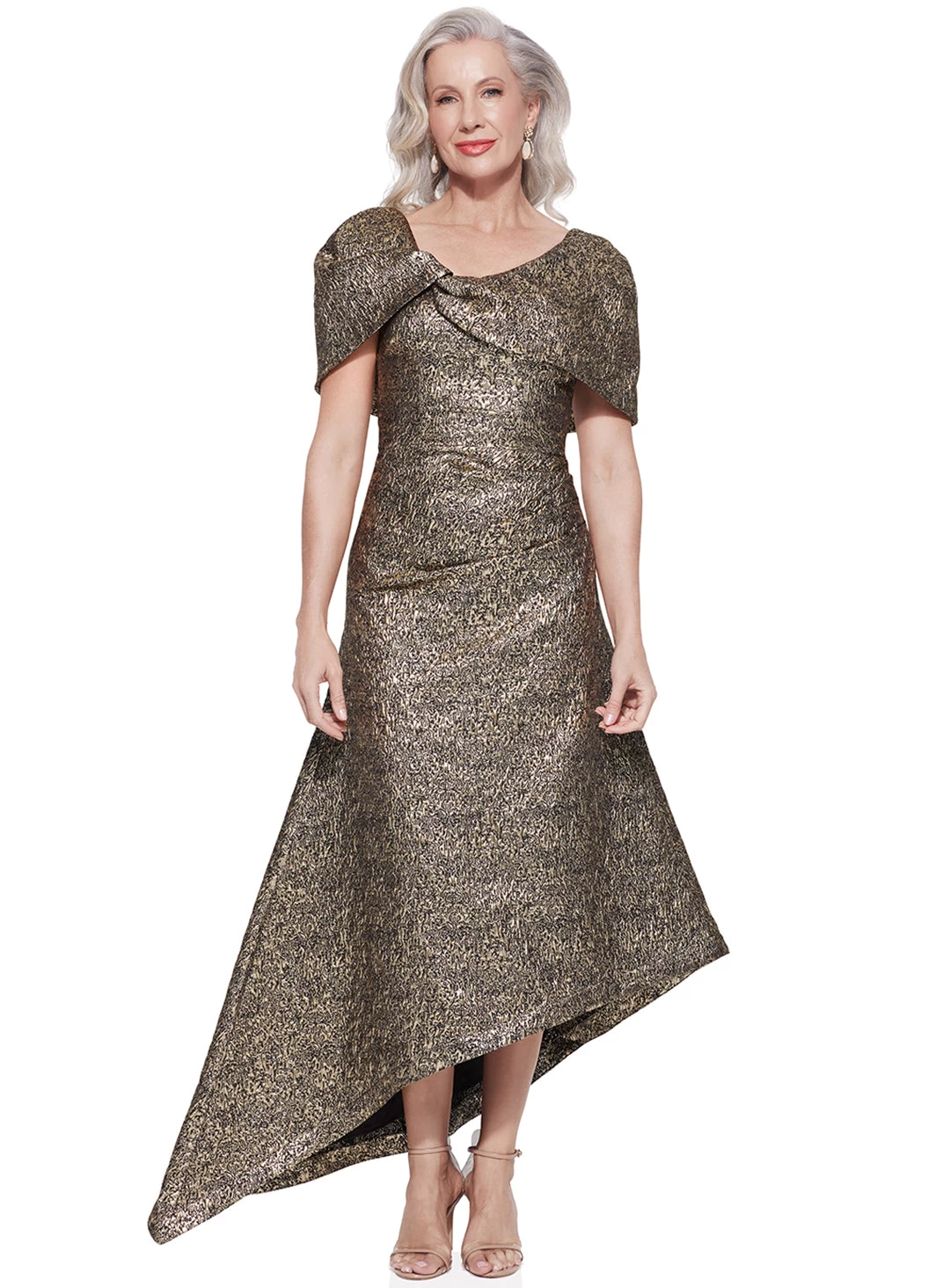 A gorgeous dress by Trellis Lane. A flattering asymmetrical sleeve design crafted in a gorgeous metallic fabric featuring ruching across the stomach and a fit and flare skirt.