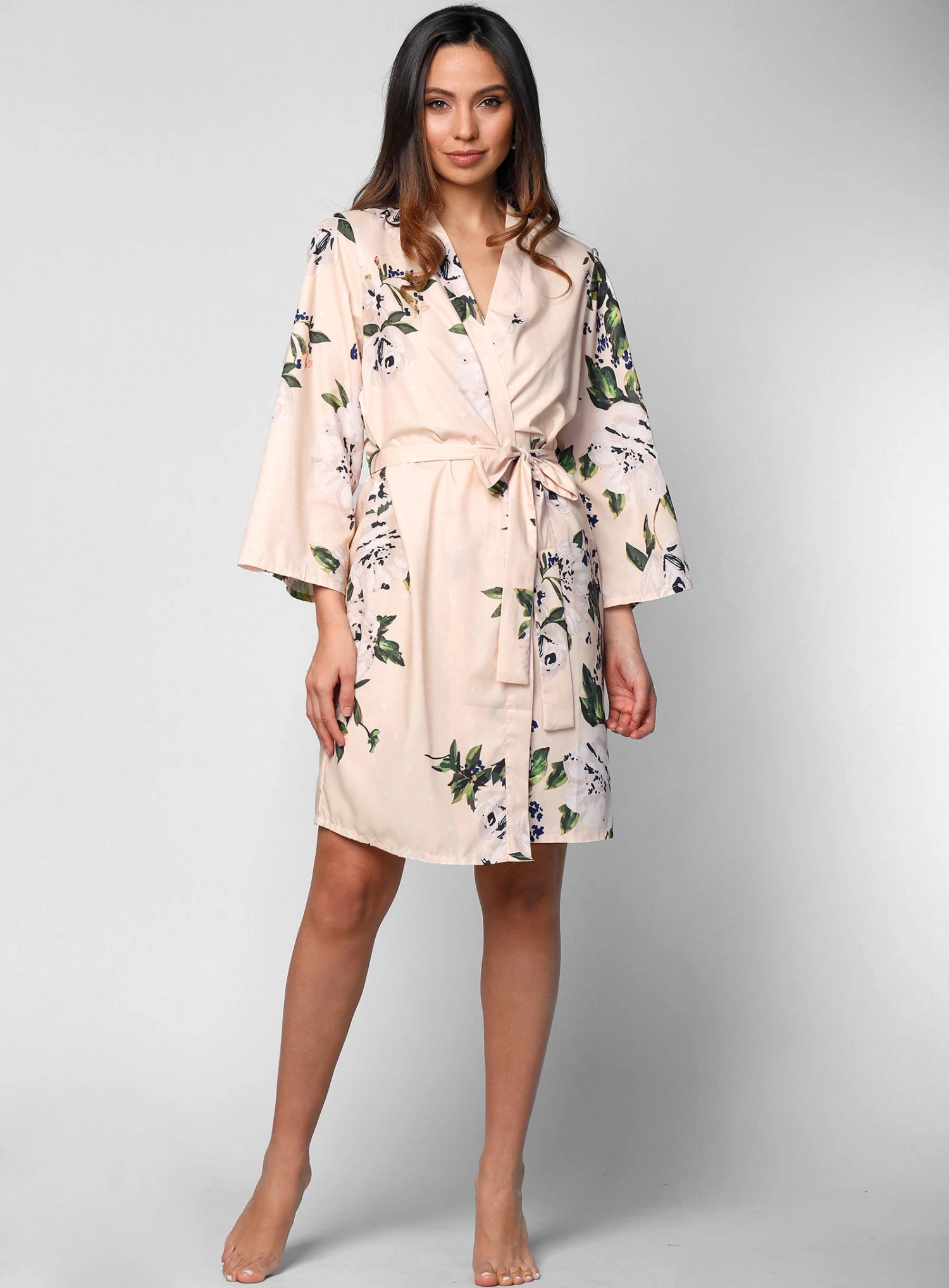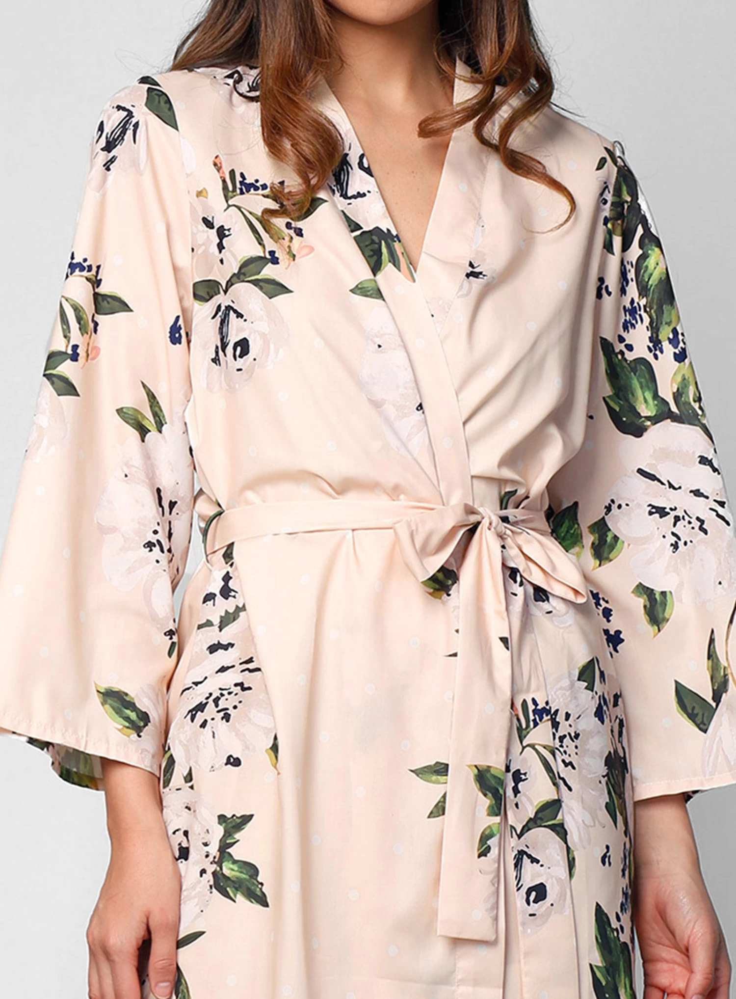 The Arles Gardenia Print Robe is a beautiful robe from Samantha Rose. A wrap style featuring a gorgeous floral and polka dot pattern throughout.