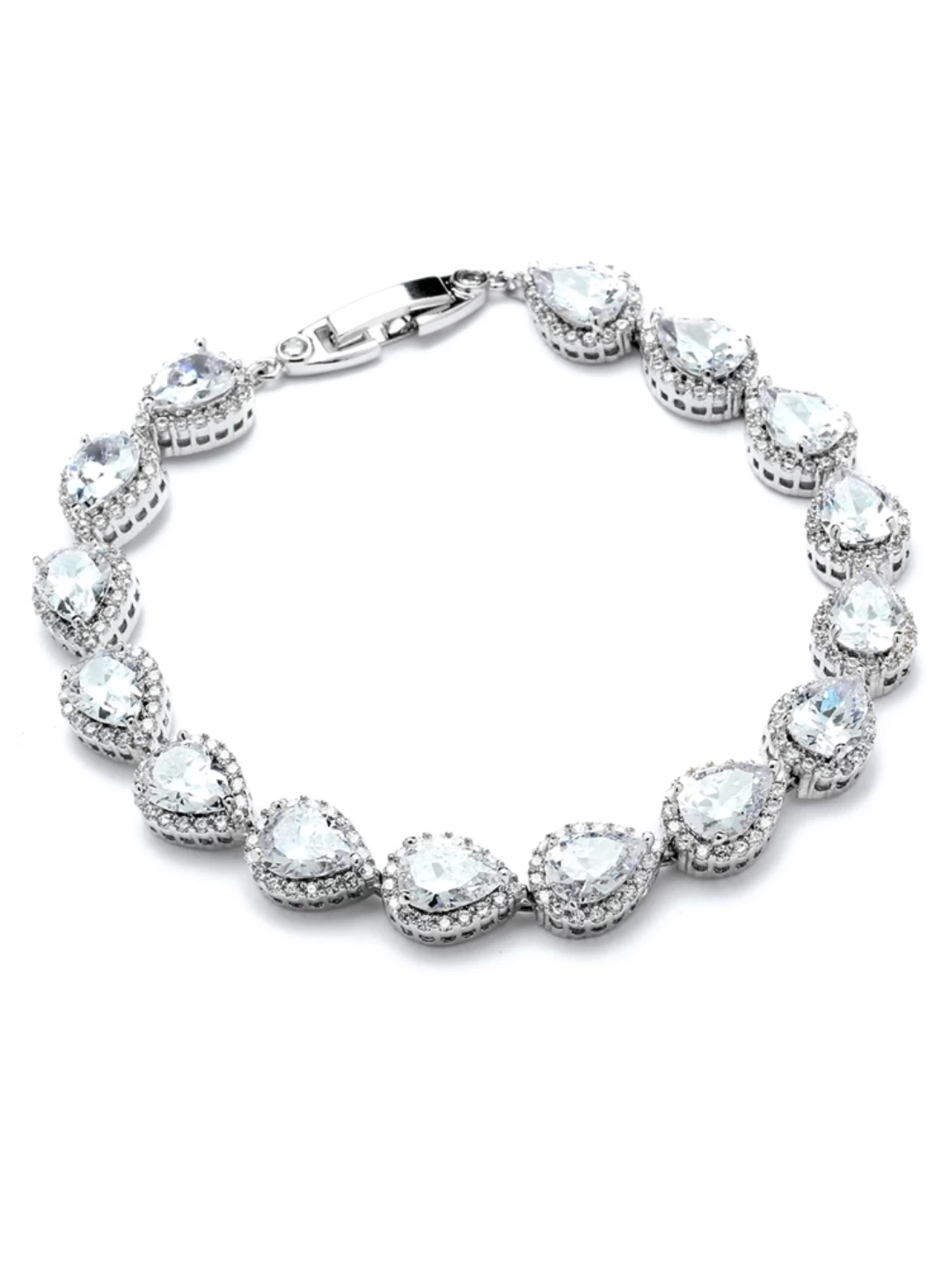 Delicate bracelet by Mariell. Features framed pear shaped cubic zirconia stones,