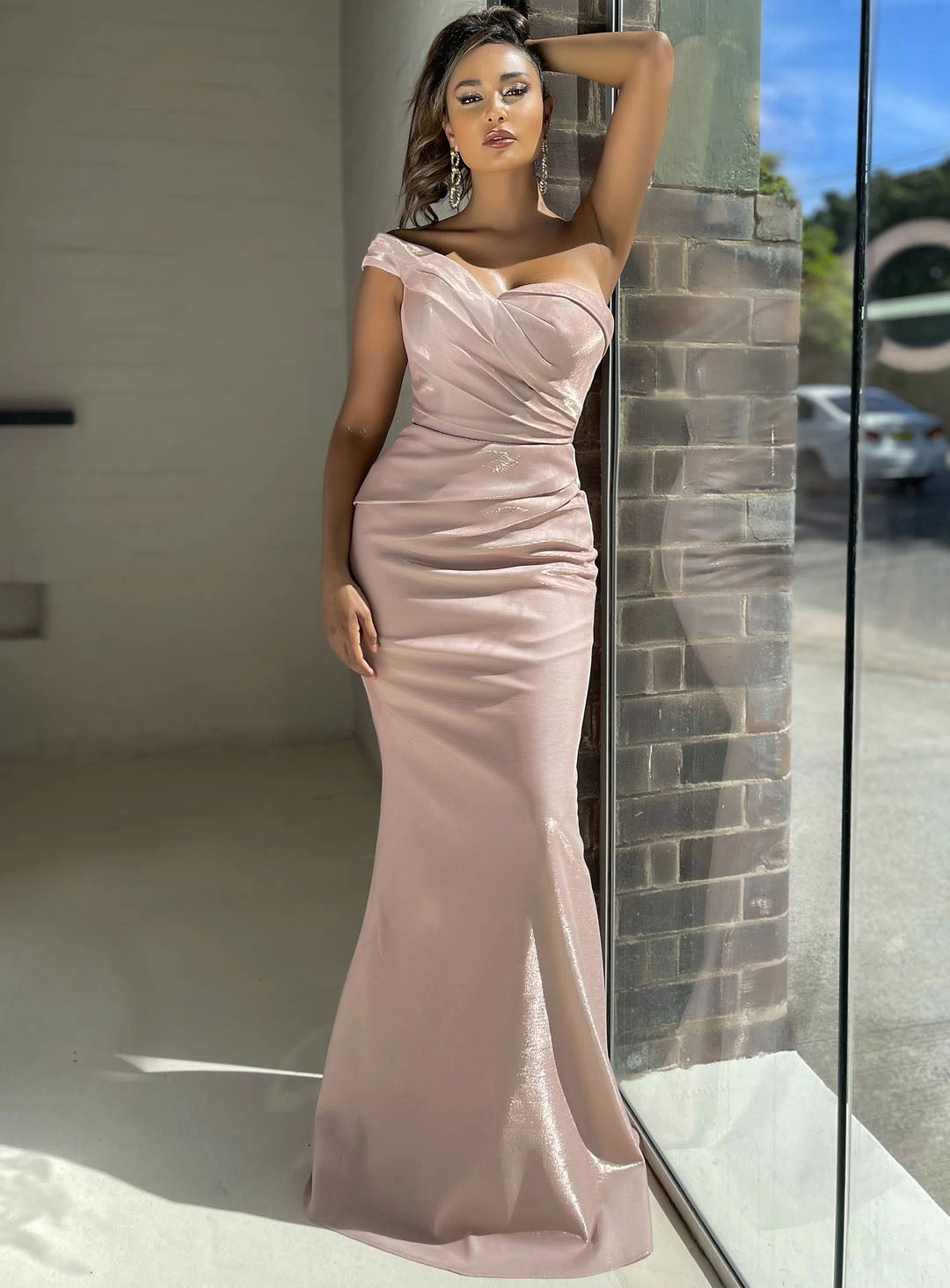 A stunning full length gown by Jadore JX5011. A shimmery design featuring a sweetheart neckline, off shoulder detail and ruching on the bodice.
