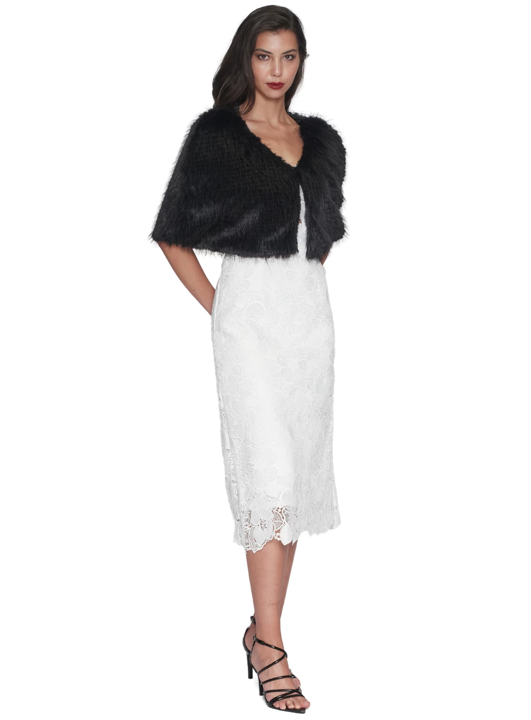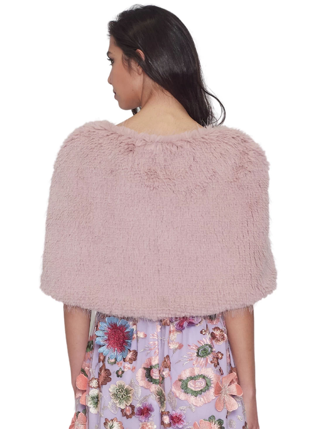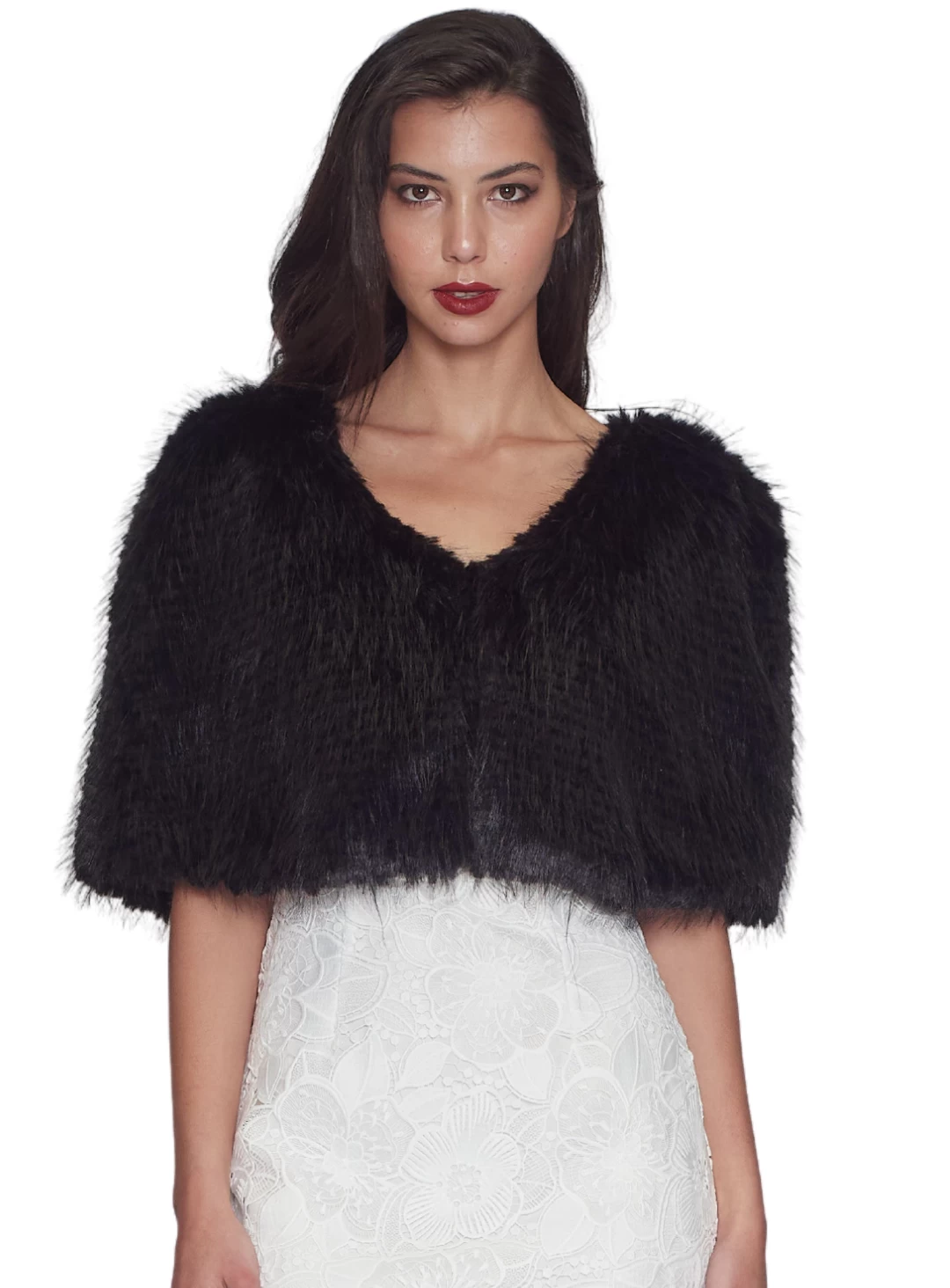 A gorgeous faux fur cape by Samantha Rose. Perfect for layering, this cape is constructed with plush short length faux fur and features a snap hook and eyelet for closure in the front.