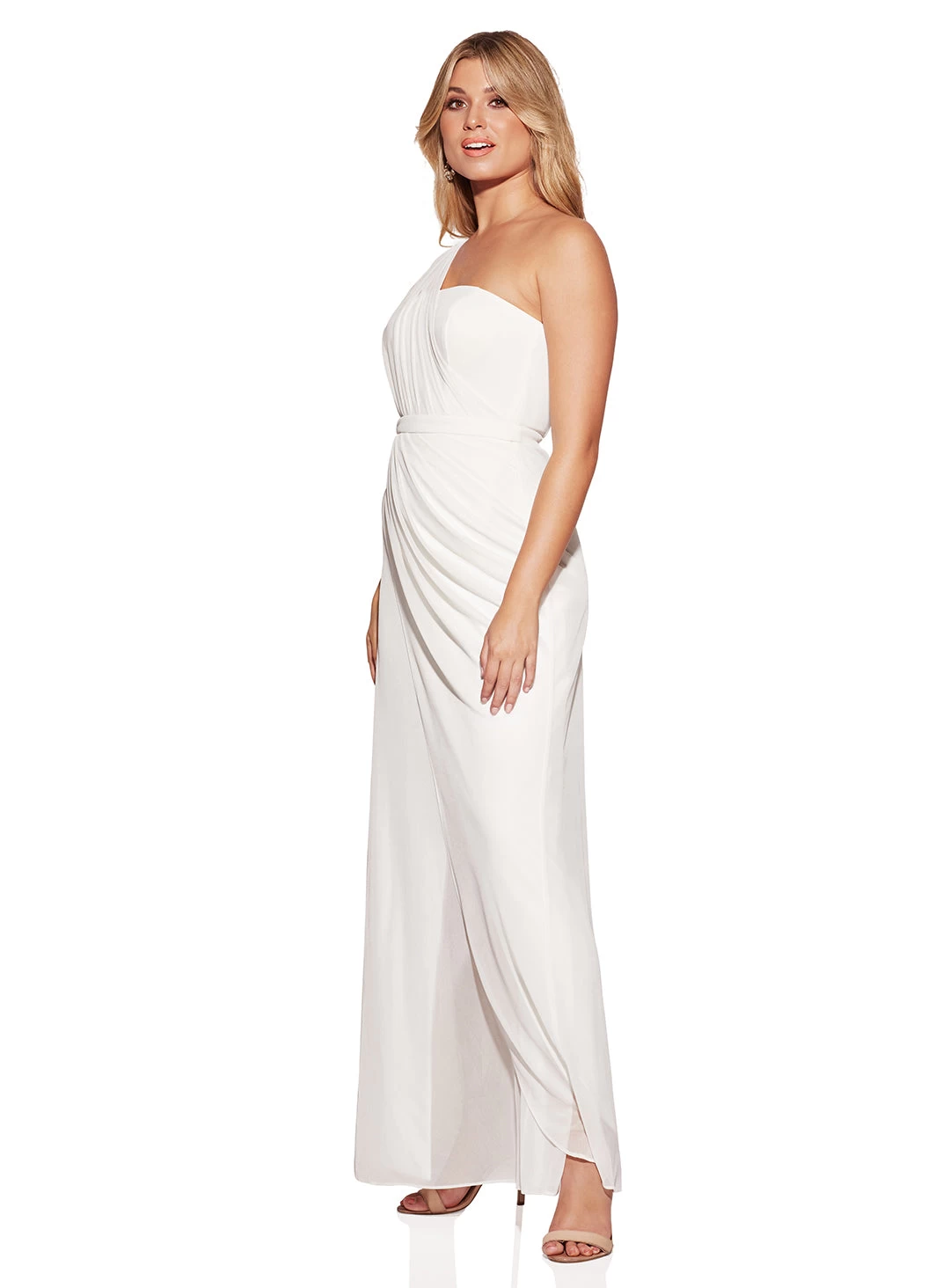 A stunning full length dress by Samantha Rose. A strapless design featuring a sheer one shoulder detail and wrap style skirt.