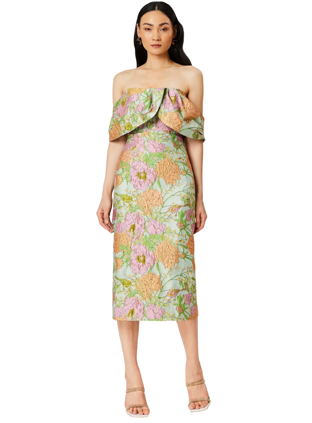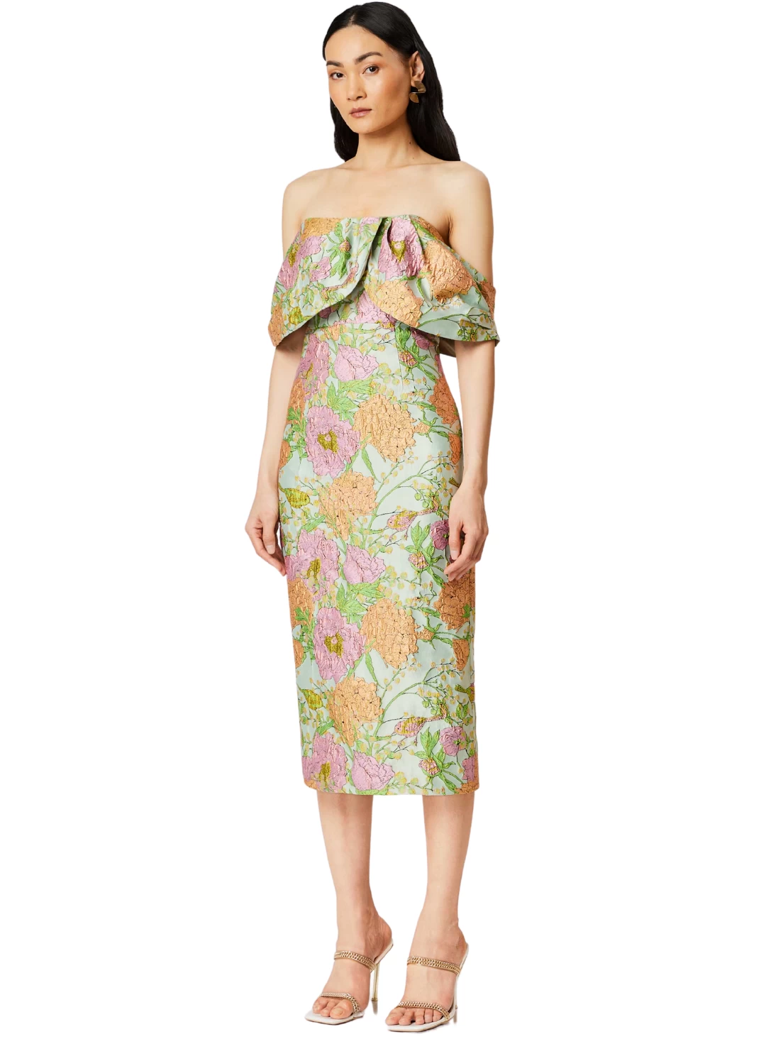 The Beachcomber Dress is a stunning midi length dress by Elliatt. An off shoulder design featuring a pencil skirt and crafted in a gorgeous multicolored print.