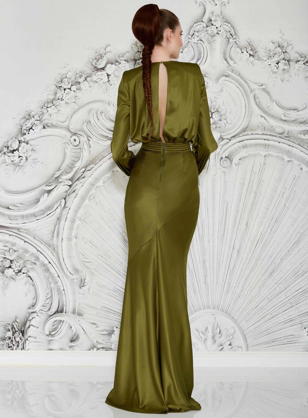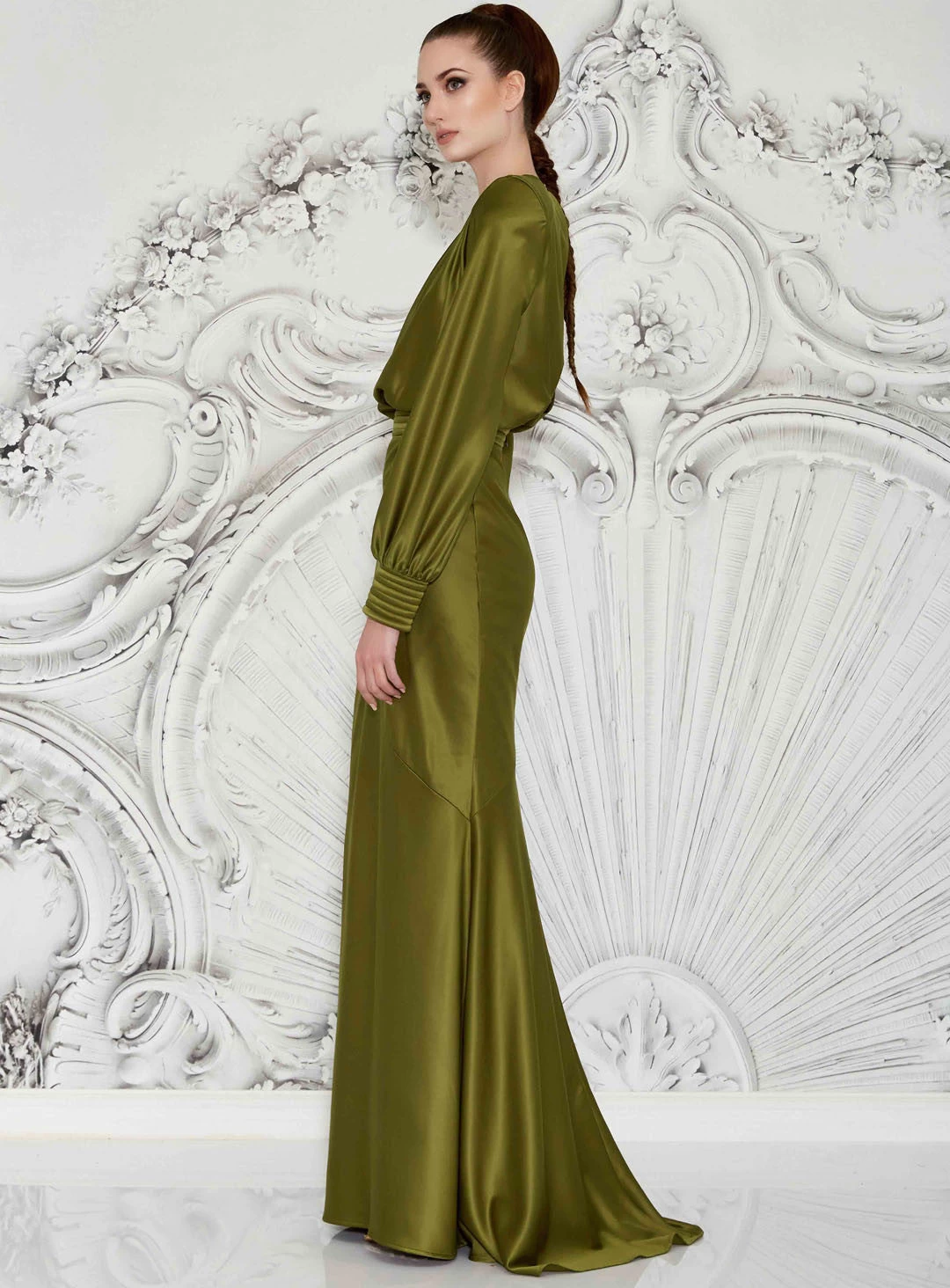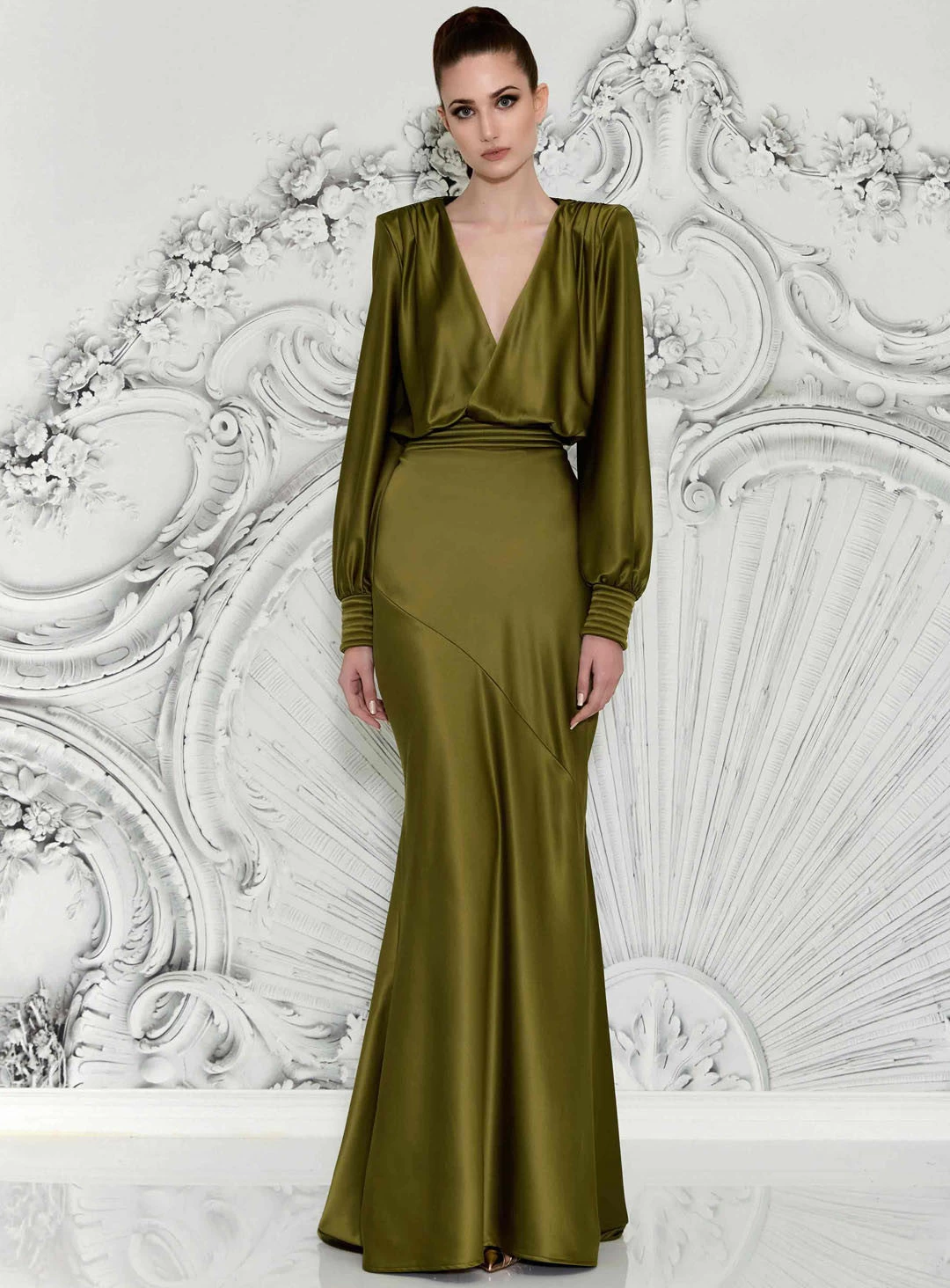 A stunning full-length dress by Zhivago. A stretch satin bias cut gown with billowed sleeves, shoulder accents and stitched satin panels.