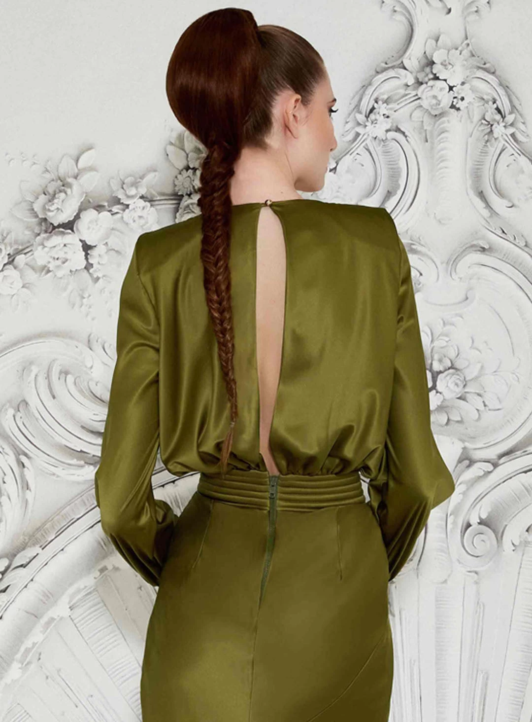 A stunning midi length dress by Zhivago. A stretch satin bias cut gown with billowed sleeves, shoulder accents and stitched satin panels.