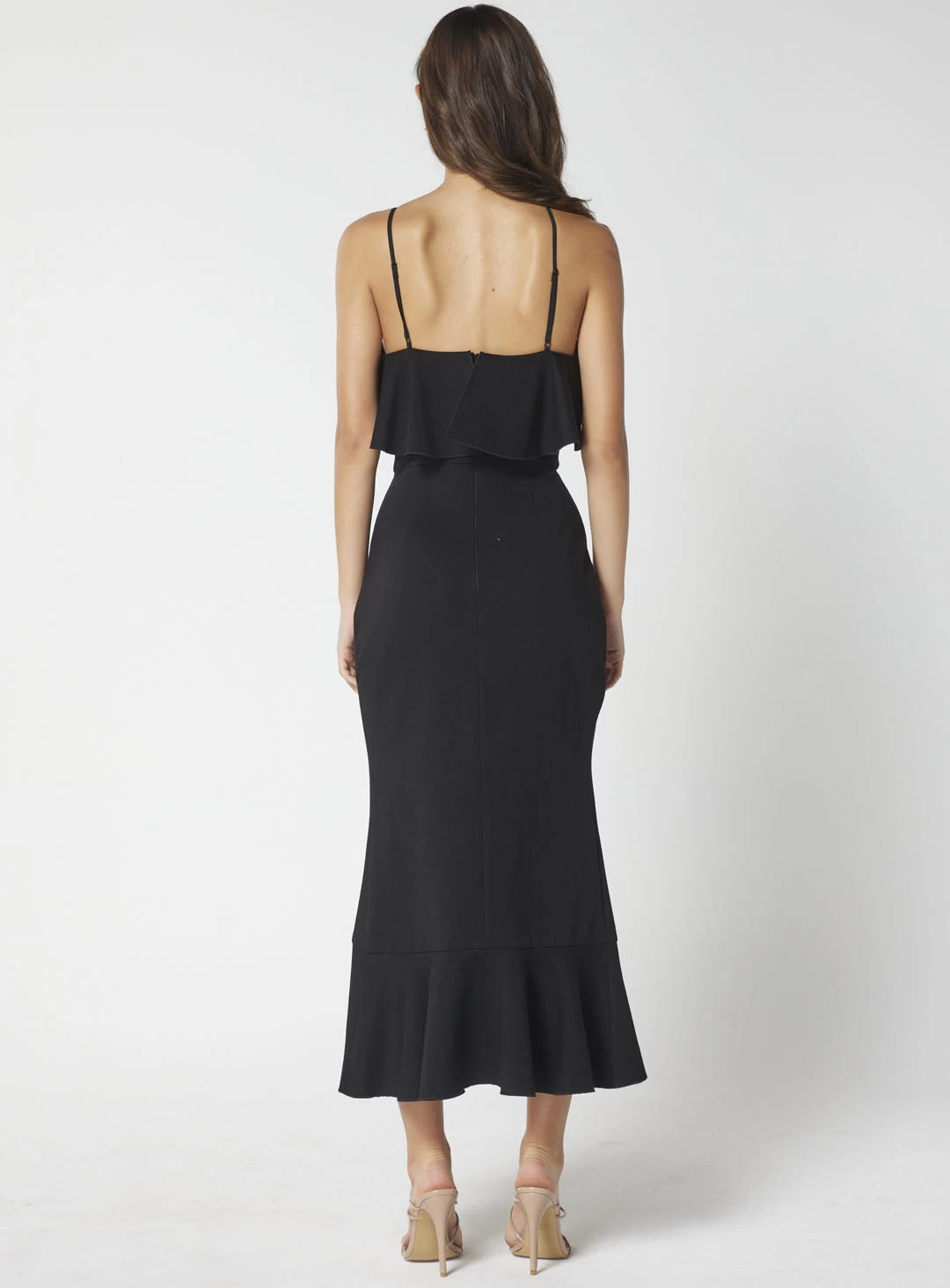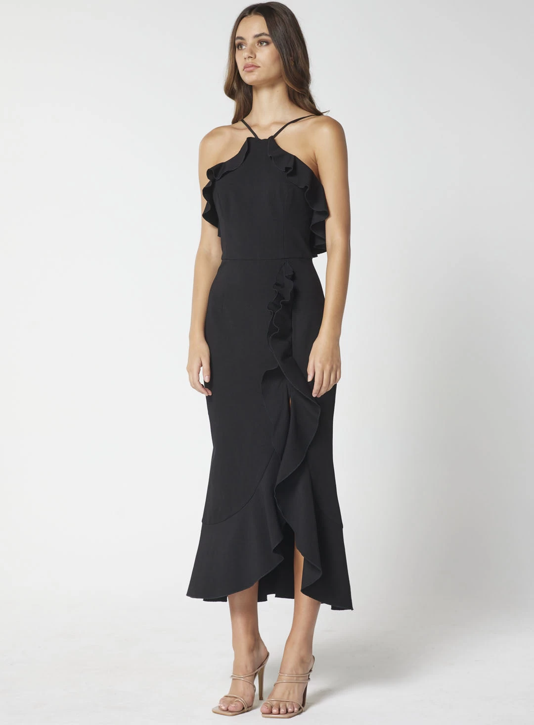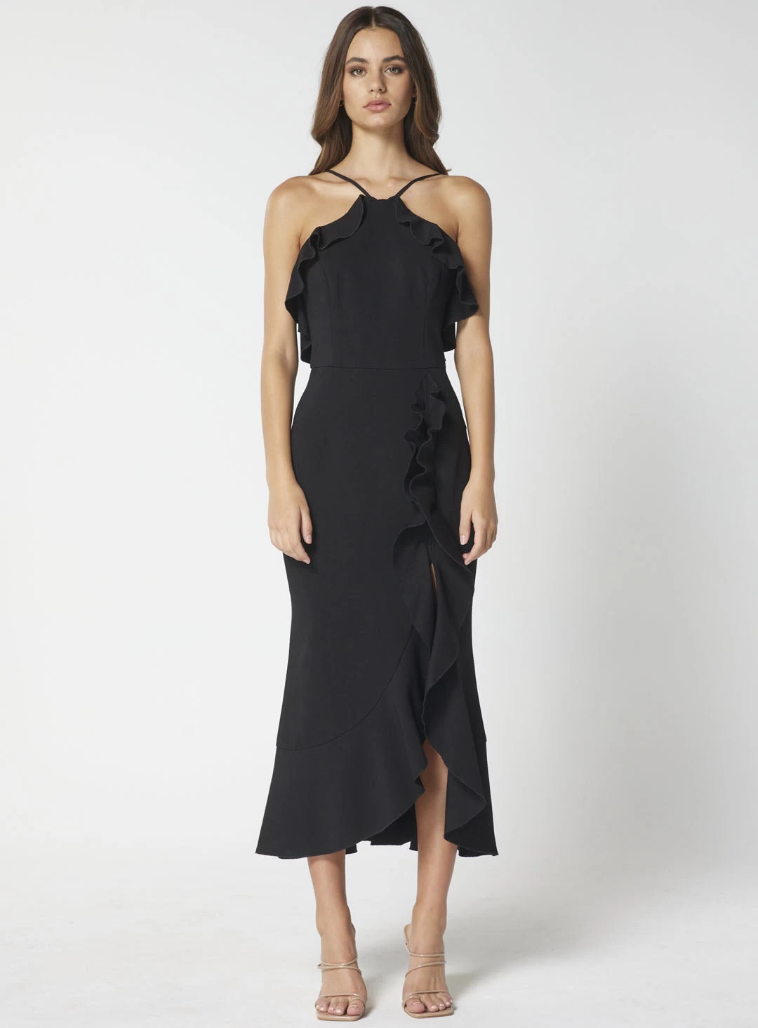 The Black Dimness Dress by Elliat is a gorgeous midi dress. A halter style dress featuring frill details along the neckline and draped down the skirt. 99