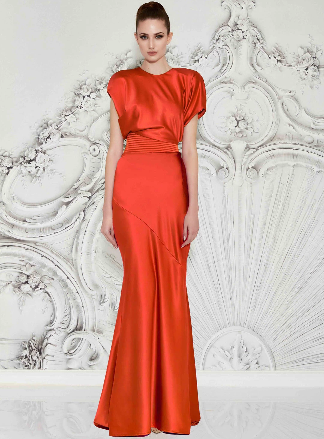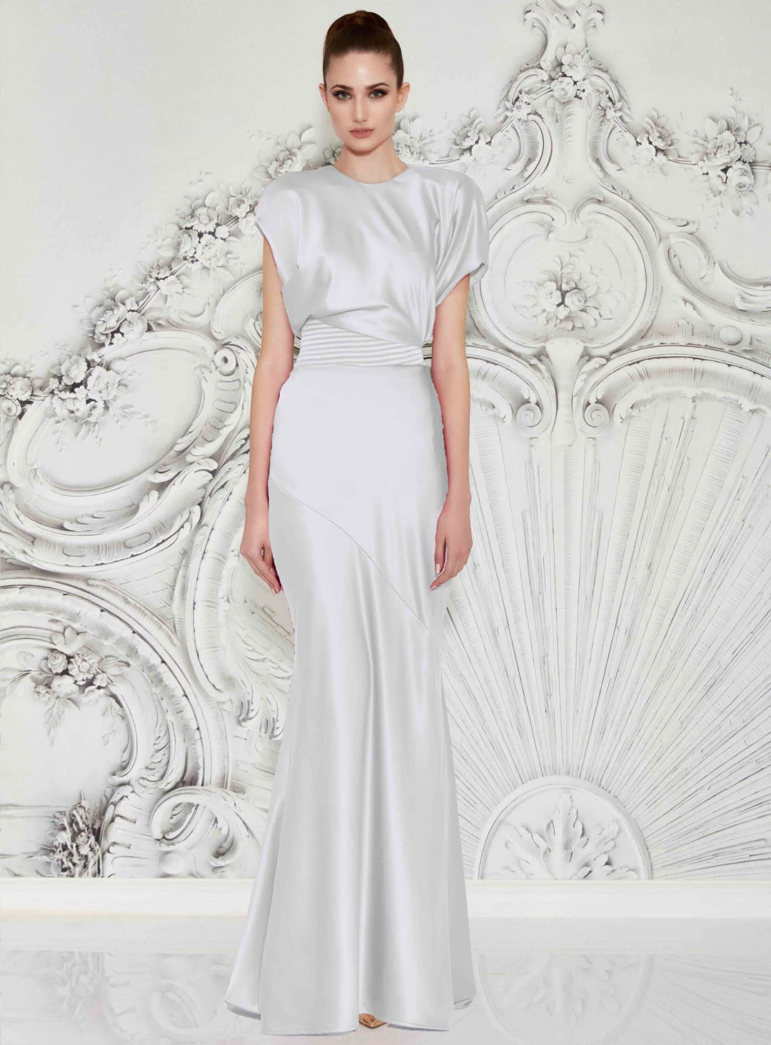 A gorgeous full length dress by Zhivago. A stretch satin bias cut midi length dress with a draped bodice, stitched waistband, draped skirt and natural shoulder accents.