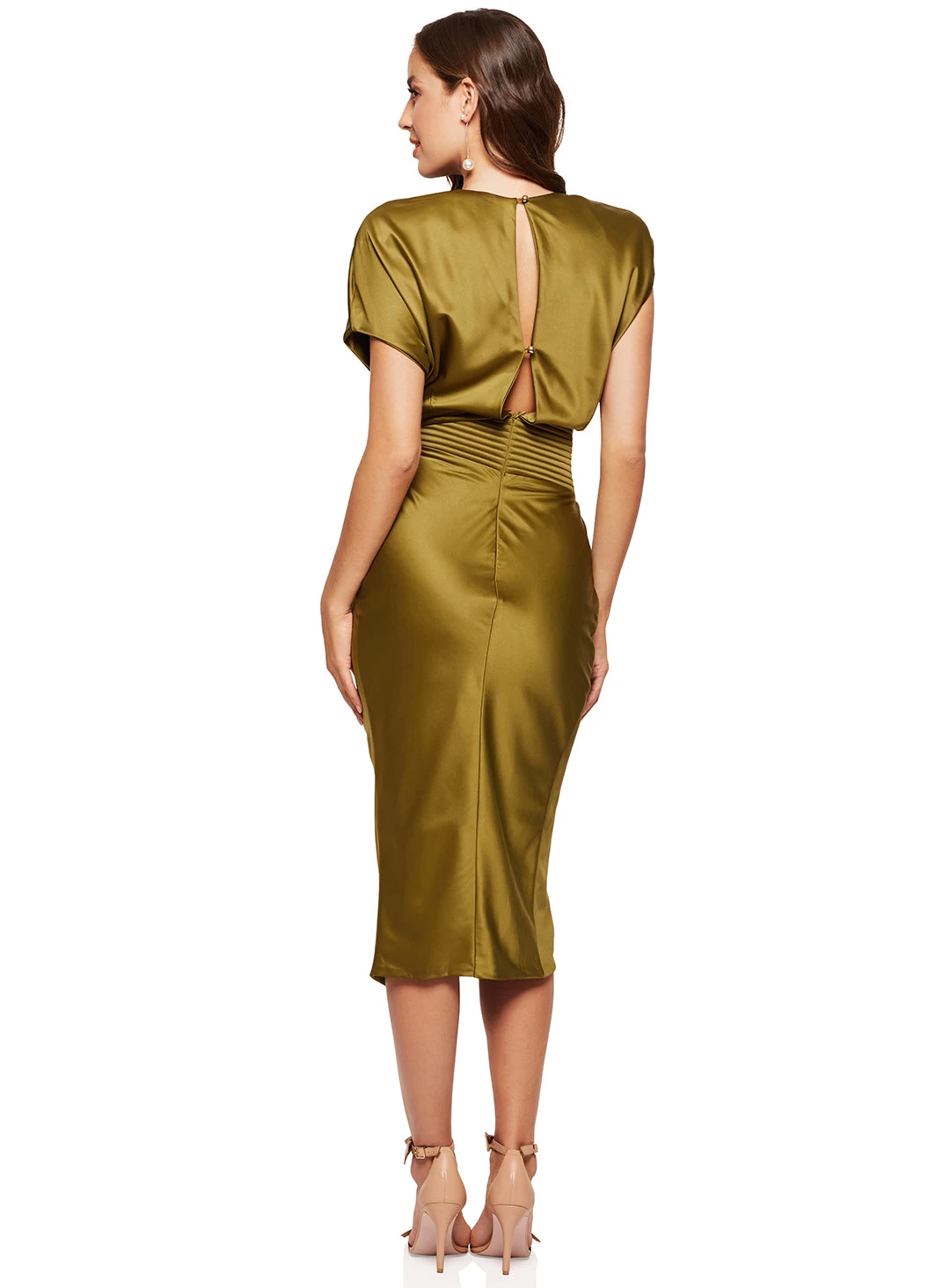 The Bond Midi Dress is a gorgeous midi dress by Zhivago. A stretch satin bias cut midi length dress with a draped bodice, stitched waistband, draped skirt and natural shoulder accents.
