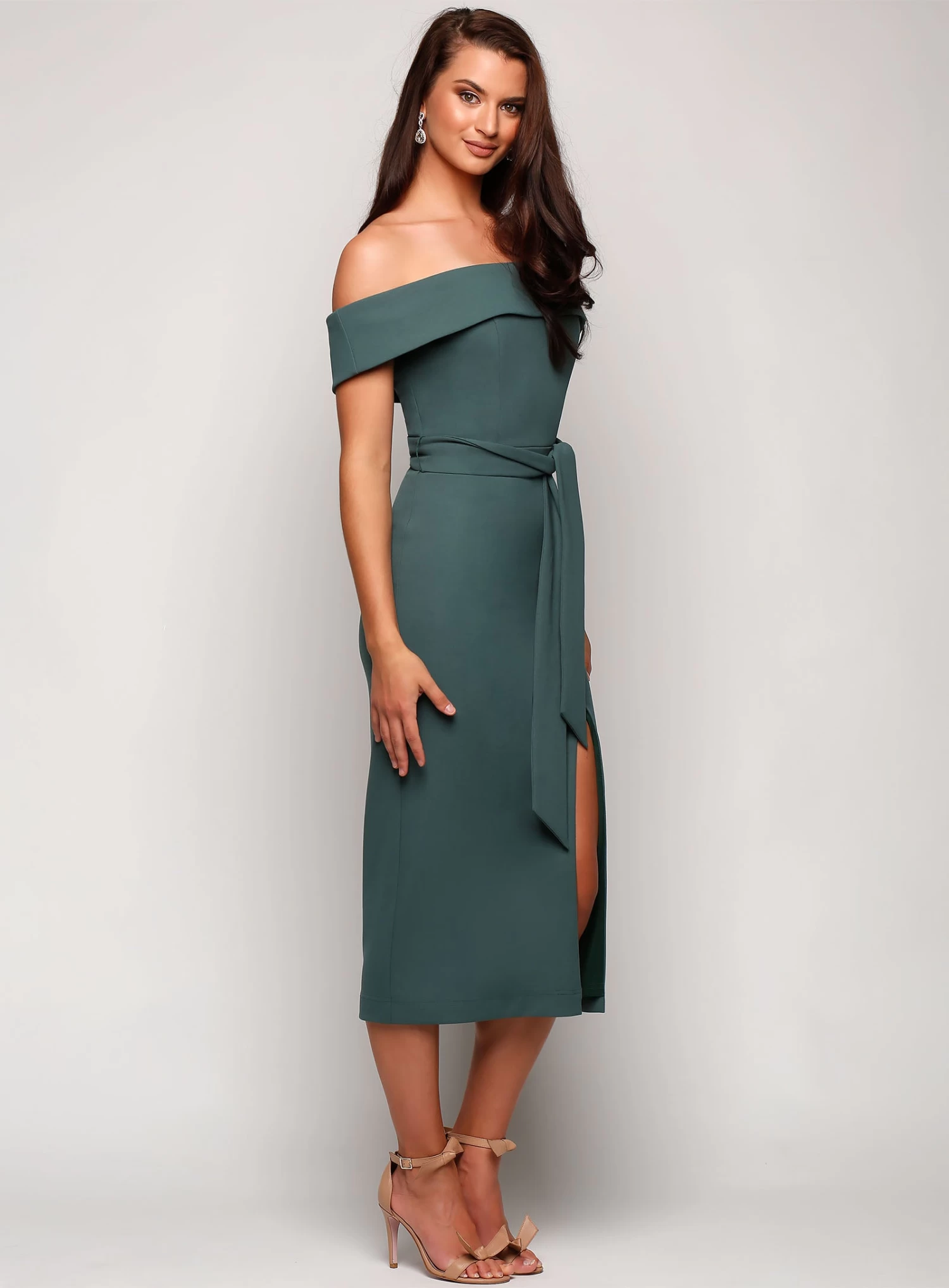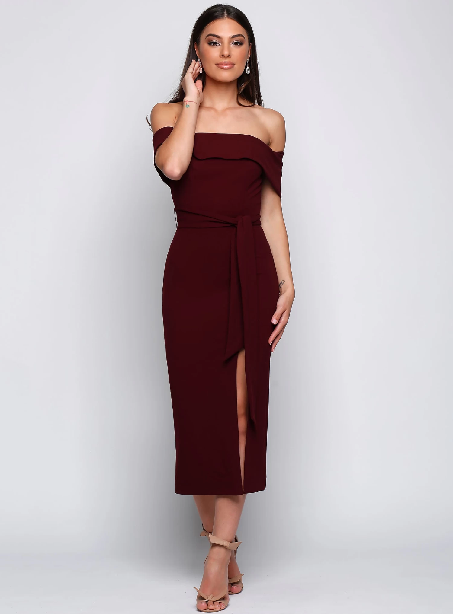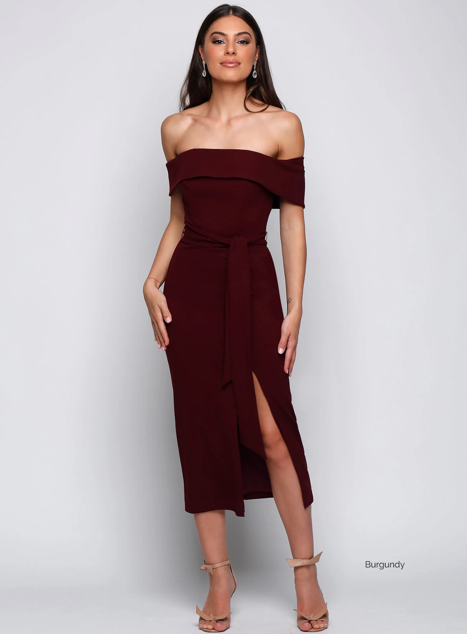 A beautiful midi dress by Samantha Rose. An off shoulder fitted style with removable waist tie and thigh high side split.