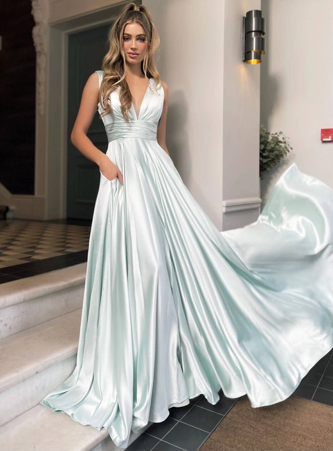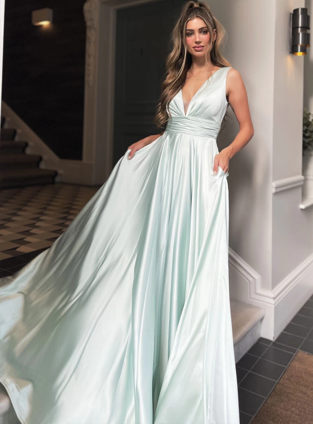 A gorgeous full length style by Jadore Evening JP120. Featuring a v neckline with mesh insert, ruched waist band and full floor sweeping skirt.