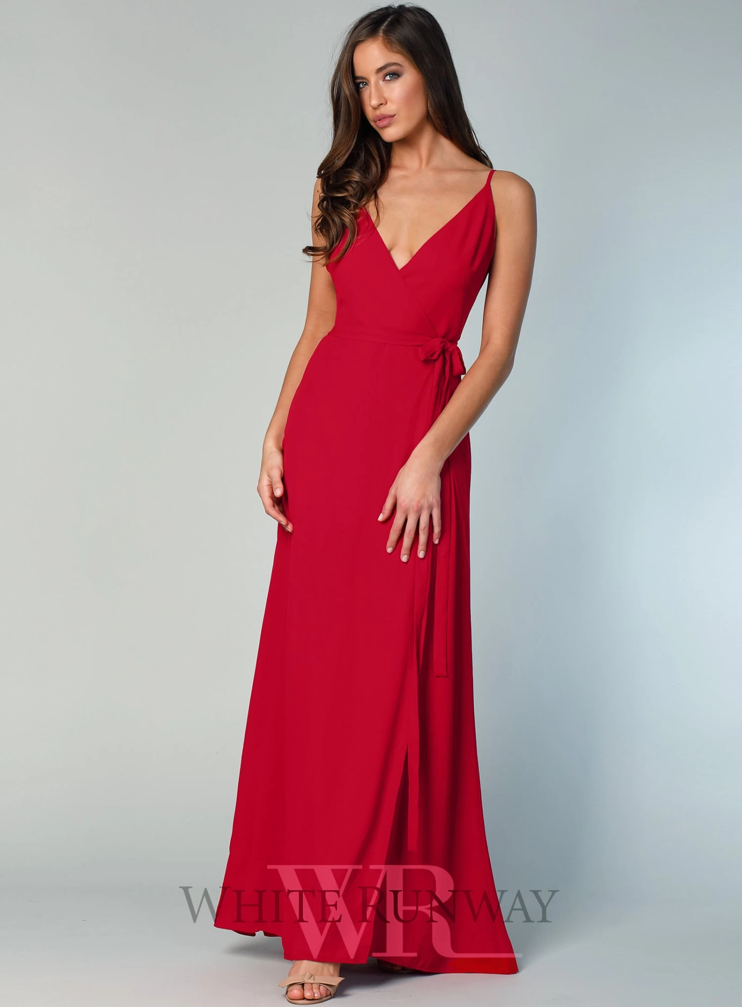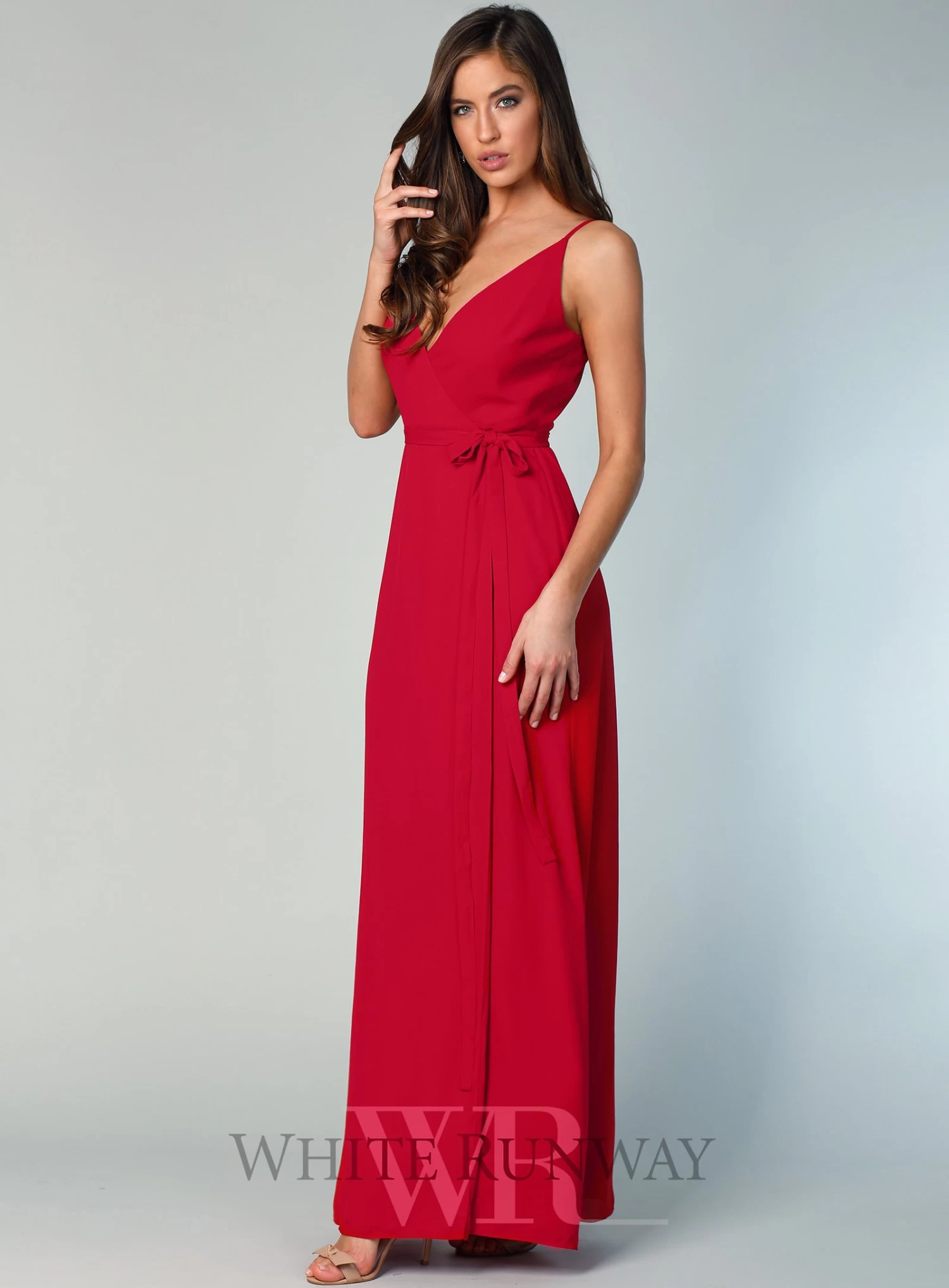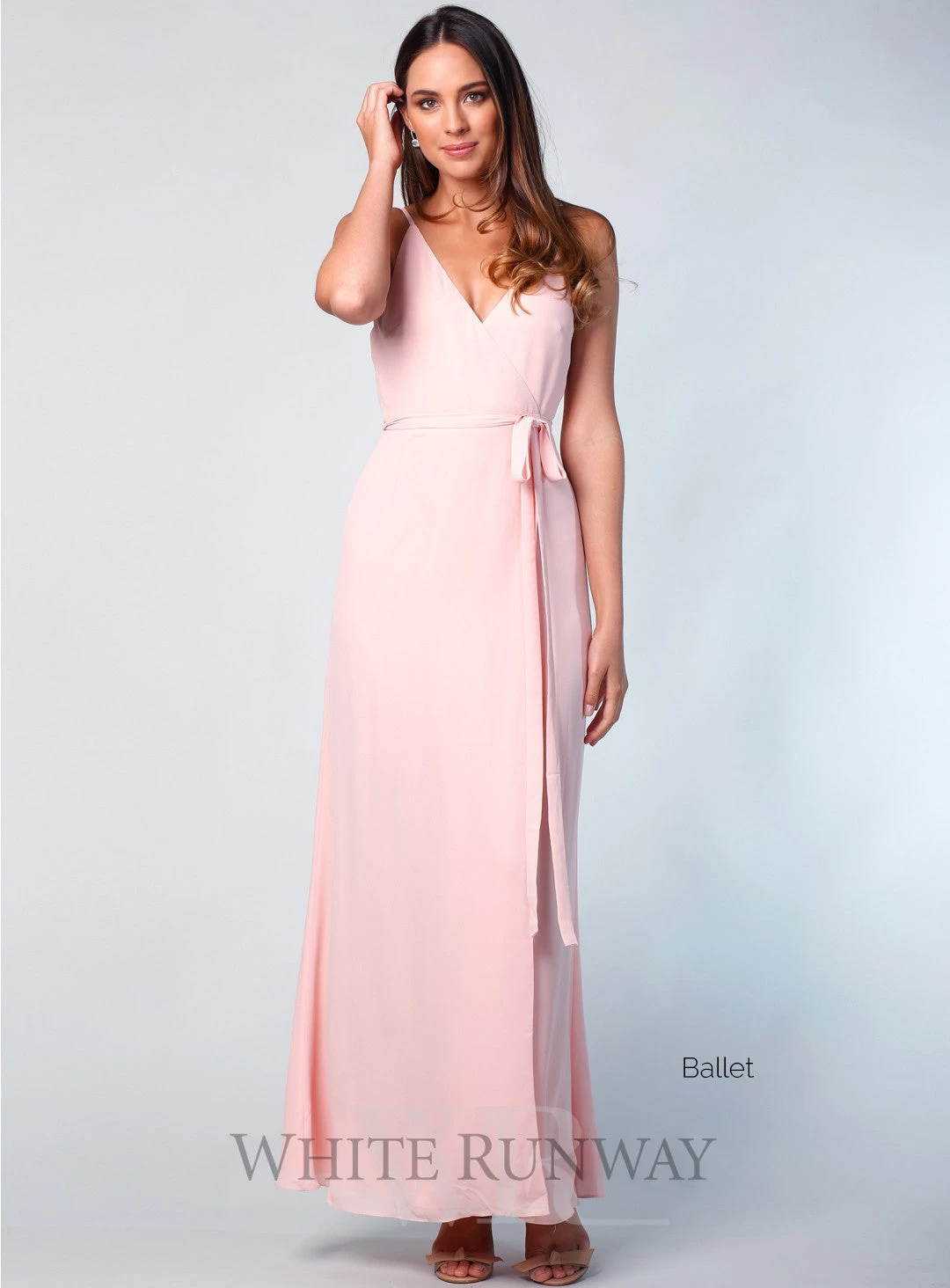 A beautiful full length wrap dress by Samantha Rose. A v-neck style featuring thin straps and self tie at waist.