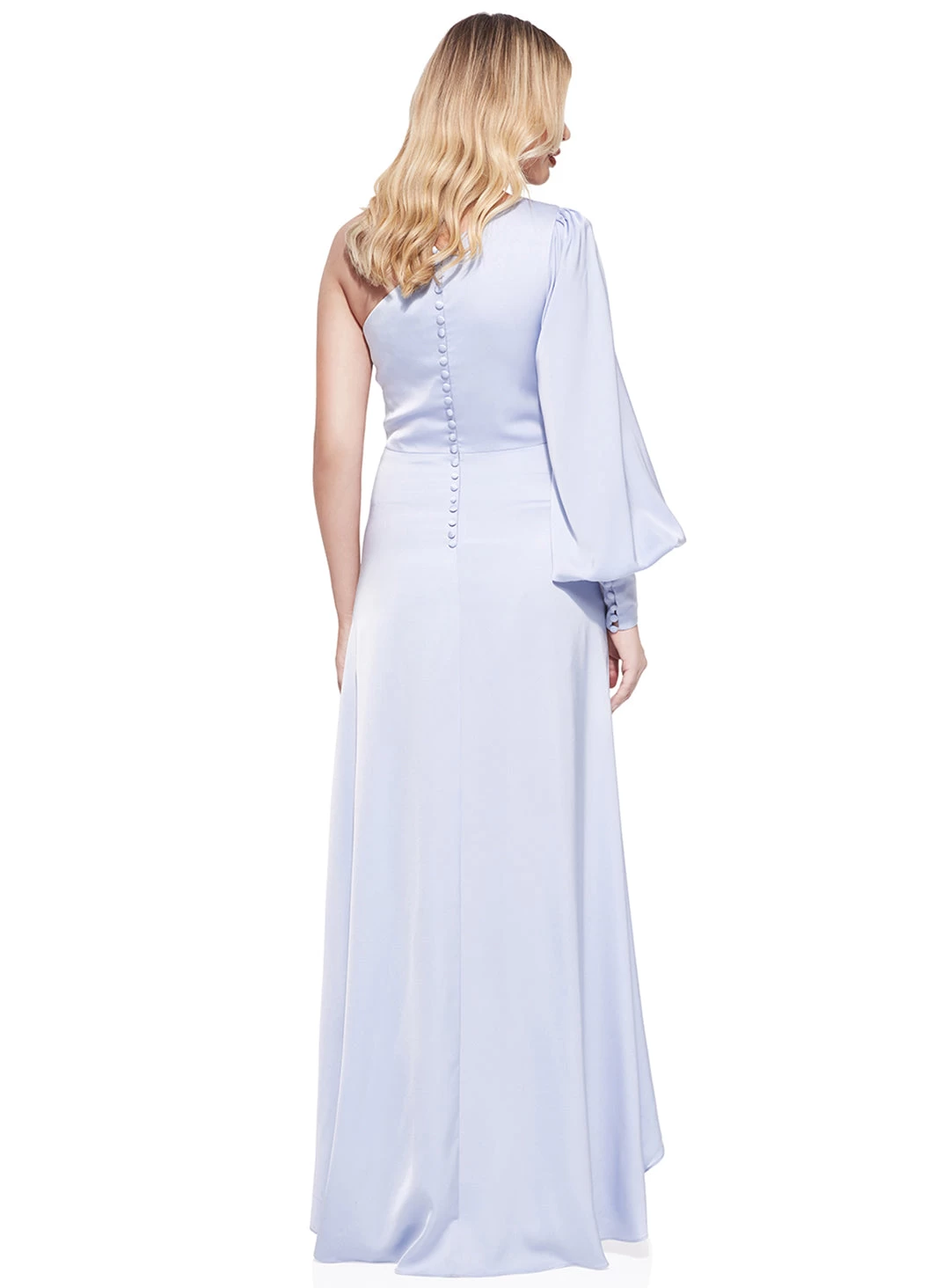 A stunning gown by Sofia Cali. A luxe satin style featuring one sleeve, a ruched bodice and a floor length wrap style skirt.