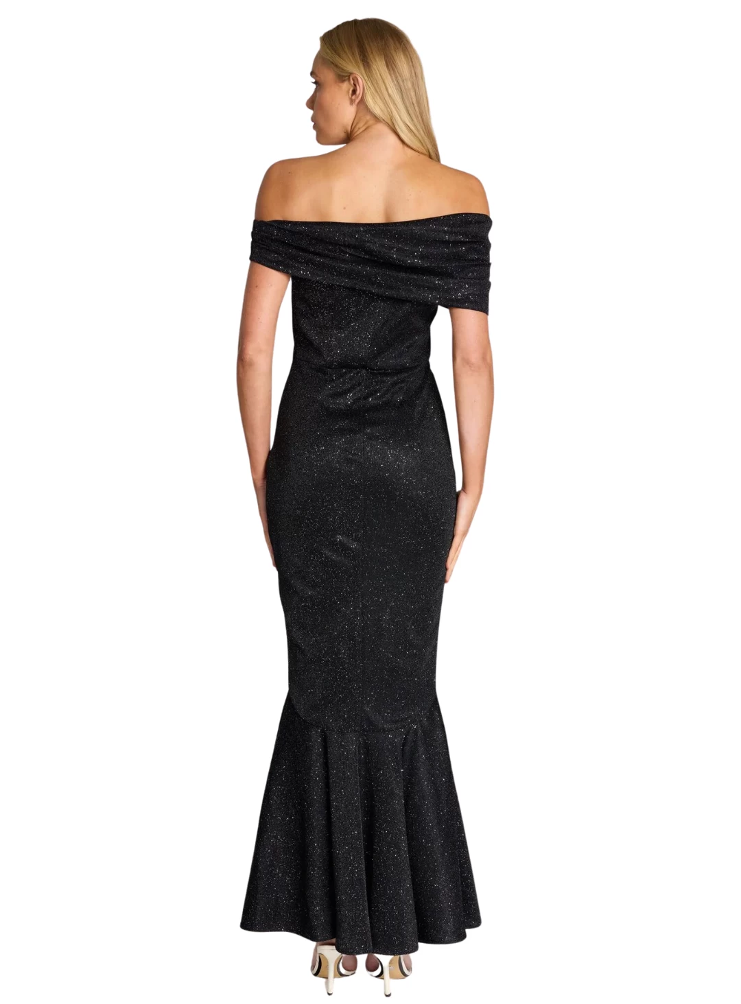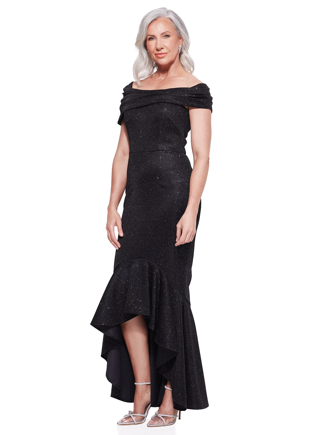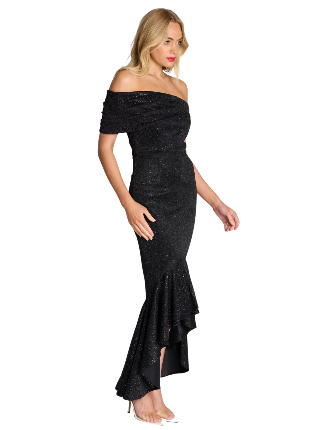 A stunning maxi dress by Romance the Label. An off shoulder design featuring asymmetrical cap sleeves and a mermaid hem.
