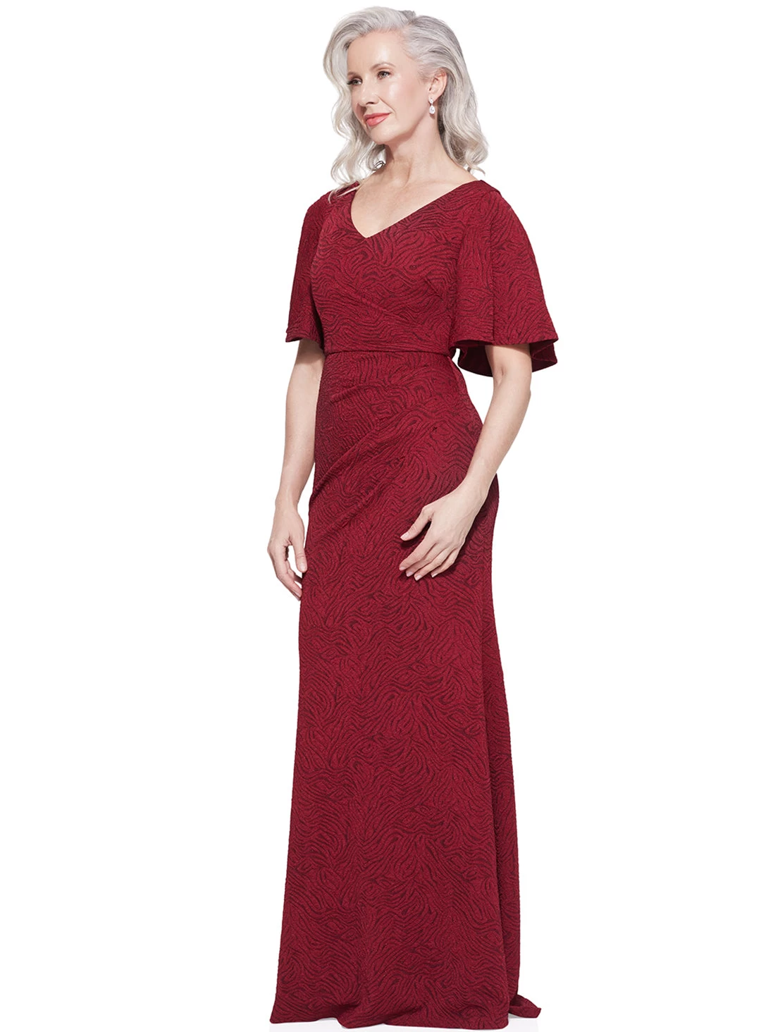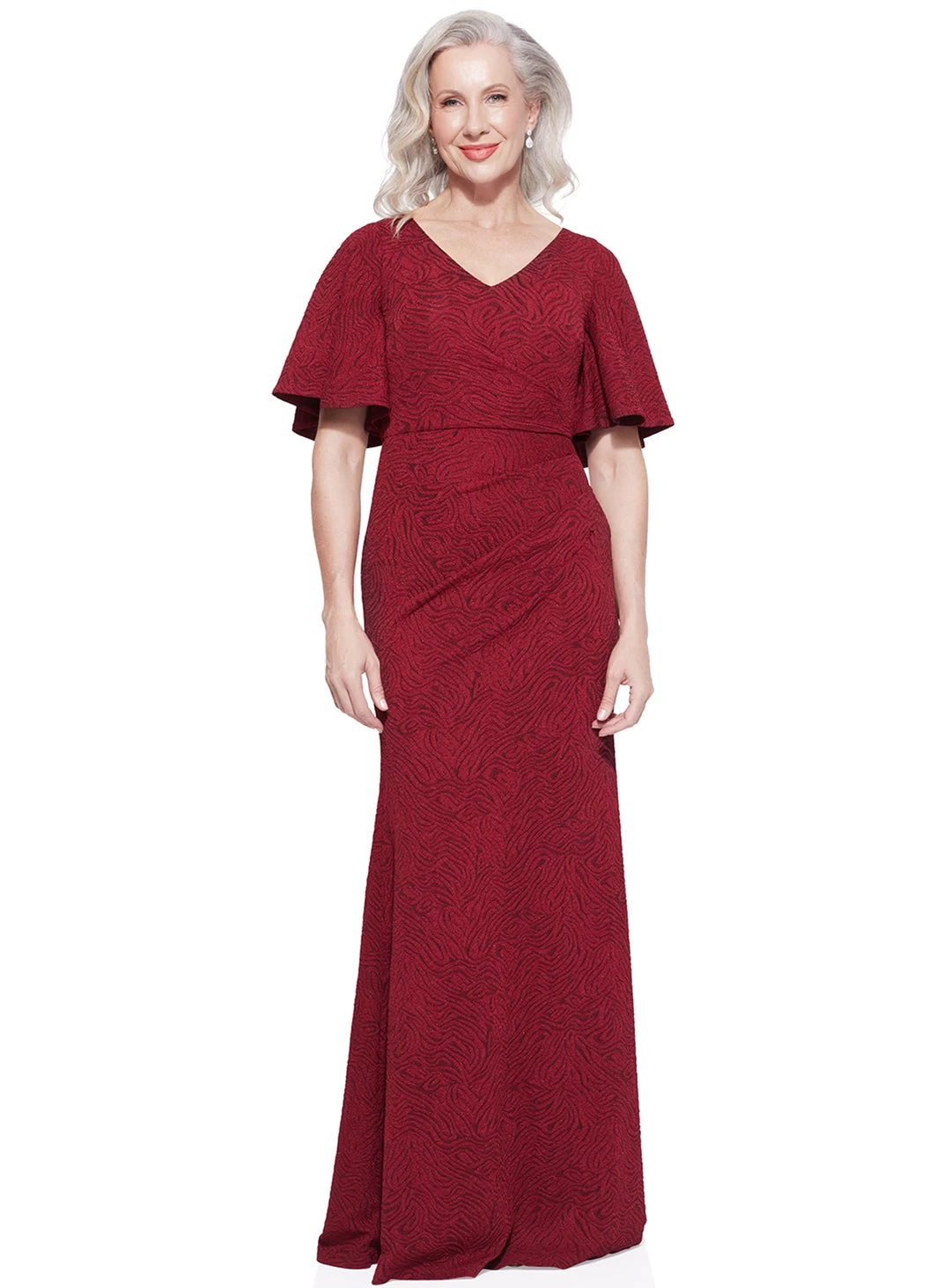 A stunning gown by Trellis Lane. A flattering style featuring an asymmetric neckline, ruching and flared cap sleeves.