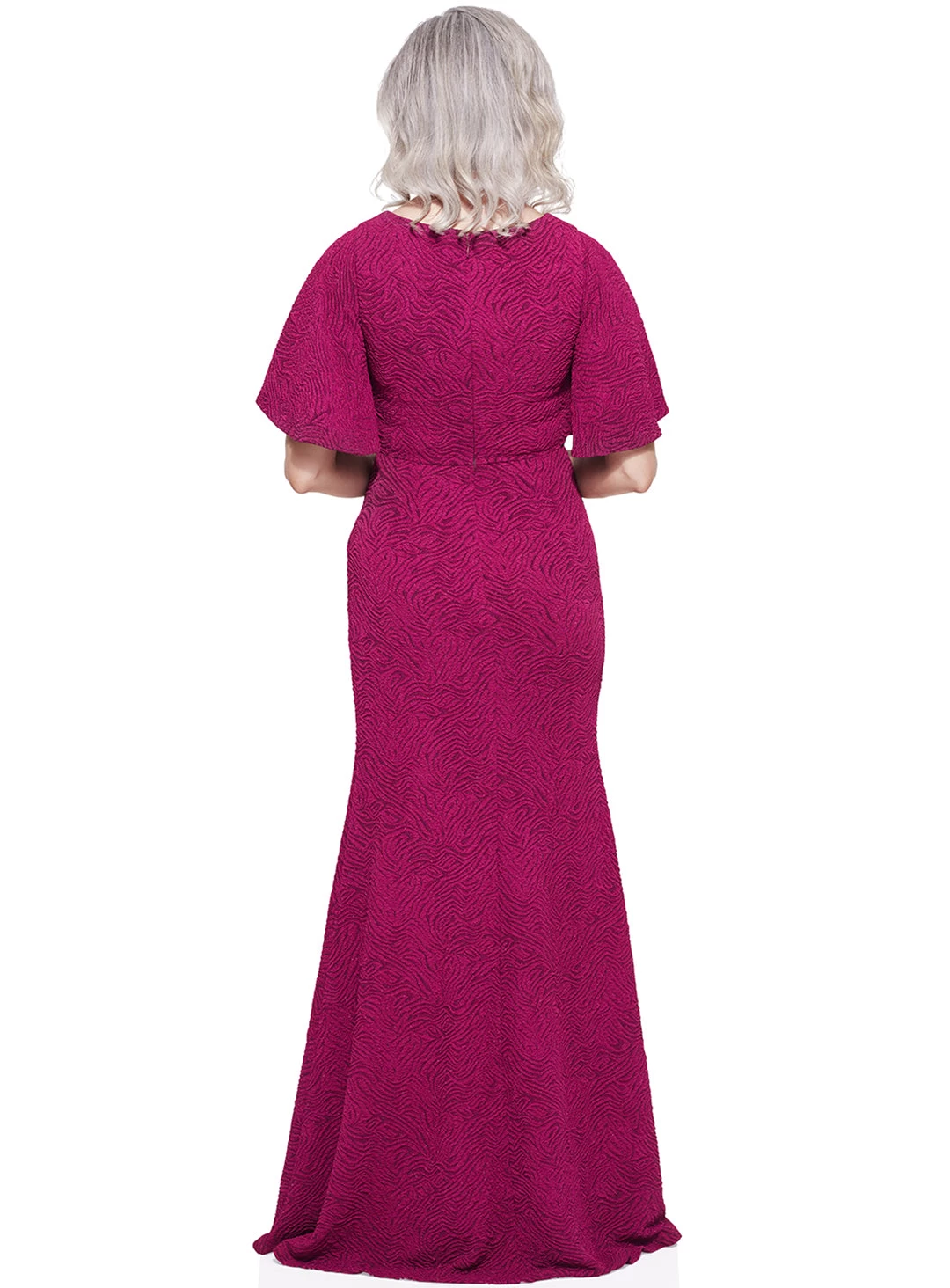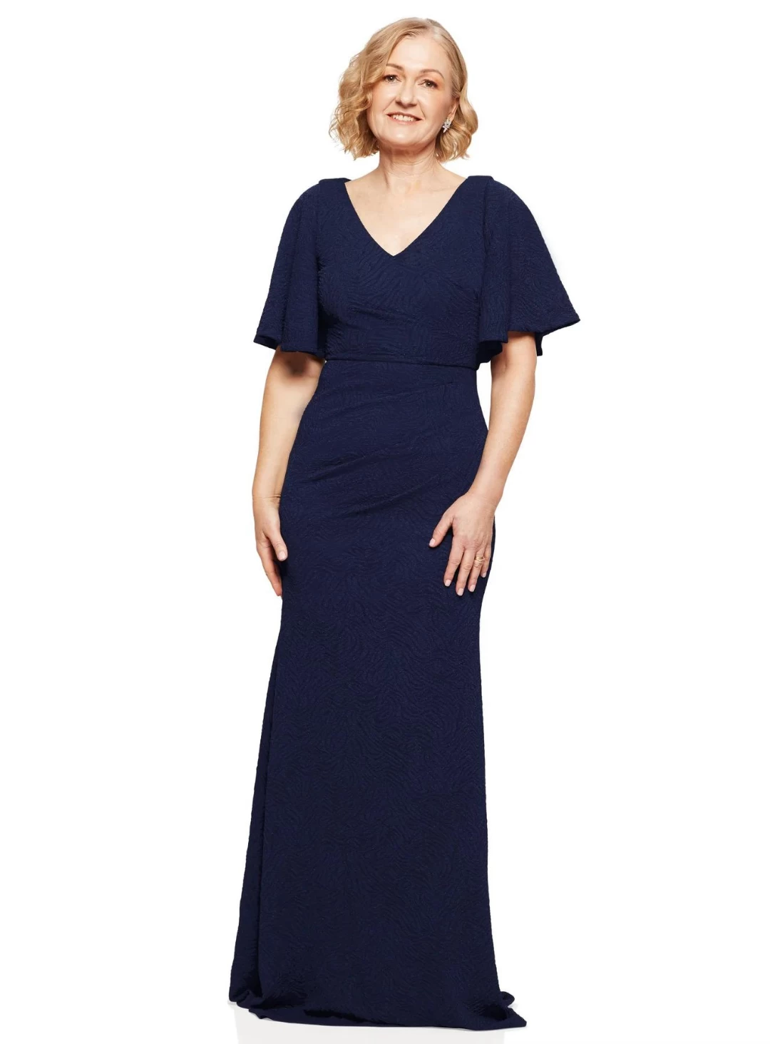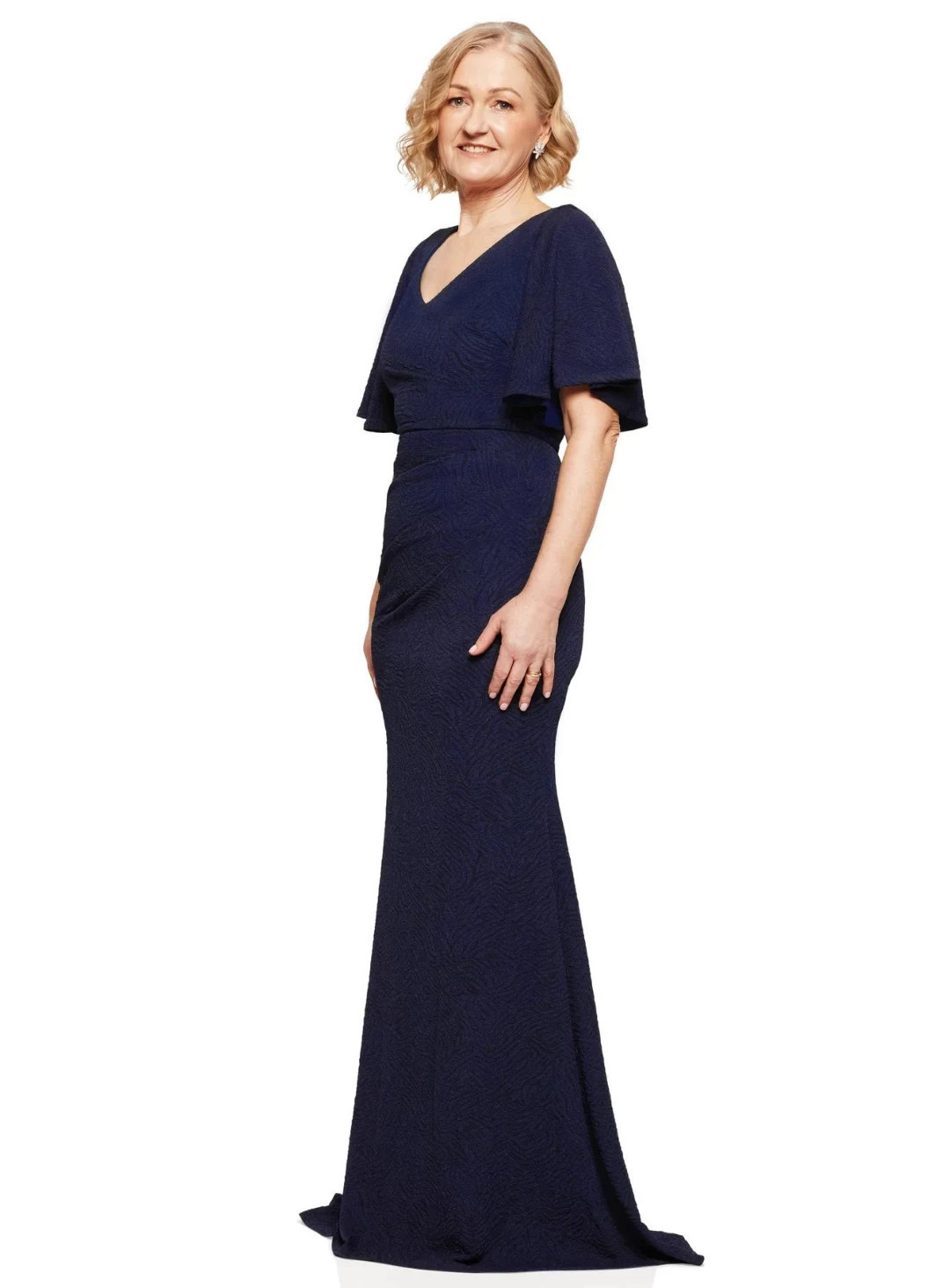 A stunning gown by Trellis Lane. A flattering style featuring an asymmetric neckline, ruching and flared cap sleeves.