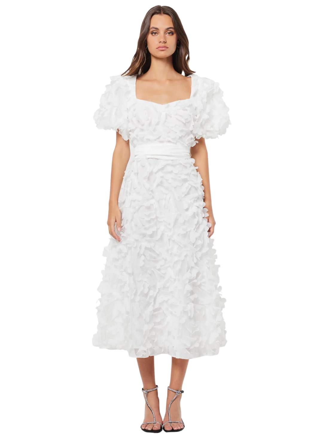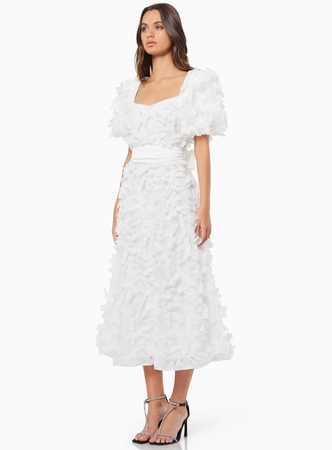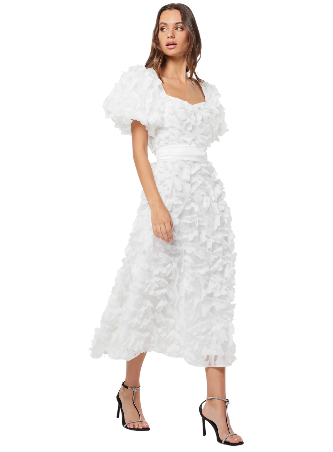 The Cathy Dress is a stunning midi length dress by Elliatt. Crafted from 3D rosette fabrication, this stylish frock features puff sleeves and flared skirt.