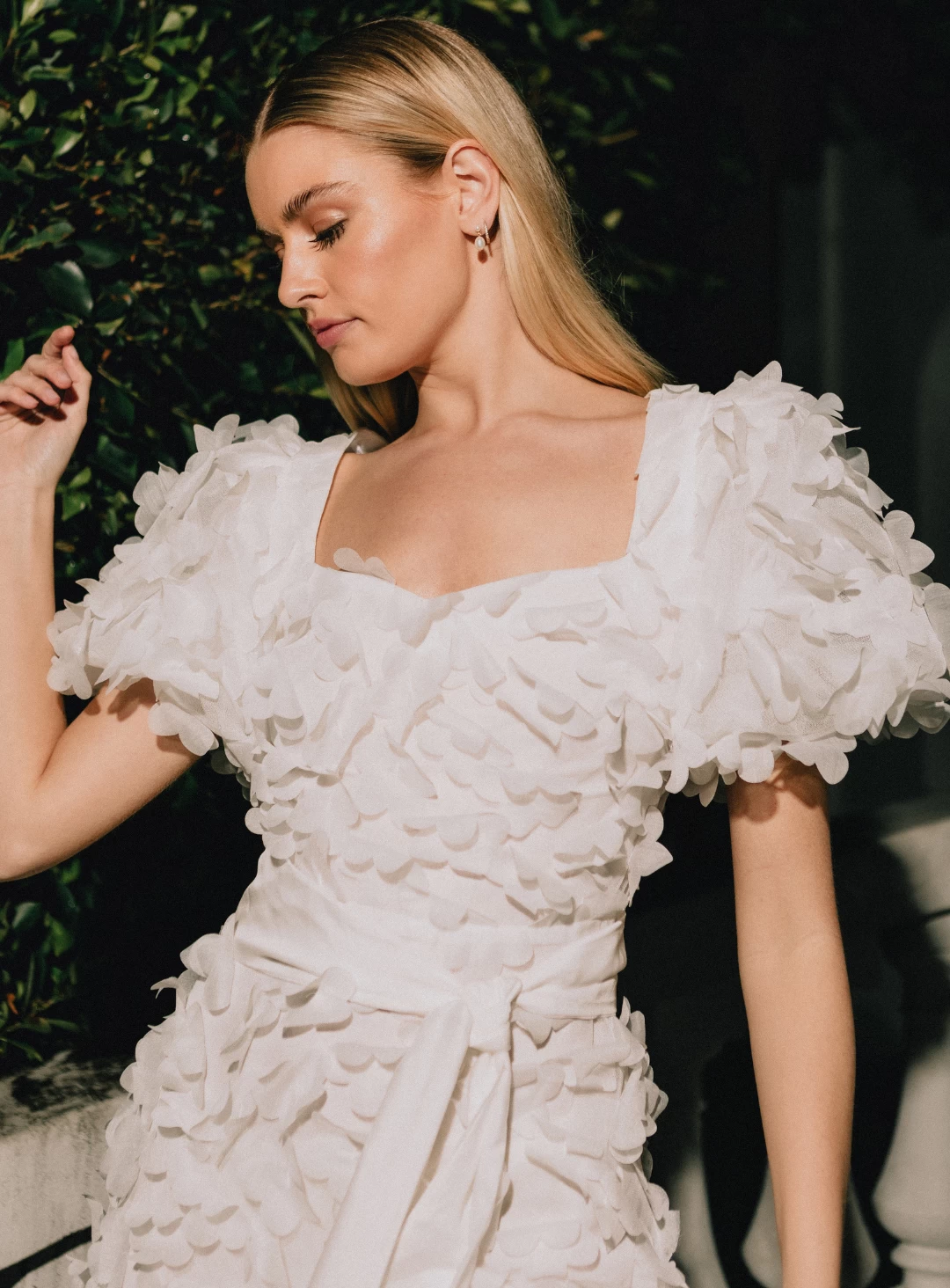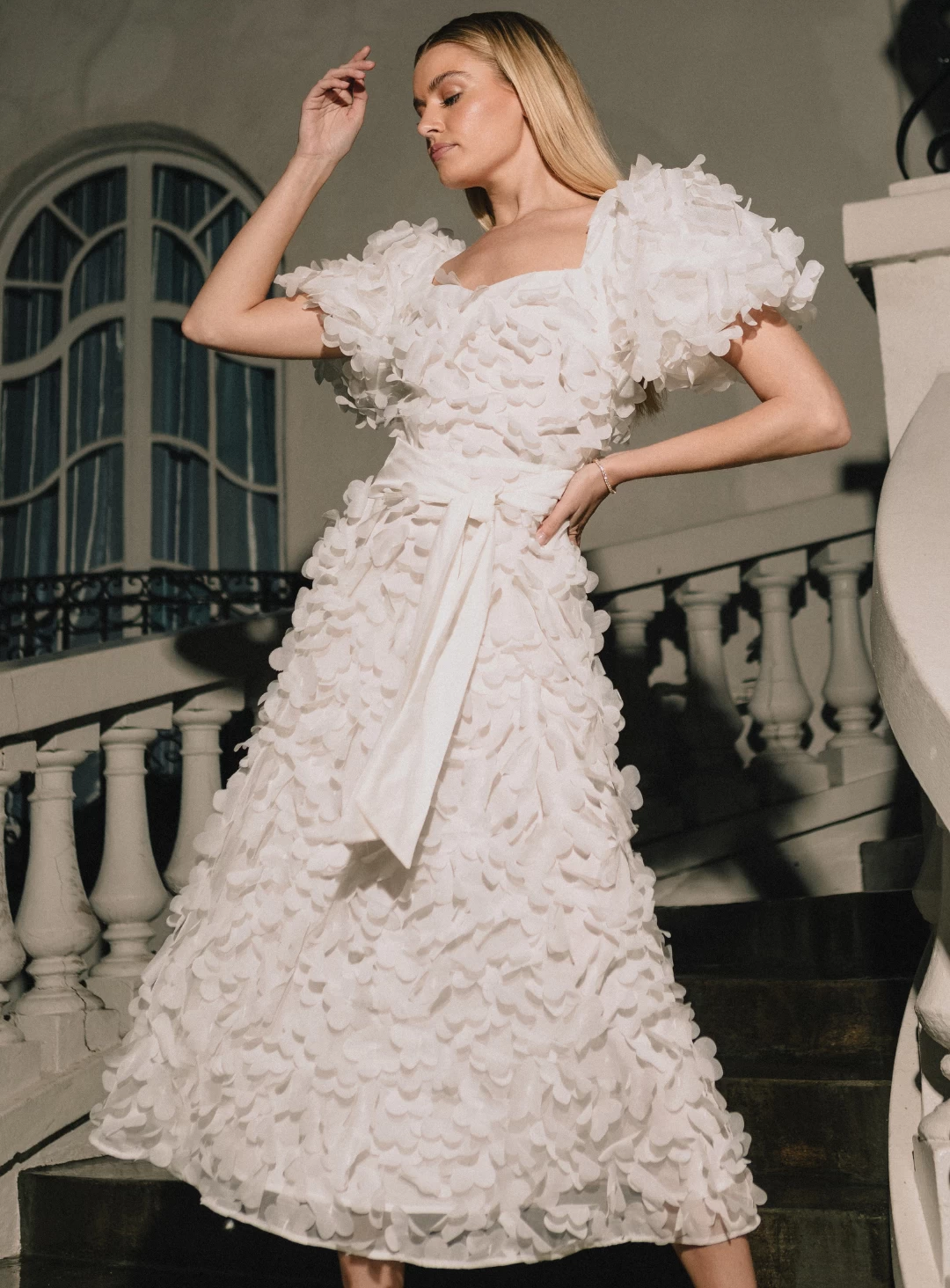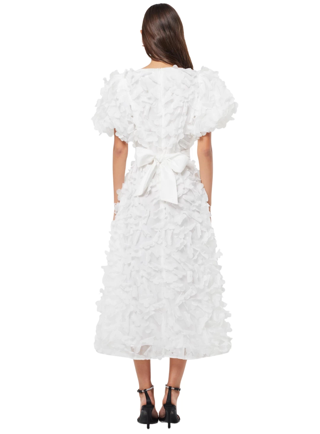 The Cathy Dress is a stunning midi length dress by Elliatt. Crafted from 3D rosette fabrication, this stylish frock features puff sleeves and flared skirt.