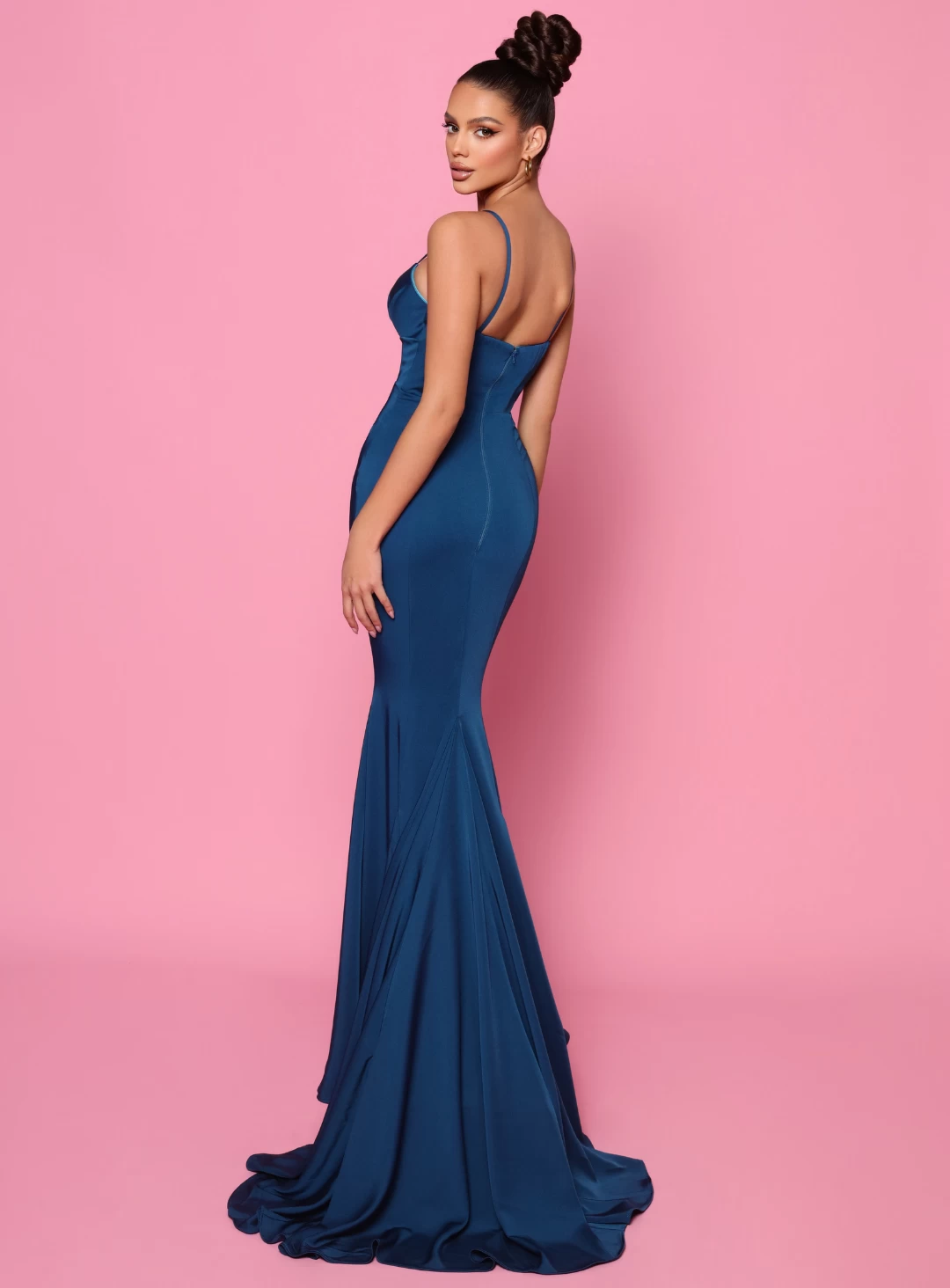 The Celine dress is a stunning full-length dress by Nicoletta NP146. A mermaid-style dress featuring spaghetti straps, a mesh insert, and a floor-sweeping train.
