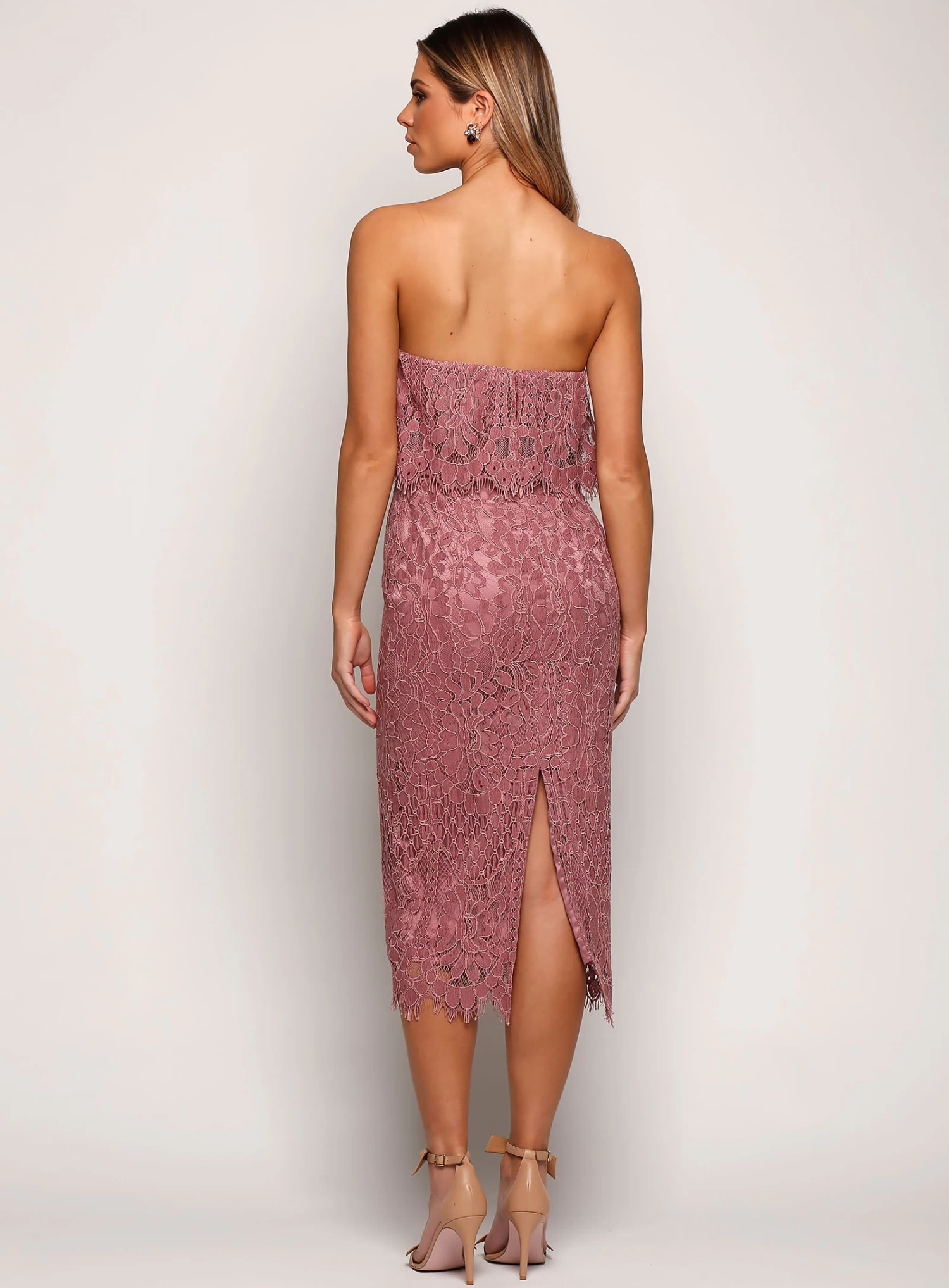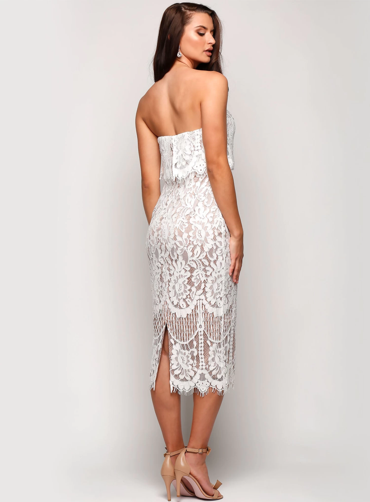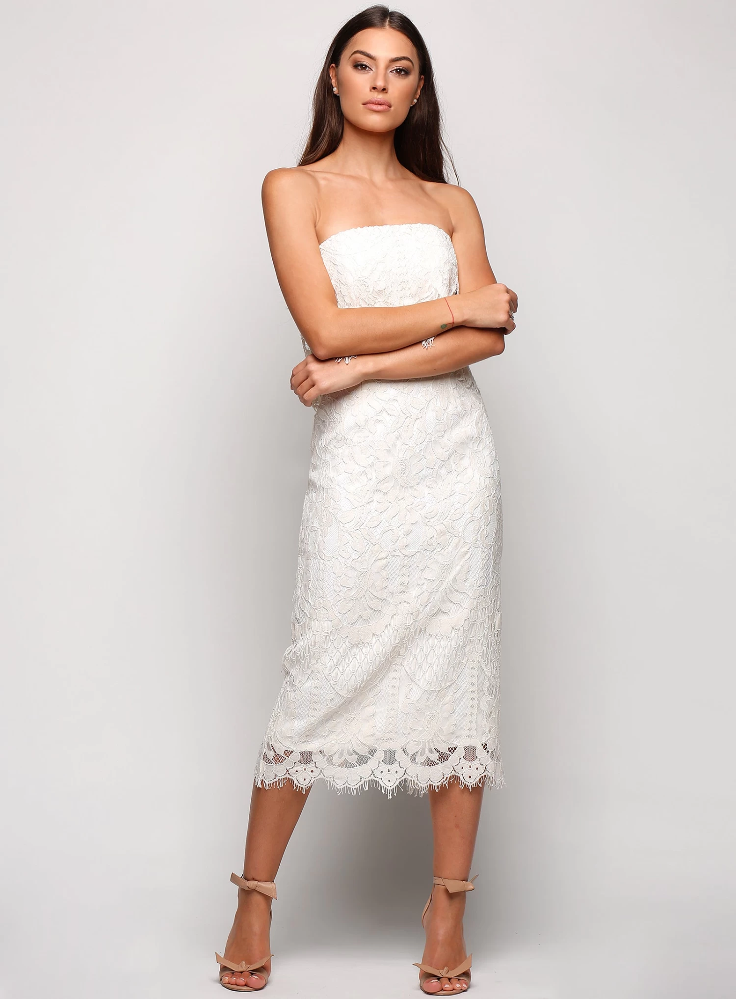 A gorgeous midi dress by Samantha Rose. A lace strapless style featuring a sheer lace bust overlay and eyelash scalloped edging along the overlay and hem.