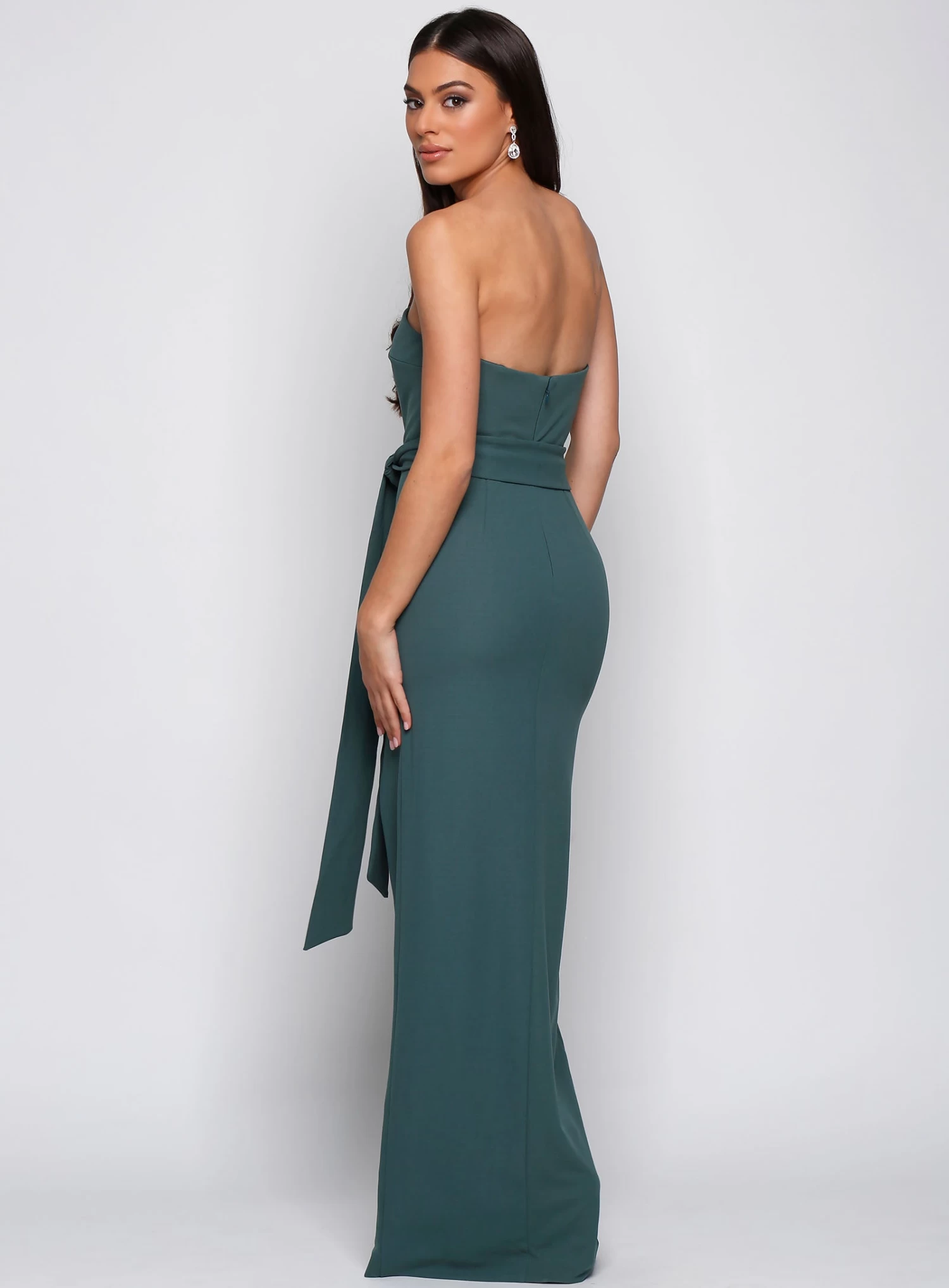 A stunning full length dress by Samantha Rose. Made from a luxe jersey crepe material and features a strapless neckline with boning in the bodice and a thigh high side split.