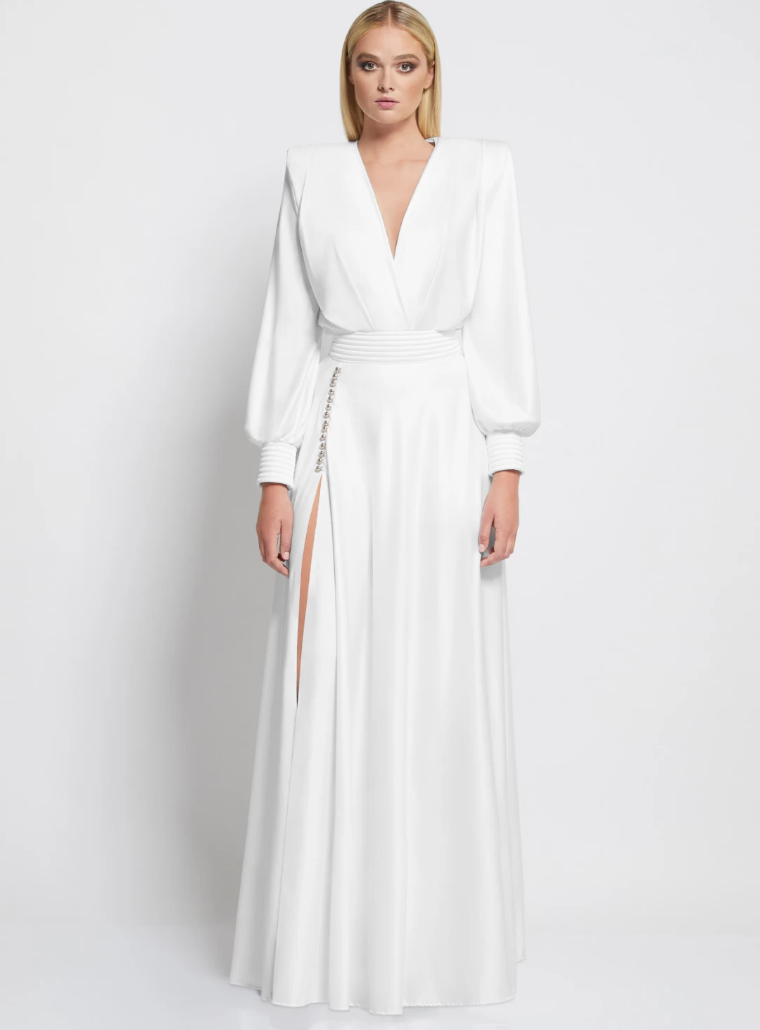A gorgeous gown by Zhivago. A bias cut full length gown with billowed sleeves, satin paneling and front split with button and loop closures.