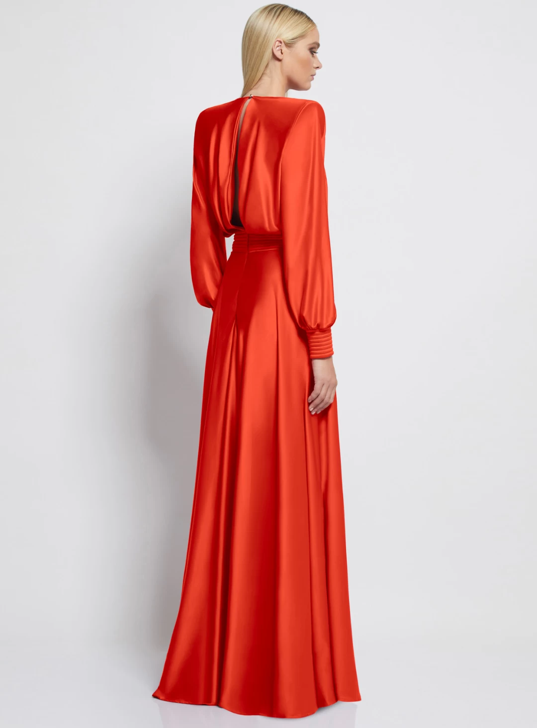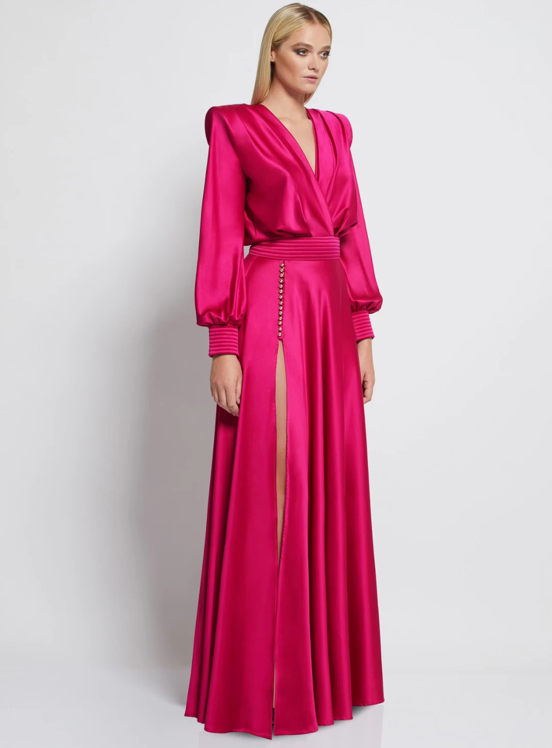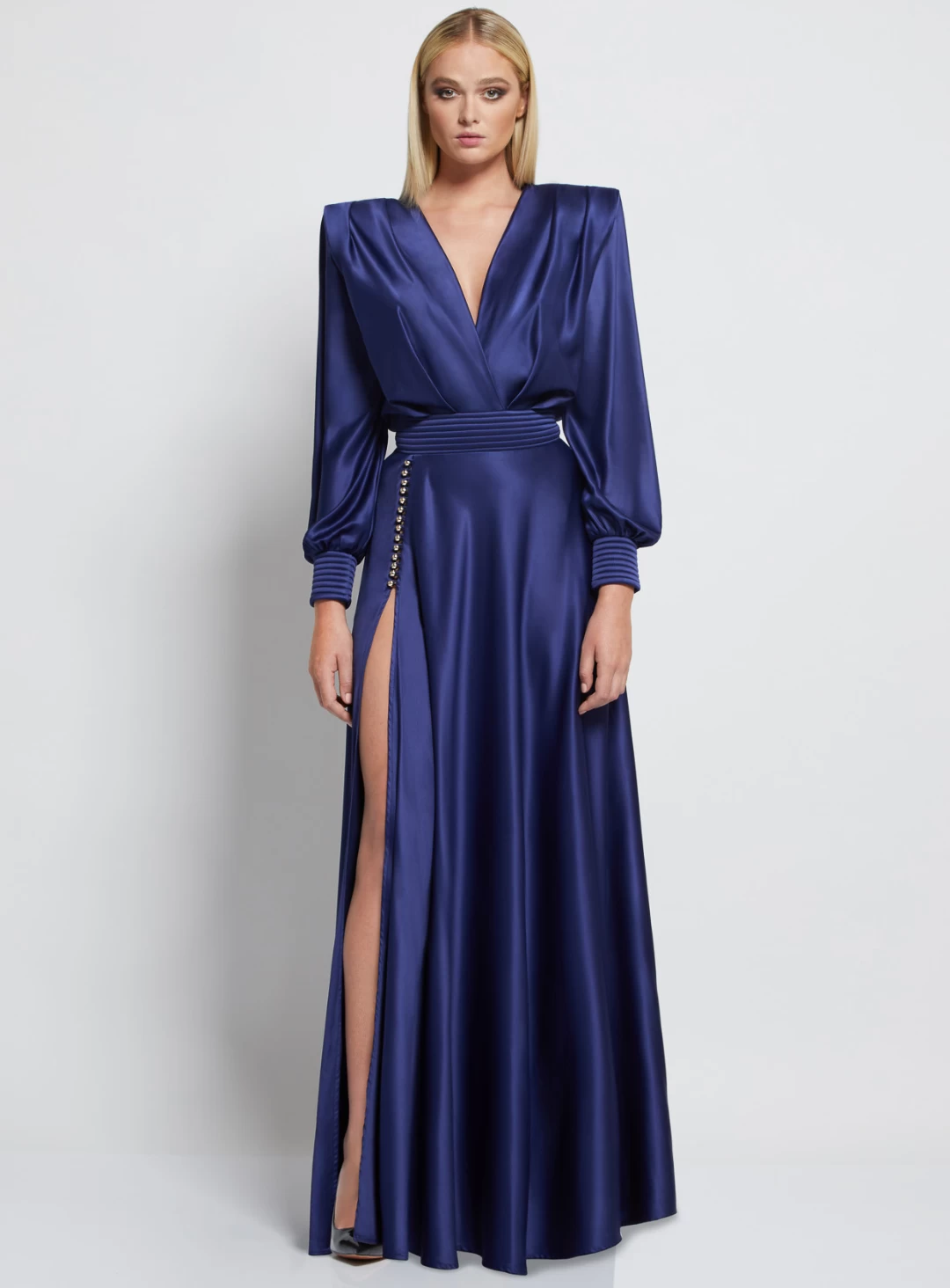 A gorgeous gown by Zhivago. A bias cut full length gown with billowed sleeves, satin paneling and front split with button and loop closures.