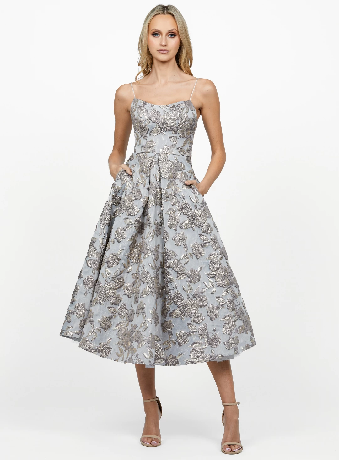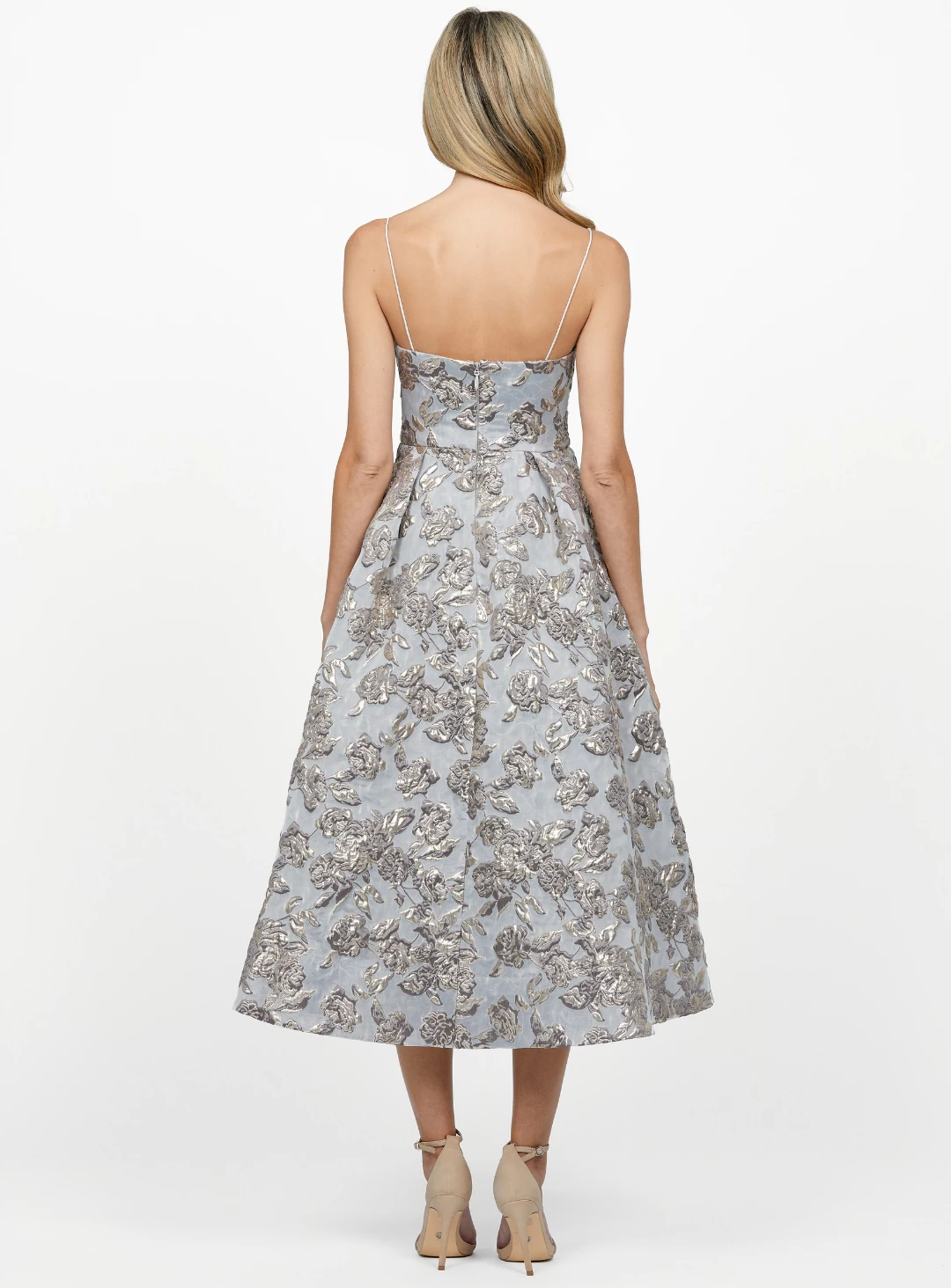 A stunning midi-length dress by Bariano. Crafted from a non-stretch jacquard fabric, features a scooped neckline with thin straps and an A-line flared skirt.