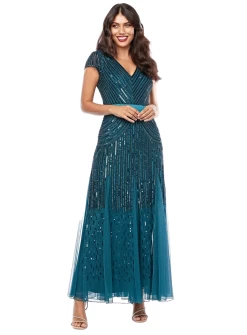 An elegant full length dress by Zaliea. A beautiful style featuring an embellished pattern and cap sleeves.