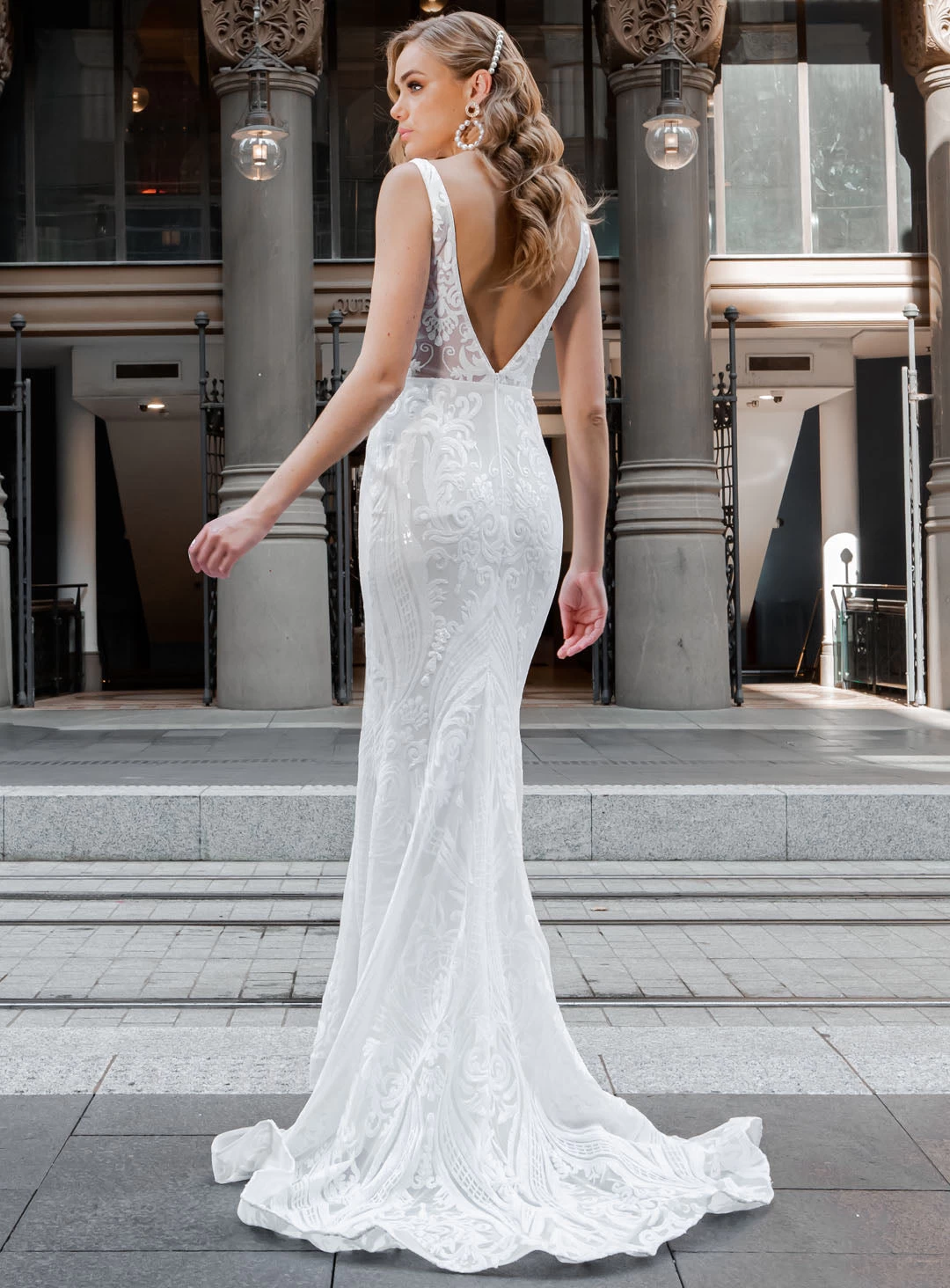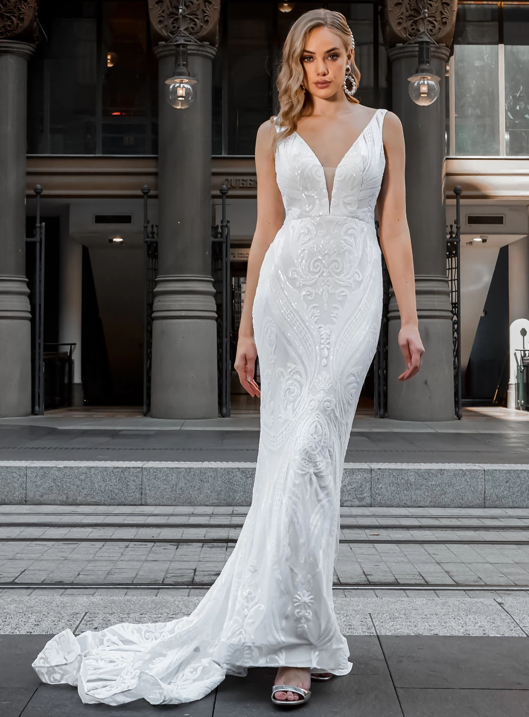 A stunning bridal gown by Tina Holly. A v-neck style featuring a symmetrical sequin lace and plunging neckline with mesh.