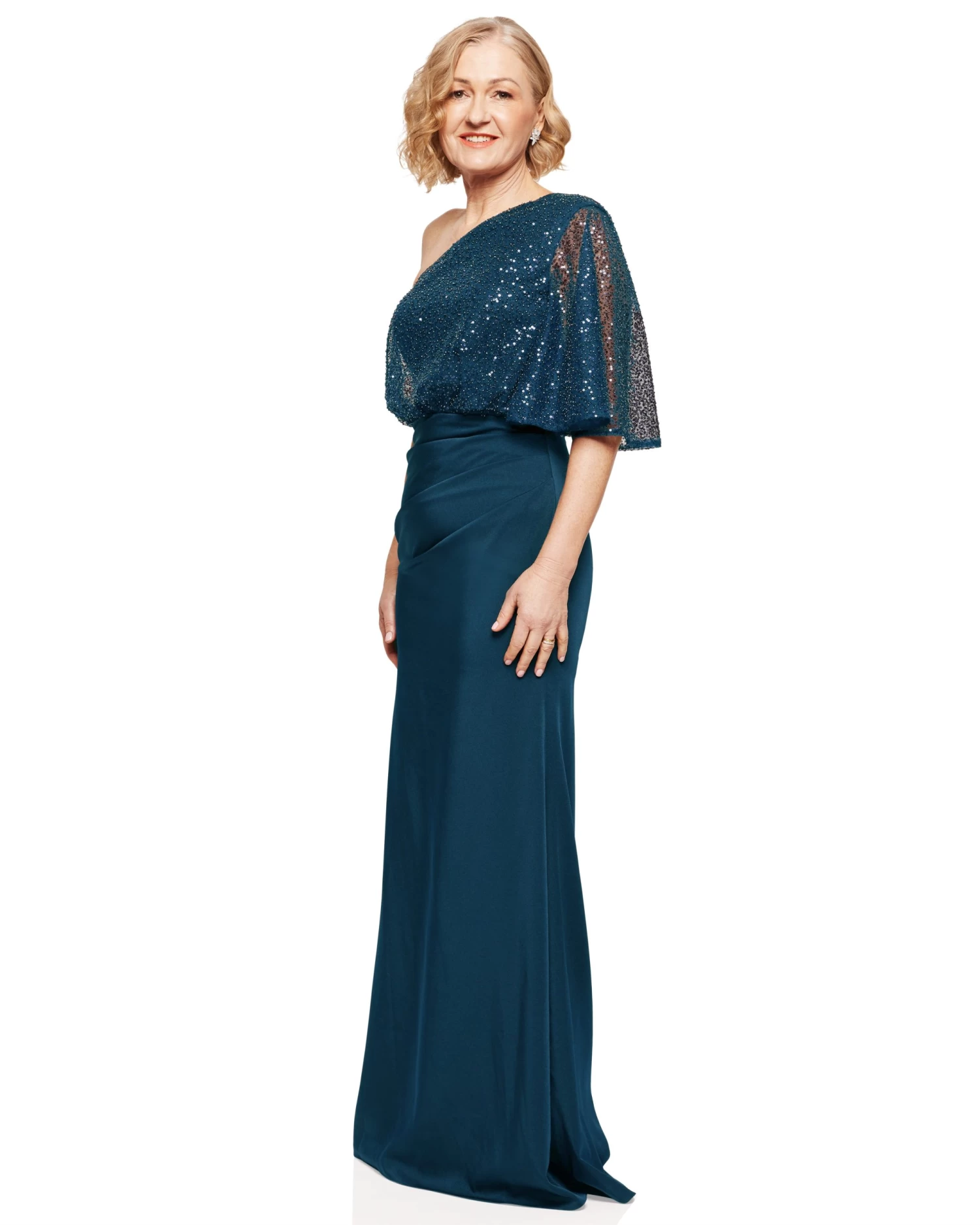 A gorgeous full length dress by Trellis Lane. A one shoulder design featuring a blouson beaded bodice with sheer sleeve. Skirt is made from a woven satin crepe with flattering ruched details.