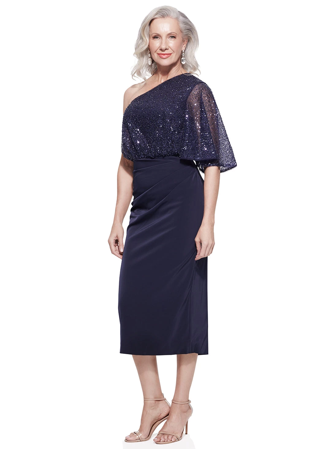 A gorgeous midi length dress by Trellis Lane. A one shoulder design featuring a blouson beaded bodice with sheer sleeve. Skirt is made from a woven satin crepe with flattering ruched details.