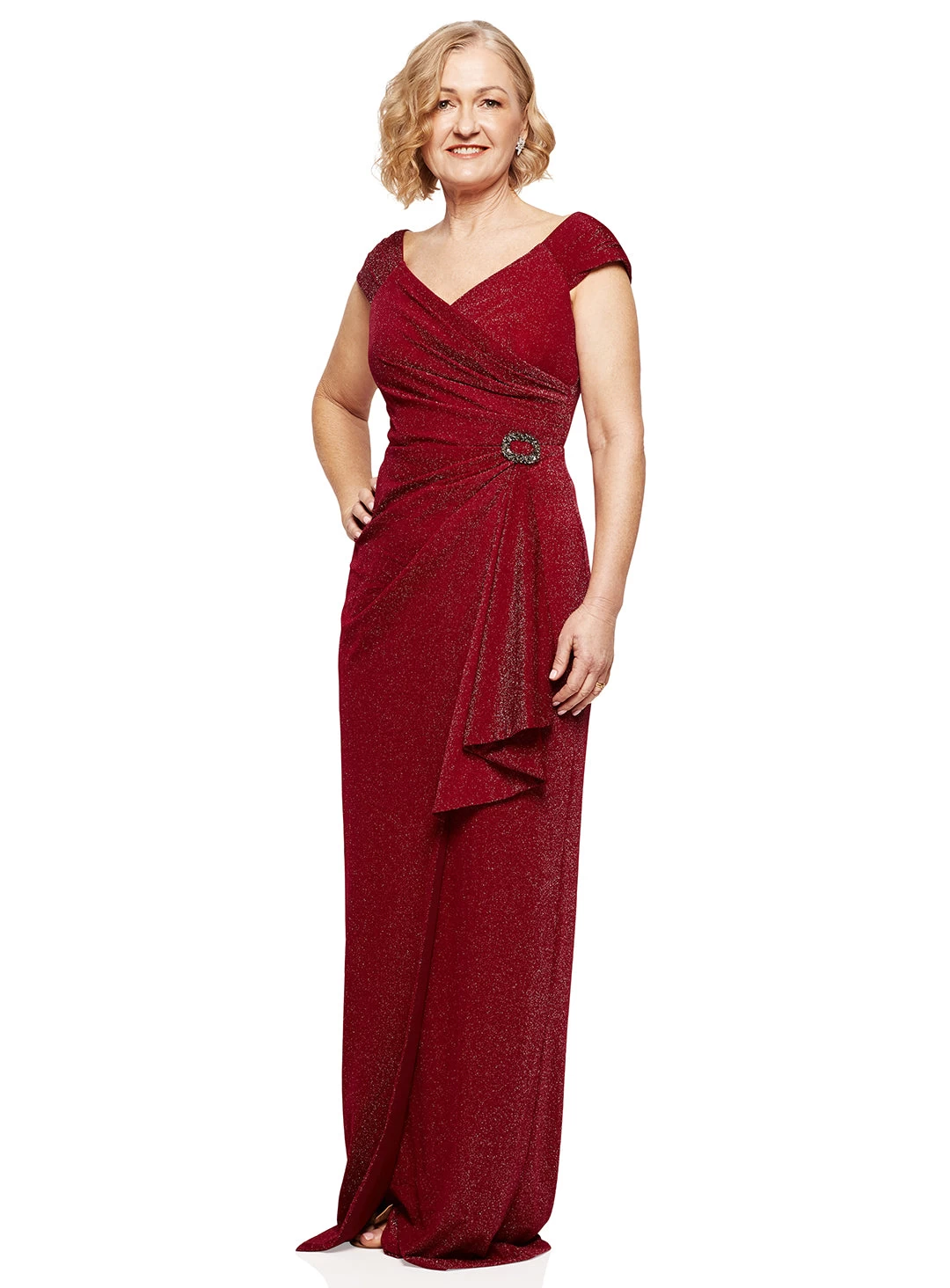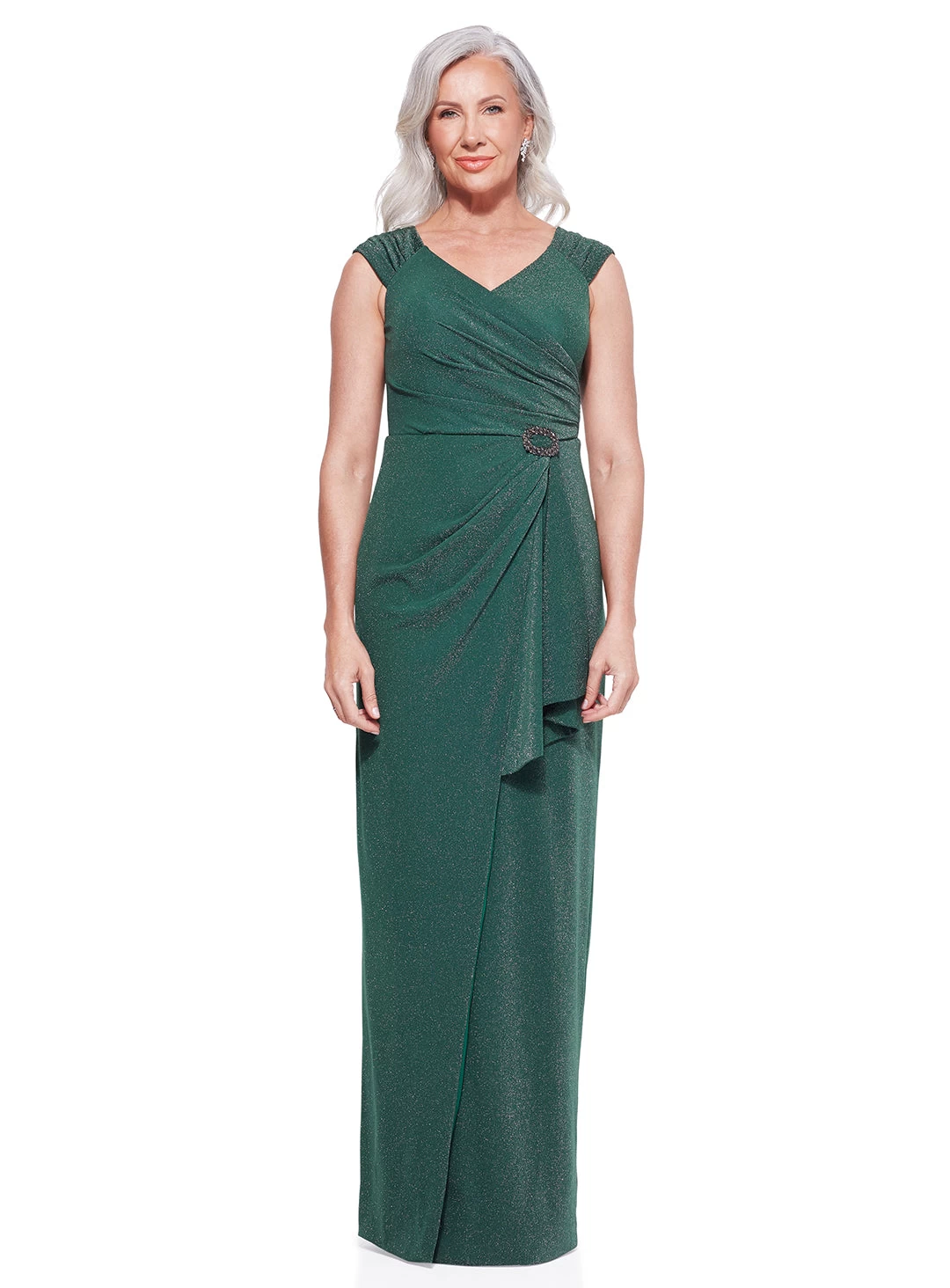 A gorgeous gown by Trellis Lane. An off shoulder design with cap sleeves and elegant ruching at the waist.