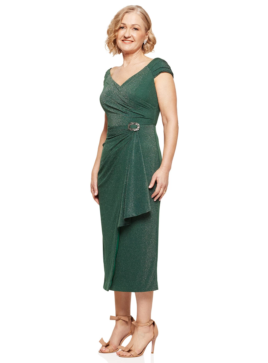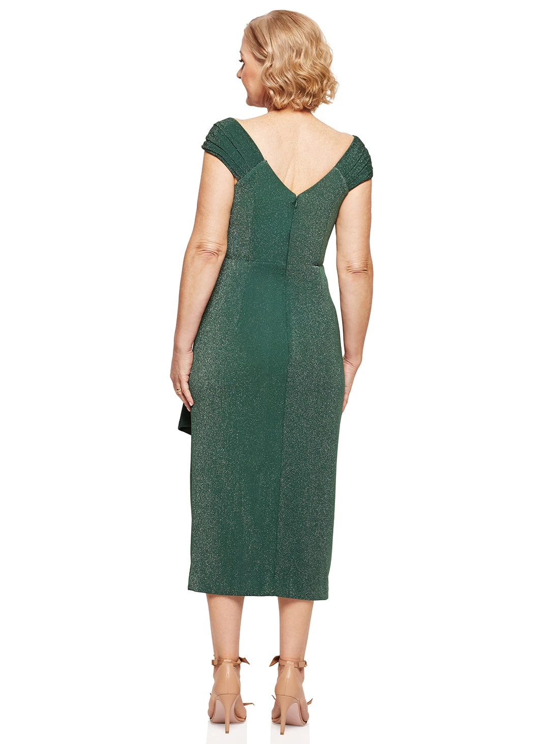 A gorgeous midi dress by Trellis Lane. An off shoulder design with cap sleeves and elegant ruching at the waist.