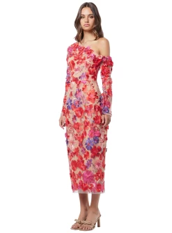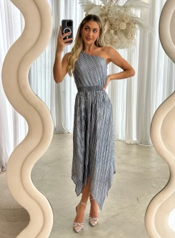 A gorgeous hi-lo length dress by Trellis Lane. A maxi style crafted from a net mesh fabric with sequin detailing. Features a fitted bodice with asymmetric neckline and flared a-line skirt.