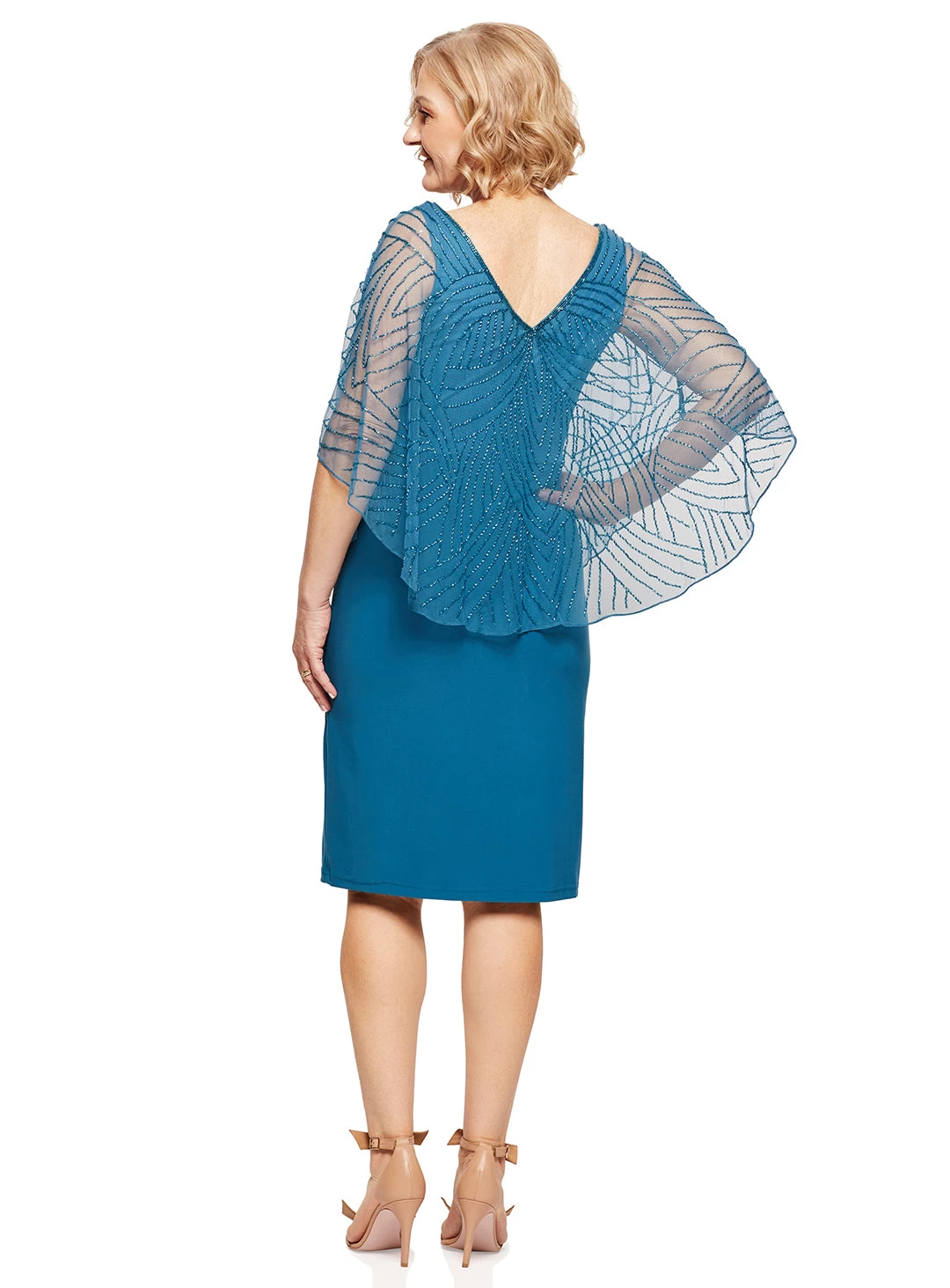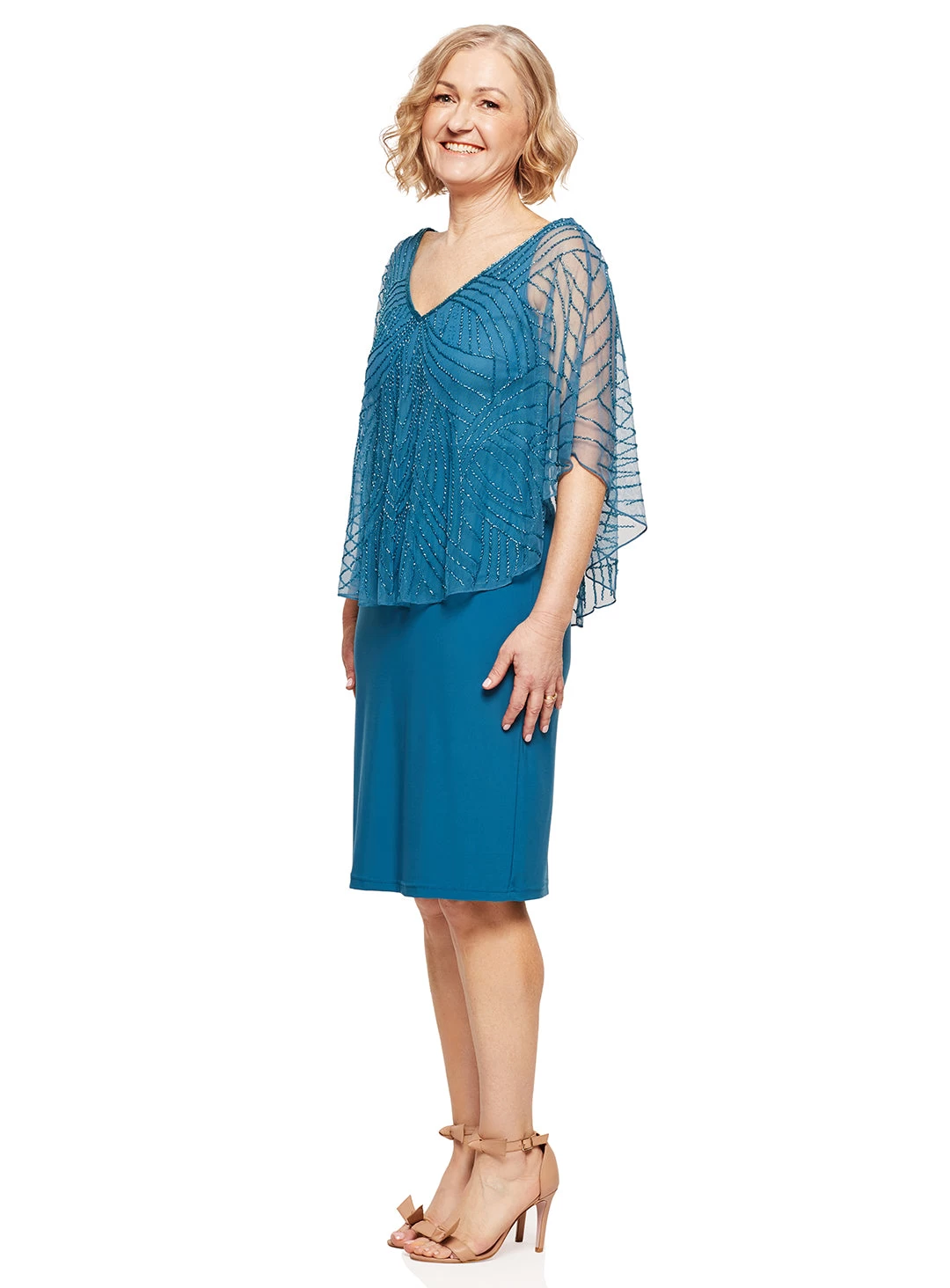 A gorgeous cocktail length dress by Jesse Harper. A fitted jersey dress with sheer beaded overlay.