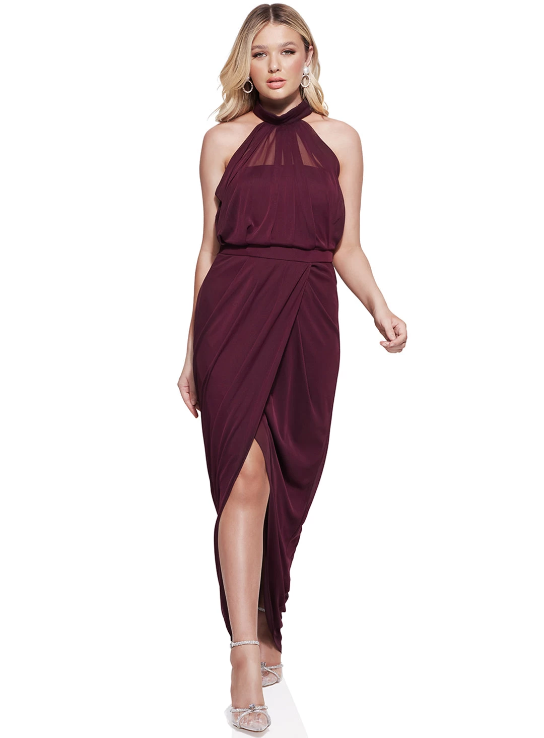 A stunning full length dress by Samantha Rose. A halterneck style featuring a wrap style skirt and front split.