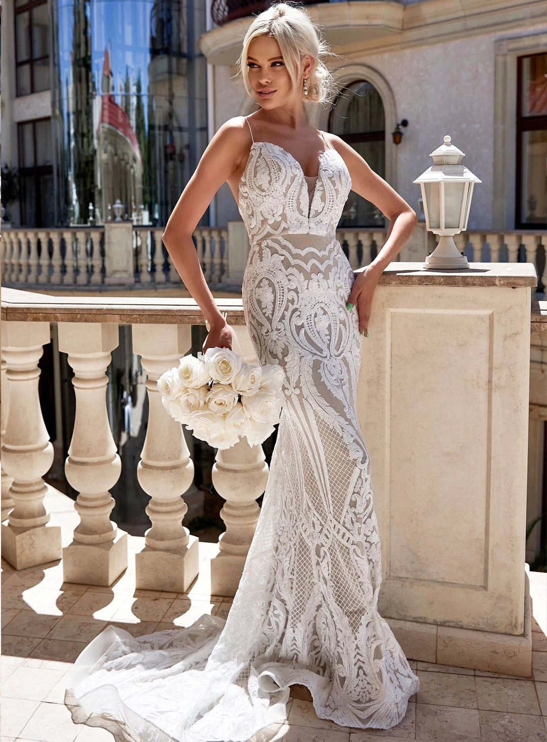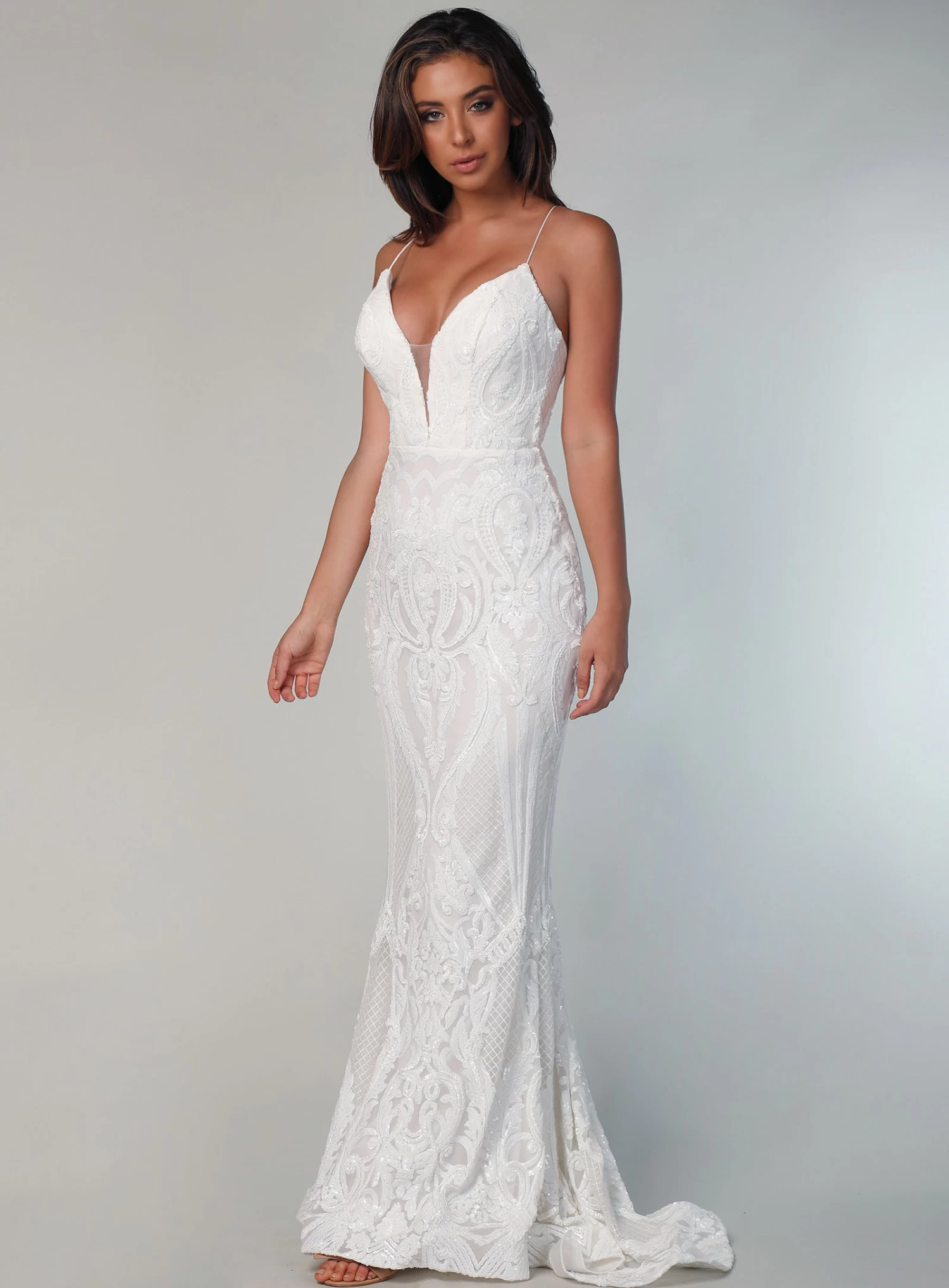 A stunning full length dress by Tina Holly. An intricately sequinned style featuring a deep neckline with bust mesh insert and low back.