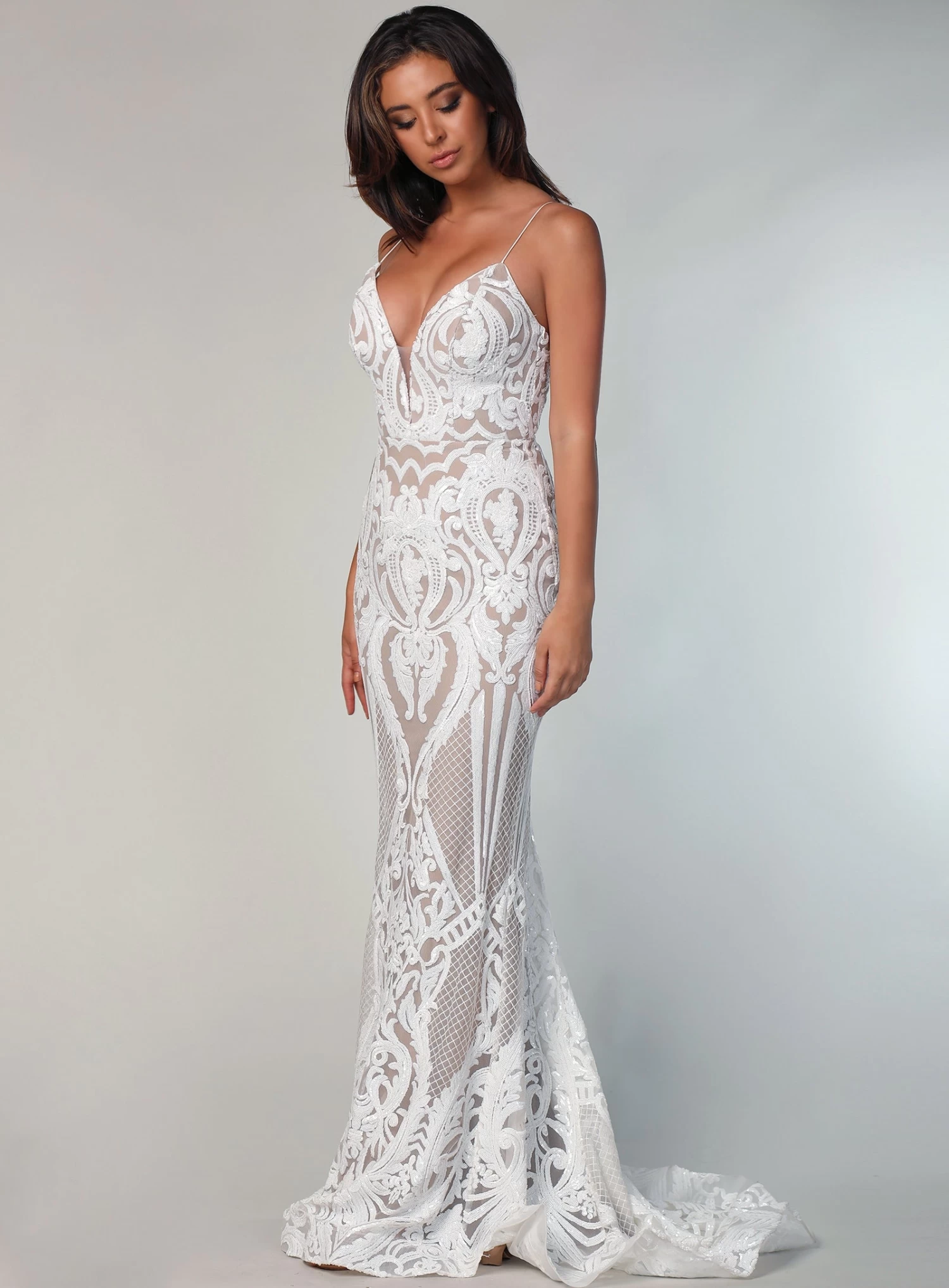 Due to the nature of the fabric, placement of the sequins & mesh panels may differ with each dress.