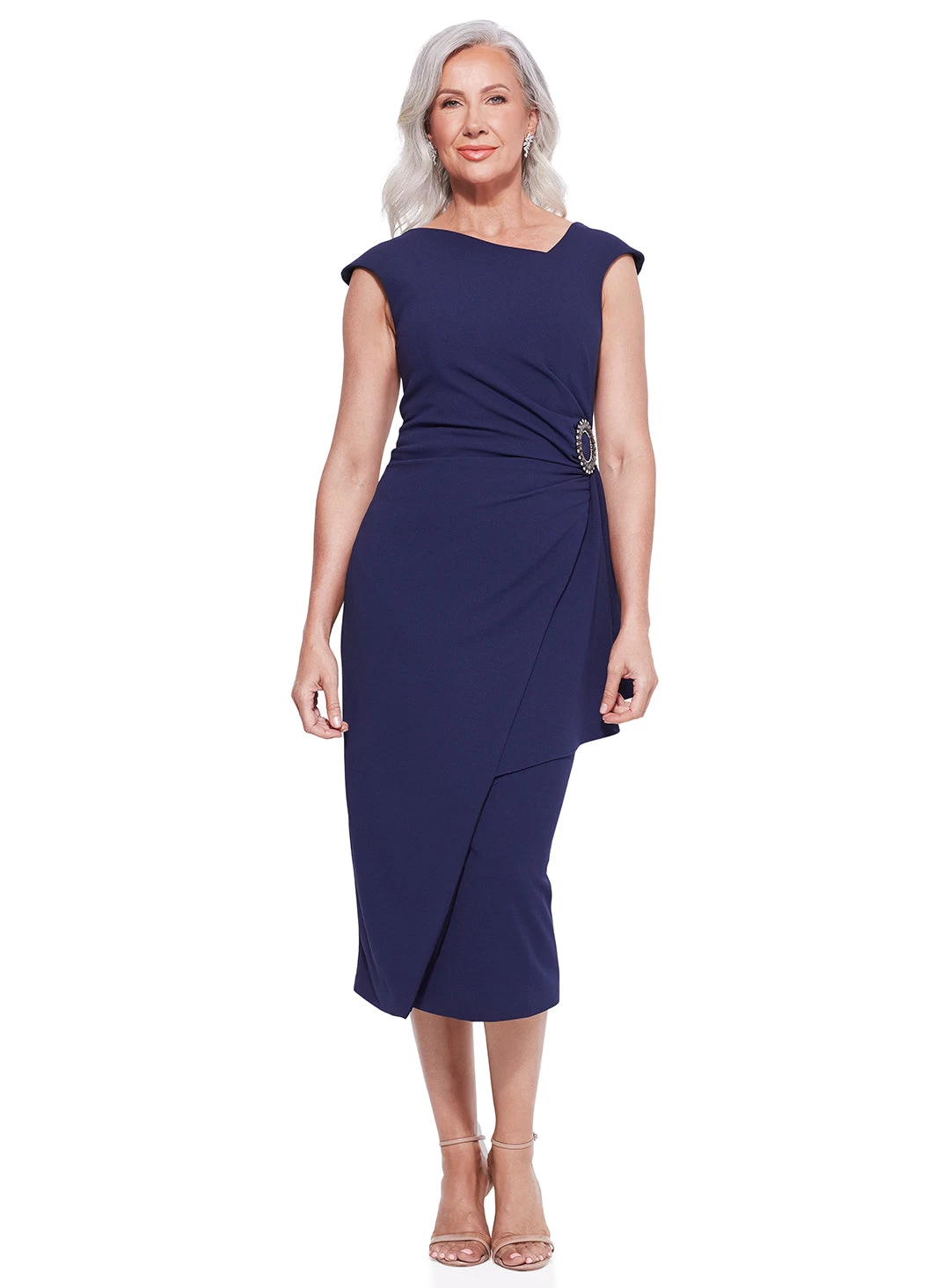 A gorgeous midi dress by Trellis Lane. A flattering style featuring an asymmetrical neckline and ruching on the waist.